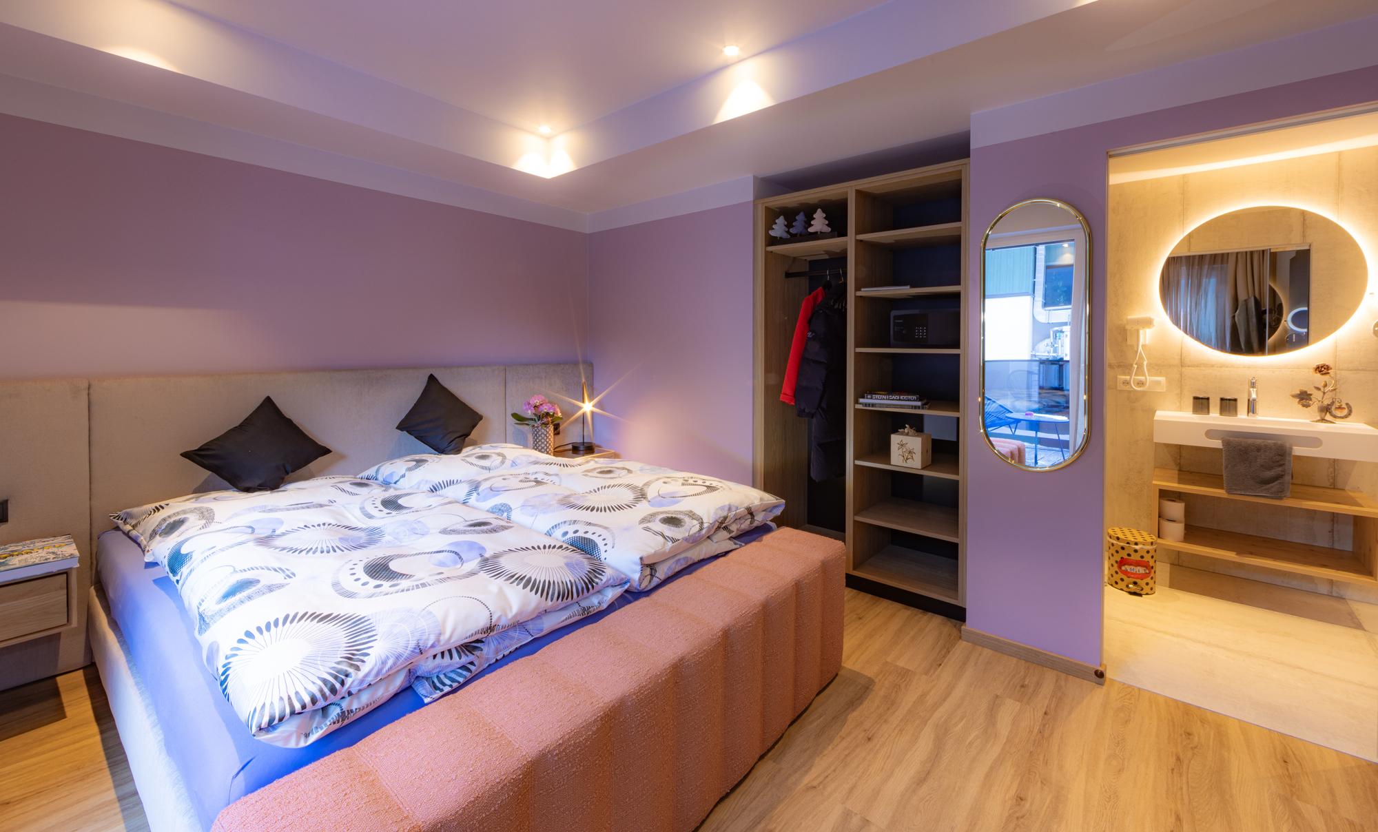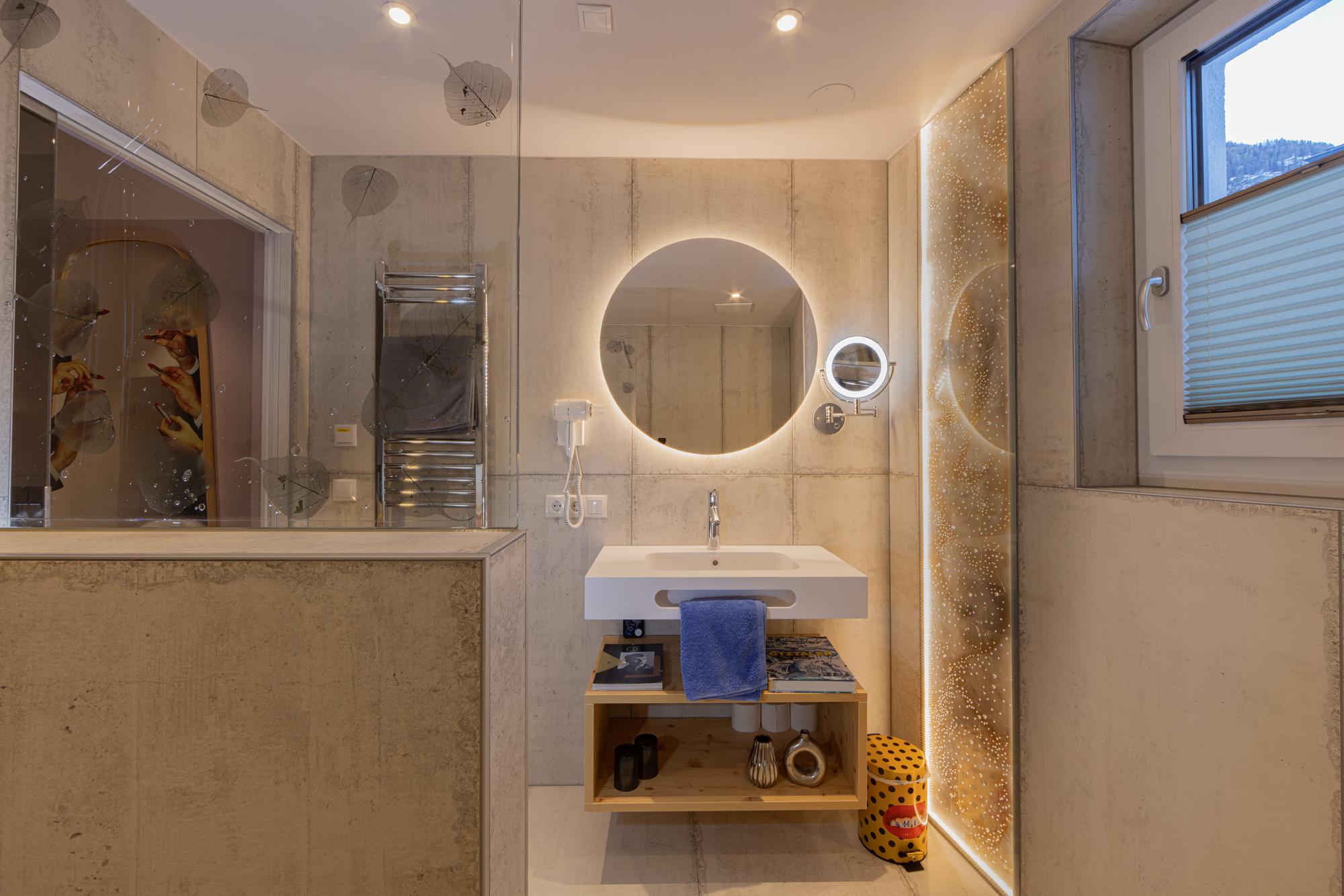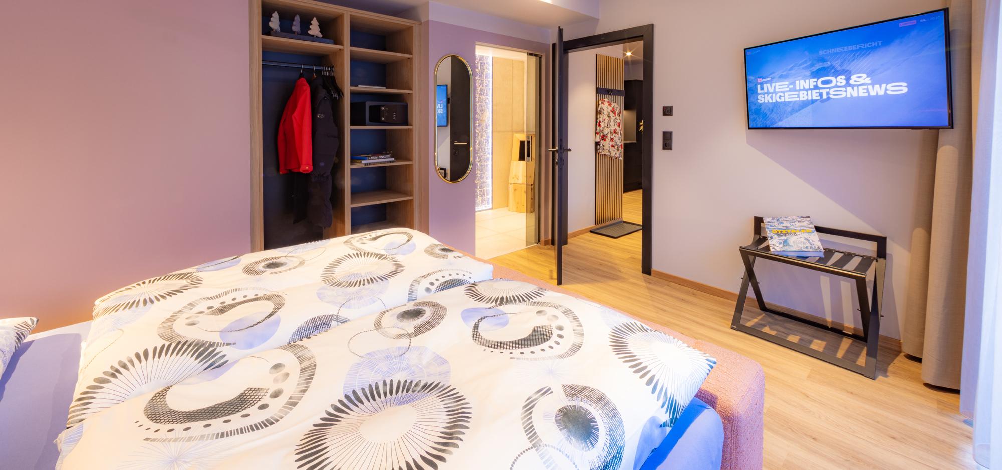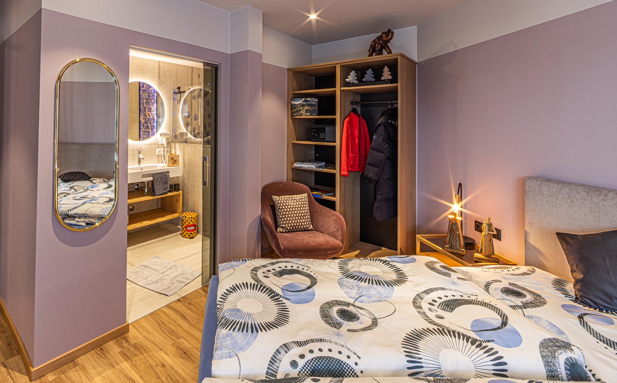 Das Appartement Clematis beeindruckt mit seiner tiefen, satten lila Farbgebung, inspiriert von der Clematis, die in den Wäldern um die Fichtenstämme wächst. Es bietet Platz für bis zu 4 Personen und verfügt über 2 Schlafzimmer, 2 Bäder mit Dusche und WC sowie eine gemütliche Wohnküche. In einem der Bäder sorgt ein Zirbenholz-Infrarotstuhl für zusätzliche Entspannung.