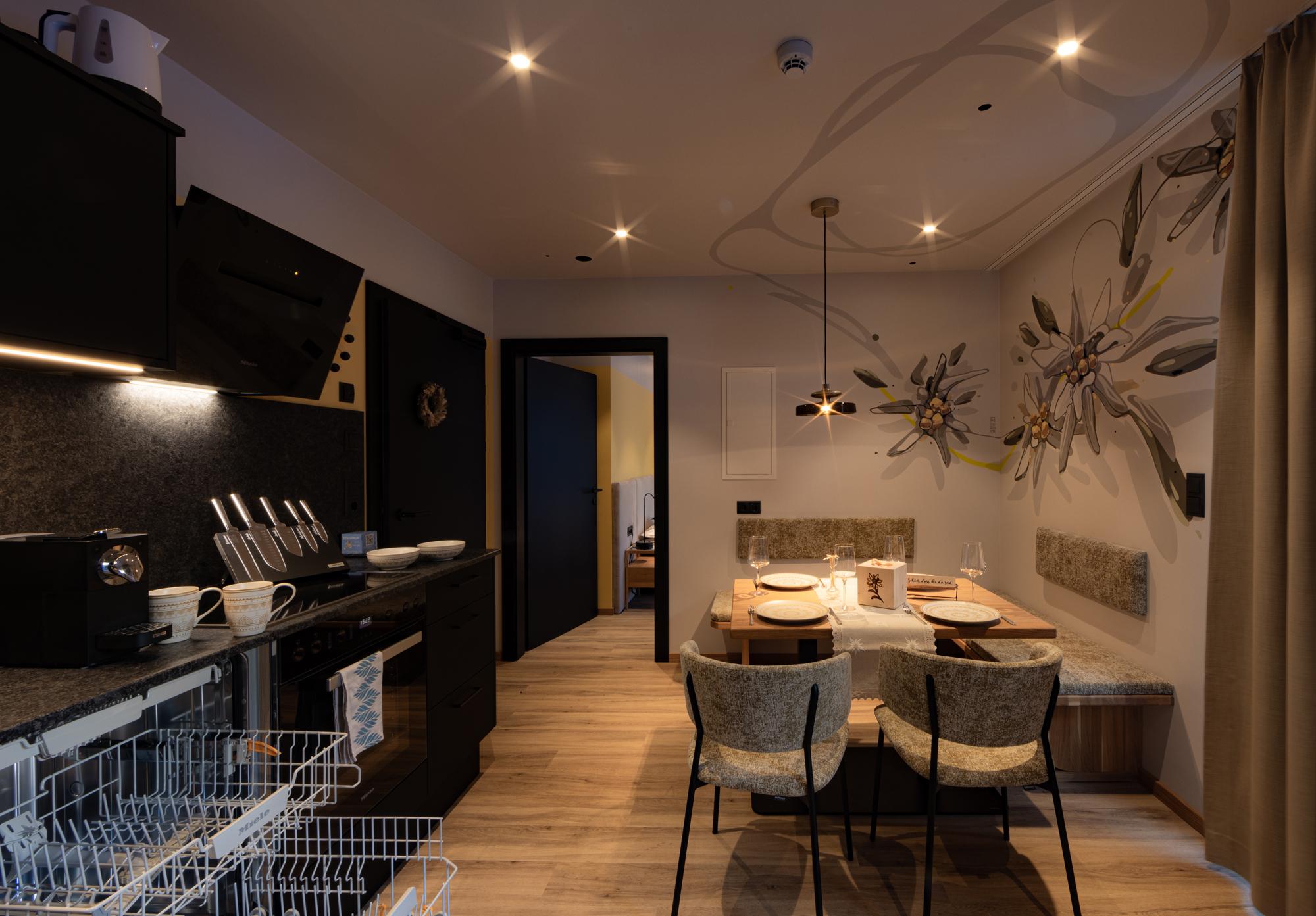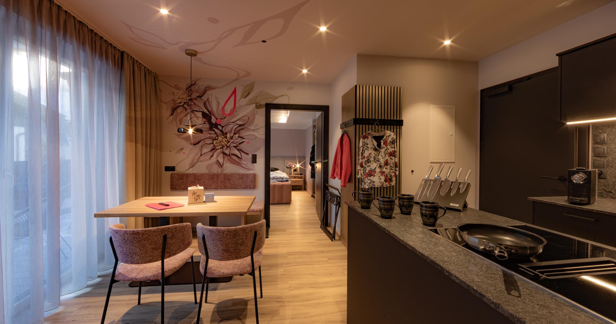 Die Appartements befinden sich in bester Lage im Zentrum von Sölden, direkt neben der Giggijochbahn und der Talabfahrt sowie den Lines der Bike Republic Sölden. Umgeben von Sportgeschäften, Restaurants, Skischulen und vielem mehr, bieten sie einen idealen Ausgangspunkt für Aktivitäten. Die Appartements sind mit viel Liebe zum Detail gestaltet und verbinden Qualität, Sauberkeit, Gemütlichkeit und Funktionalität. Inspiriert von der Natur, finden sich die Farben und Formen von heimischen Blumen im Interieur und den Namen der Appartements wieder. Ein besonderes Highlight sind die Bäder mit einzigartigen Leuchtwänden. Alle Appartements verfügen über Infrarot-Stühle, die für entspannte Muskeln und gestärkte Abfahrten sorgen. Im Gebäude befindet sich ein Bistro, welches täglich von 08:00 bis 18:00 Uhr geöffnet ist.