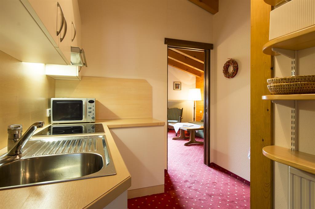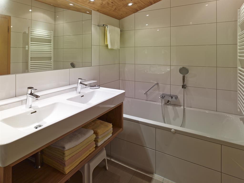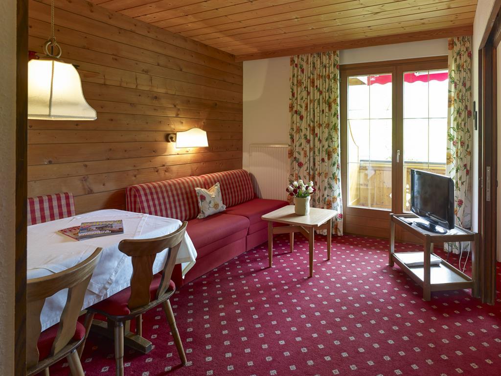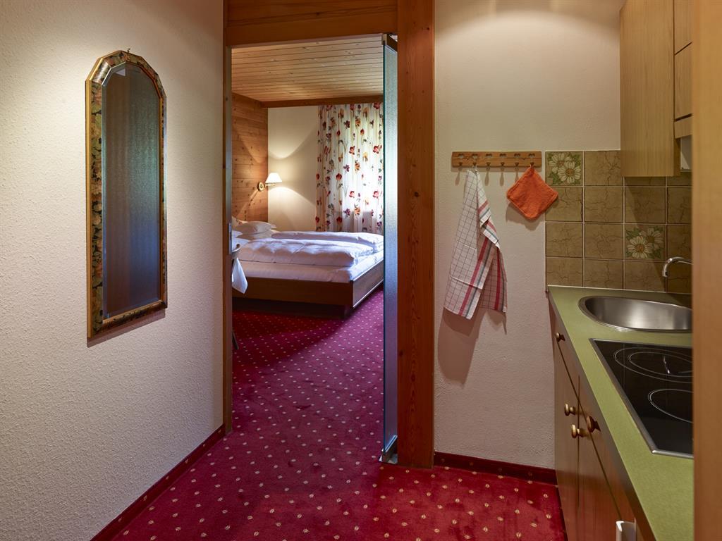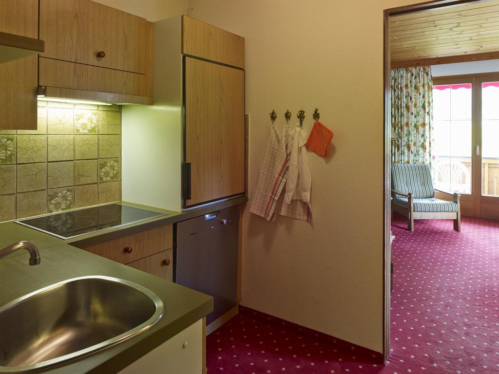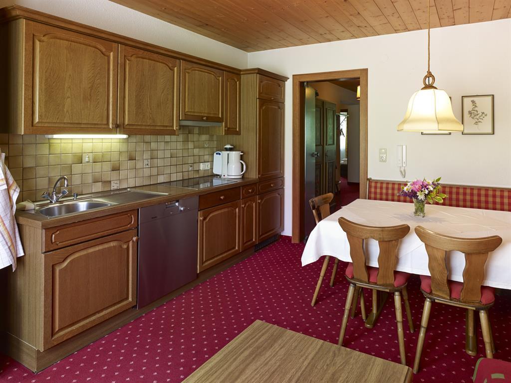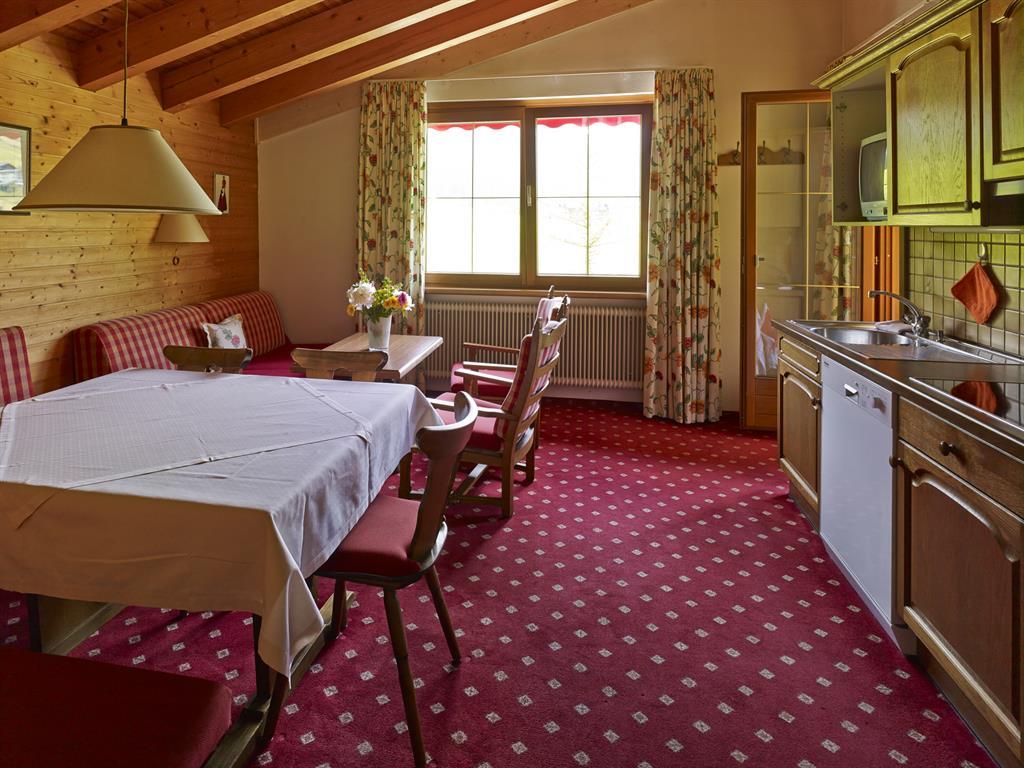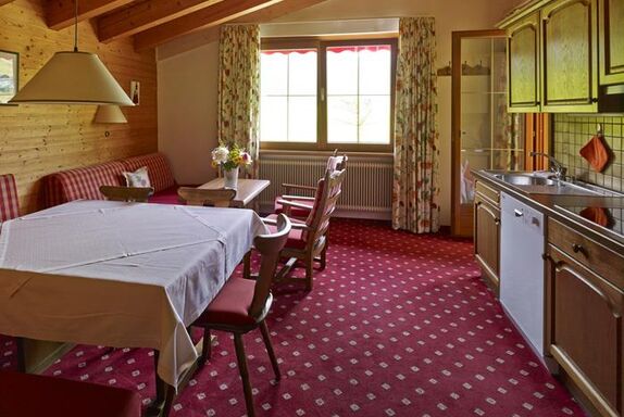Appartement „Alpenrose“ (Typ 5), im Haus Holiday, 95 m². Komfort-Appartement mit 3 Schlafzimmern: 2 Dreibettschlafzimmer (jeweils mit 1 Doppelbett und einem Einzelbett) mit Dachschräge (1,70 m Höhe).und 1 Doppelschlafzimmer. Zwei Bäder, einmal mit Dusche und einmal mit Badewanne, Doppelwaschbecken, 2 getrennte WCs. Ein großer Wohnraum mit Esstisch und gemütlicher ausziehbarer Couch. Integrierte Küche im Wohnbereich mit E-Herd (ohne Backofen), Geschirrspülmaschine, Toaster, Kaffeefilterkanne und mehr). Großer Süd-Balkon. Geeignet für 6 Erwachsene (und zwei Kleinkinder bis 6 Jahre).