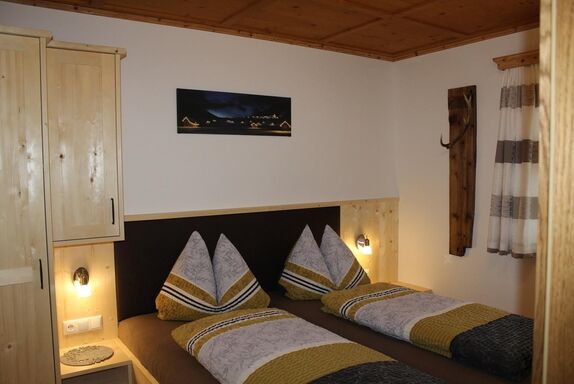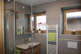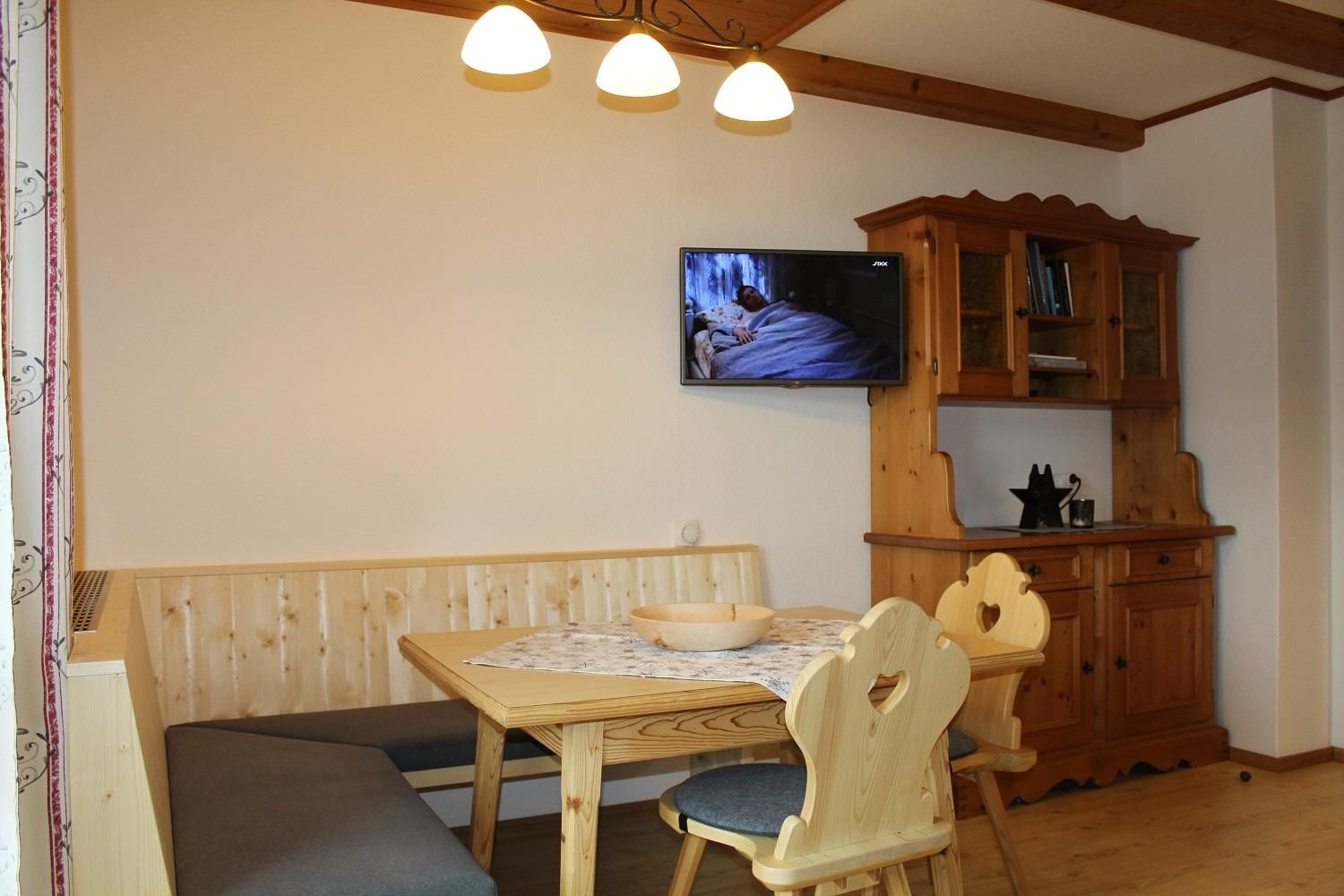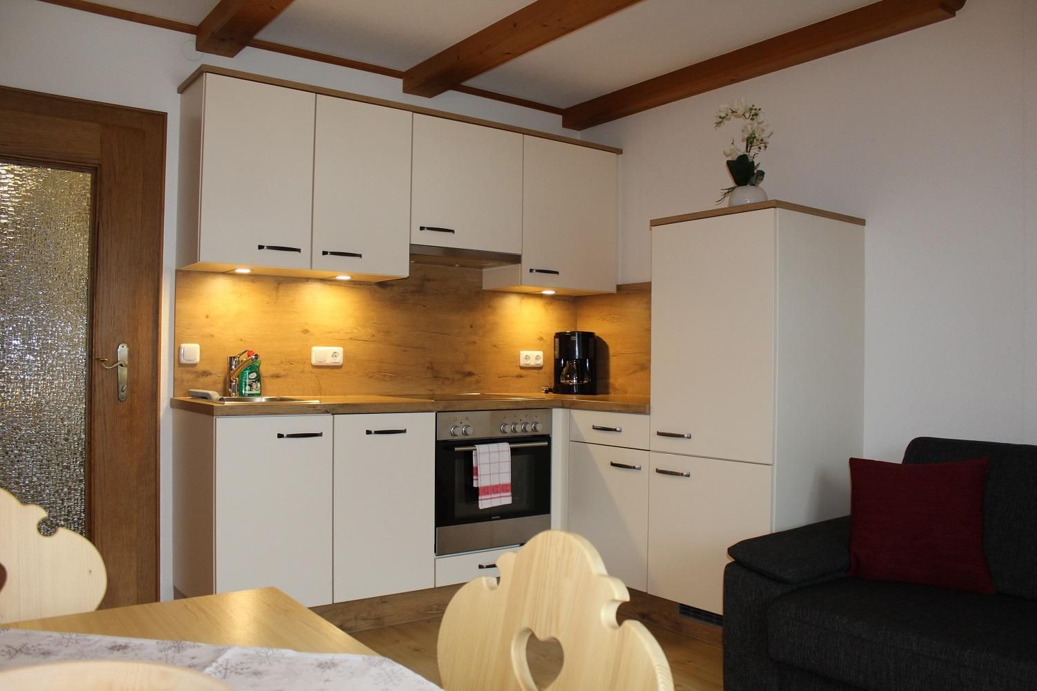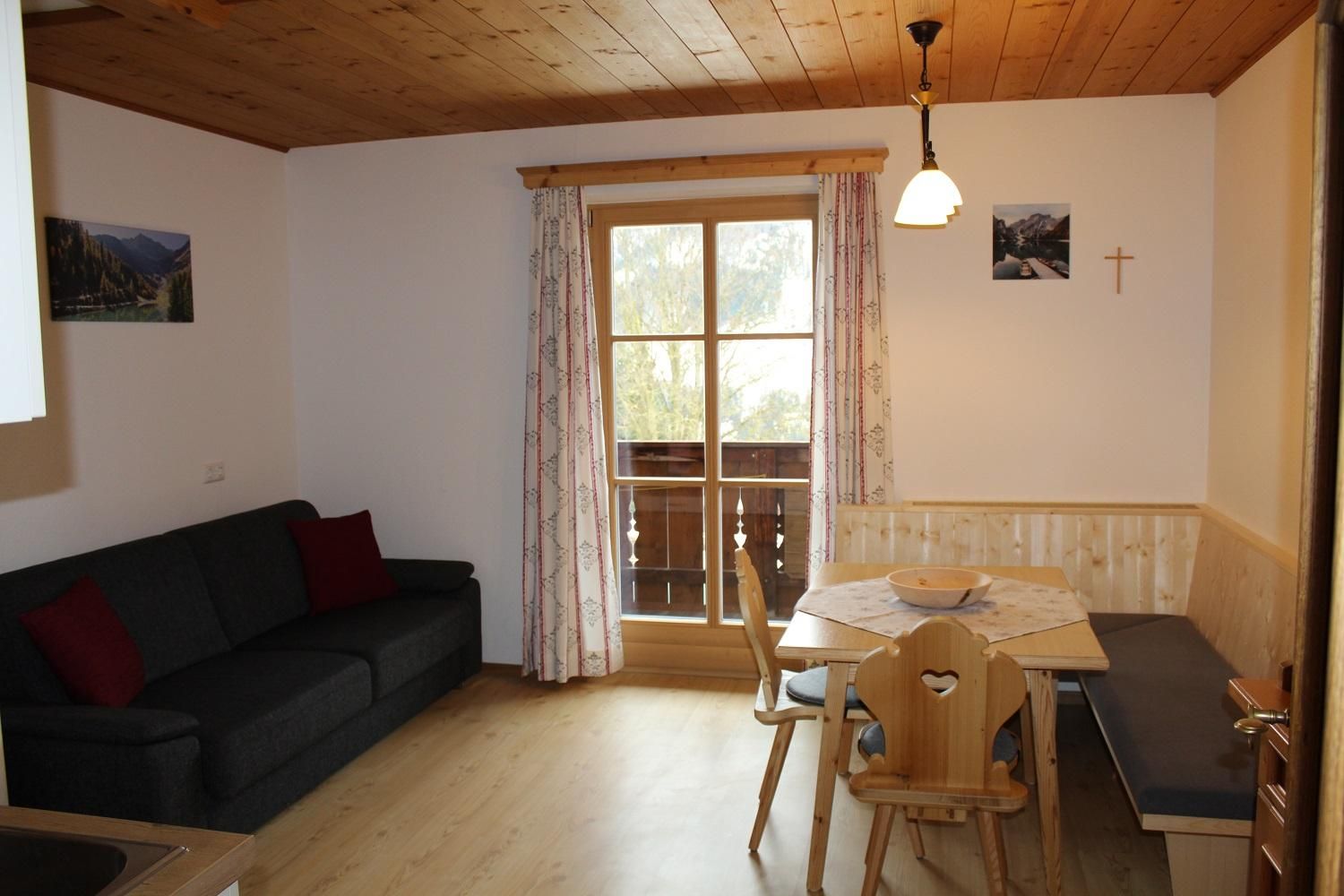 Unsere gemütliche Ferienwohnung für 2 bis 4 Personen besteht aus: Wohnküche mit großer Sitzecke und ausziehbarer Doppelcouch, Schlafzimmer mit 2 Betten, Bad mit WC und Dusche und Balkon (Südseite).