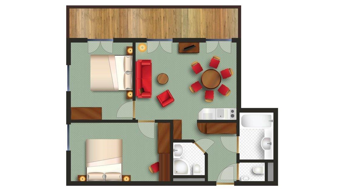 61 m² mit 2 getrennten Schlafzimmern mit je einem Doppelbett, Wohnraum mit Kochnische, Bad, separates WC, Dusche/WC, Balkon