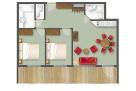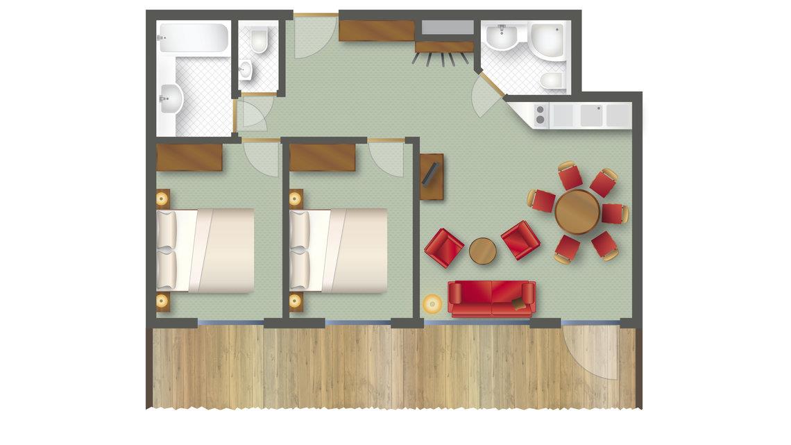 63 m² mit 2 getrennten Schlafzimmern mit je einem Doppelbett, Wohnraum mit Kochnische, Bad, separates WC, Dusche/WC, Balkon