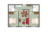 57 m² mit 2 getrennten Schlafzimmern mit je einem Doppelbett, Wohnraum mit Kochnische, 2 x Dusche / WC