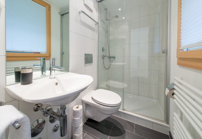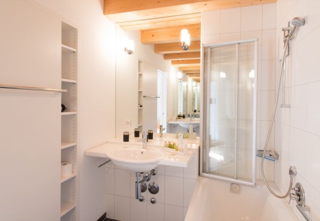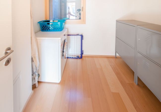 Der Waschraum mit einem kombi Wasch-Trockner ist praktisch und bietet auch Stauraum für alle leeren Koffer und Taschen. Darüber hinaus hat die Wohnung Zugang zum privaten Skiraum vom Chalet Wyssbirg.