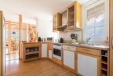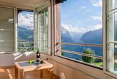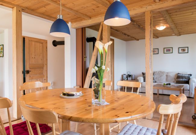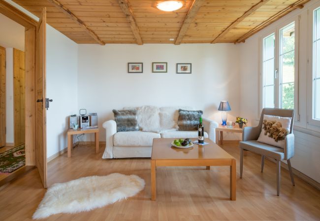 Die halboffene Wohn-Ess-Küche verfügt über vier verschiedene Räume. Der Wohnbereich ist charaktervoll mit einem schwedischen Holzbrenner und Holzbalken ausgerüstet und verfügt über einen atemberaubendem Blick auf die Jungfrau im Süden. Der Essbereich verfügt über Holzbalken und bietet Zugang zu einem der beiden nach Süden ausgerichteten Balkone. Dies ist ein einzigartiger und charmanter Ort, um Familienessen vor einer atemberaubenden Bergkulisse zu genießen. Ein zusätzlicher Sitzbereich nach Westen mit Panoramafenstern an drei Seiten ist wirklich faszinierend und bietet einen hervorragenden Aussichtspunkt, um die Sonne, die Natur und den Blick auf die Berge zu genießen. Der Küchenbereich im hinteren Bereich der Wohnung verfügt über einen separaten Balkon und ist für einen Selbstversorgerurlaub gut ausgestattet.