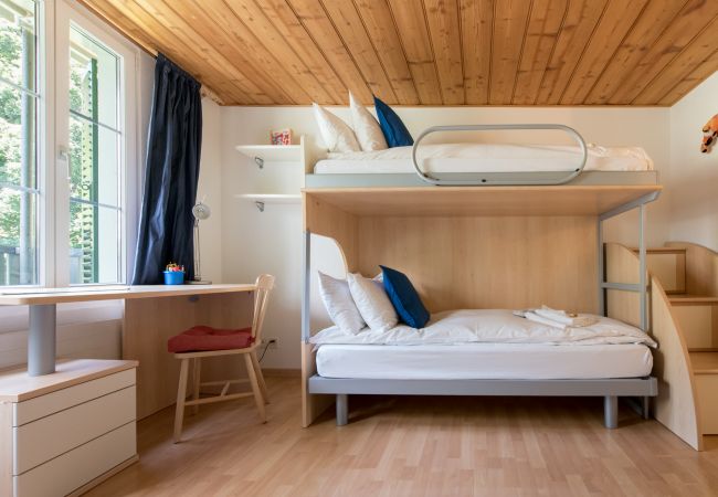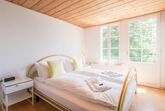 Das Hauptschlafzimmer mit Südbalkon verfügt über ein Kingsize-Doppelbett (180 x 200 cm) und das zweite Schlafzimmer auf der Rückseite der Wohnung über ein Etagenbett (2 x 90 x 200 cm), einen Schreibtisch und ein Sofa. Ein Familienbadezimmer mit Badewanne, Duschkabine, zwei Waschbecken und WC dient beiden Schlafzimmern. Die Wohnung hat auch einen Wäscheschrank mit Waschmaschine und Trockner.