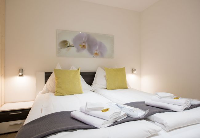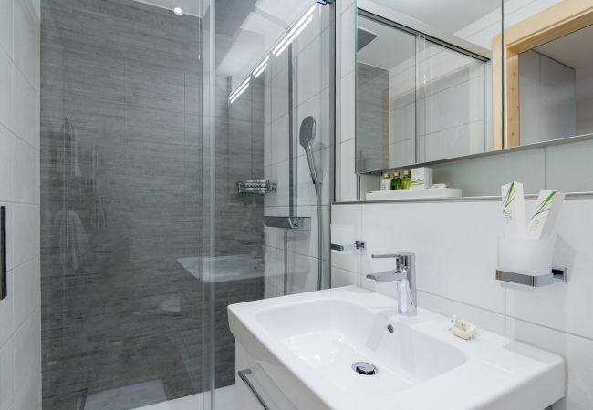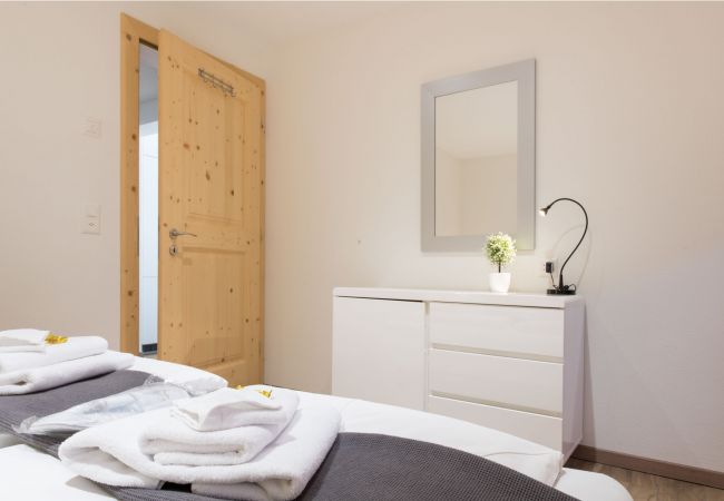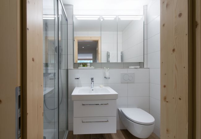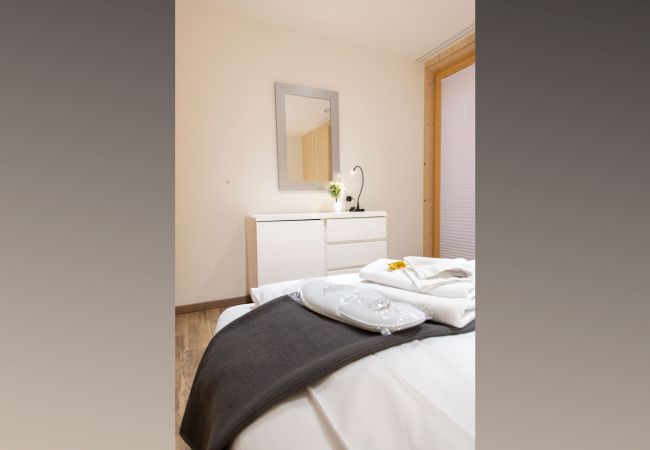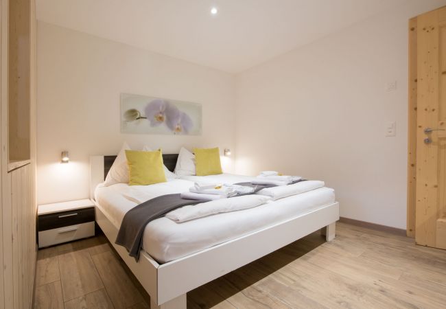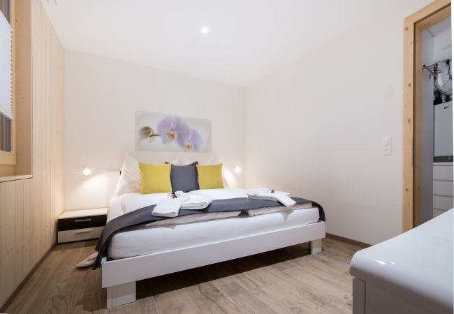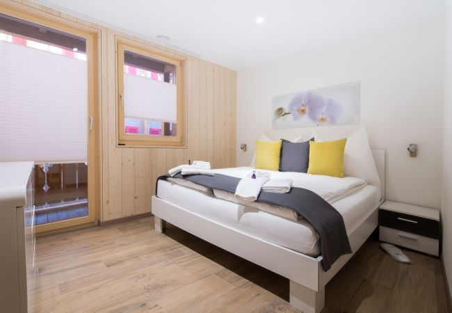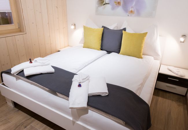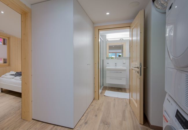 Das geräumige, mit einem Kingsize-Bett (180x200cm) eingerichtete Schlafzimmer befindet sich direkt neben einem mit Schränken ausgestatteten Ankleidebereich, der zum Duschraum führt. Die Ferienwohnung ist außerdem mit Waschmaschine und Trockner ausgestattet und hat einen Raum für Skier.