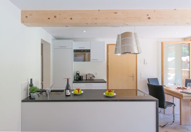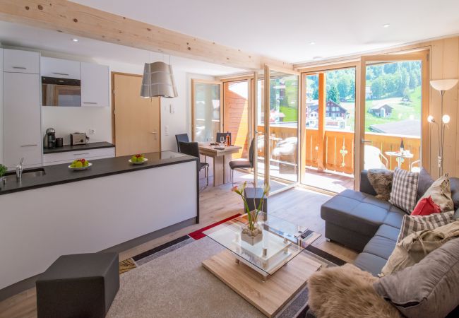Die offene Wohn-Ess-Küche verfügt über große Panoramafenster mit Blick auf den Männlichen und den Wengener Anfängerhügel. Machen Sie es sich am Abend auf dem gemütlichen Sofa bequem oder genießen Sie das Kochen in der gut ausgestatteten Küche nach einem Tag auf Skiern, Sightseeing oder Wanderungen.