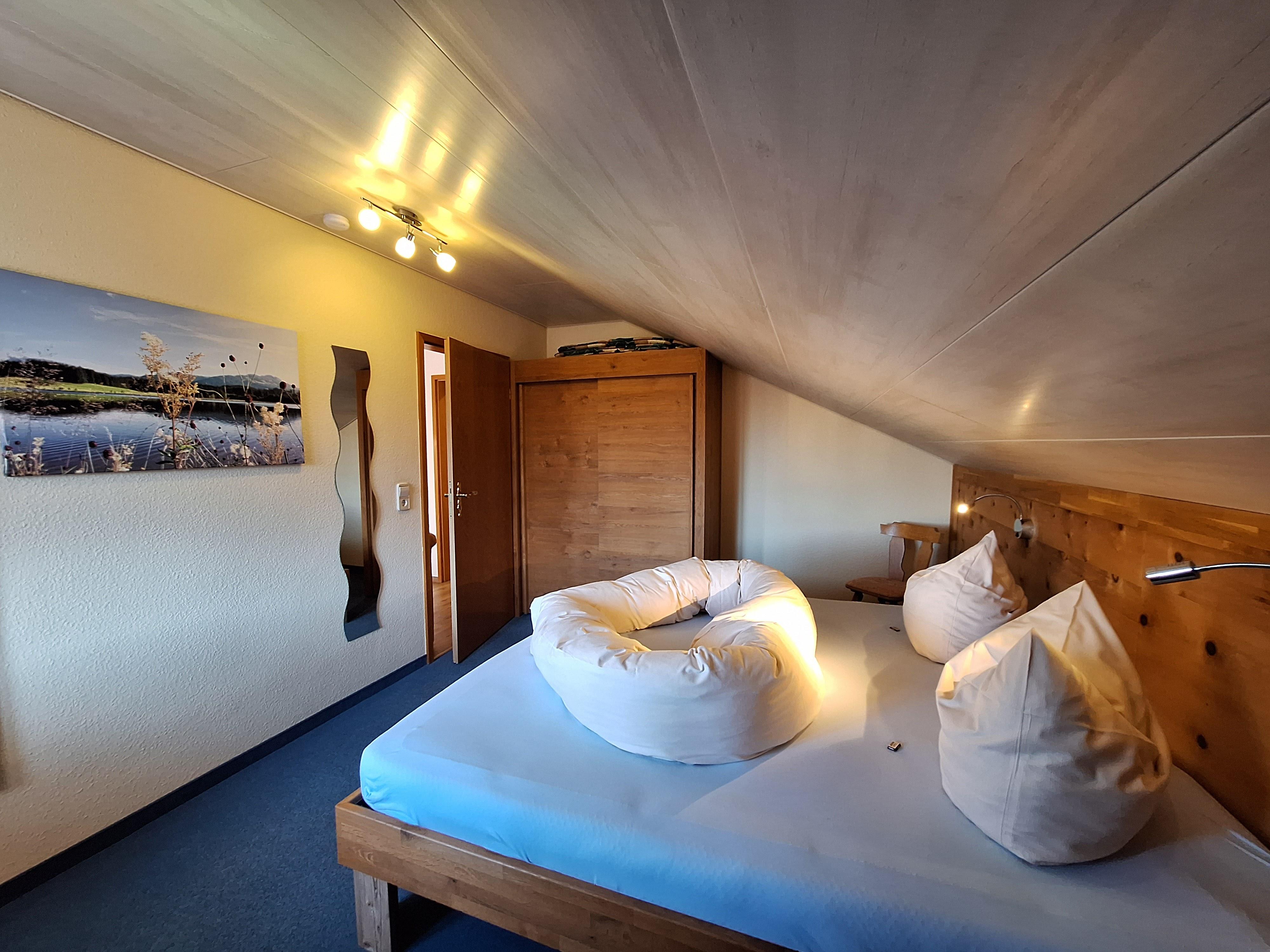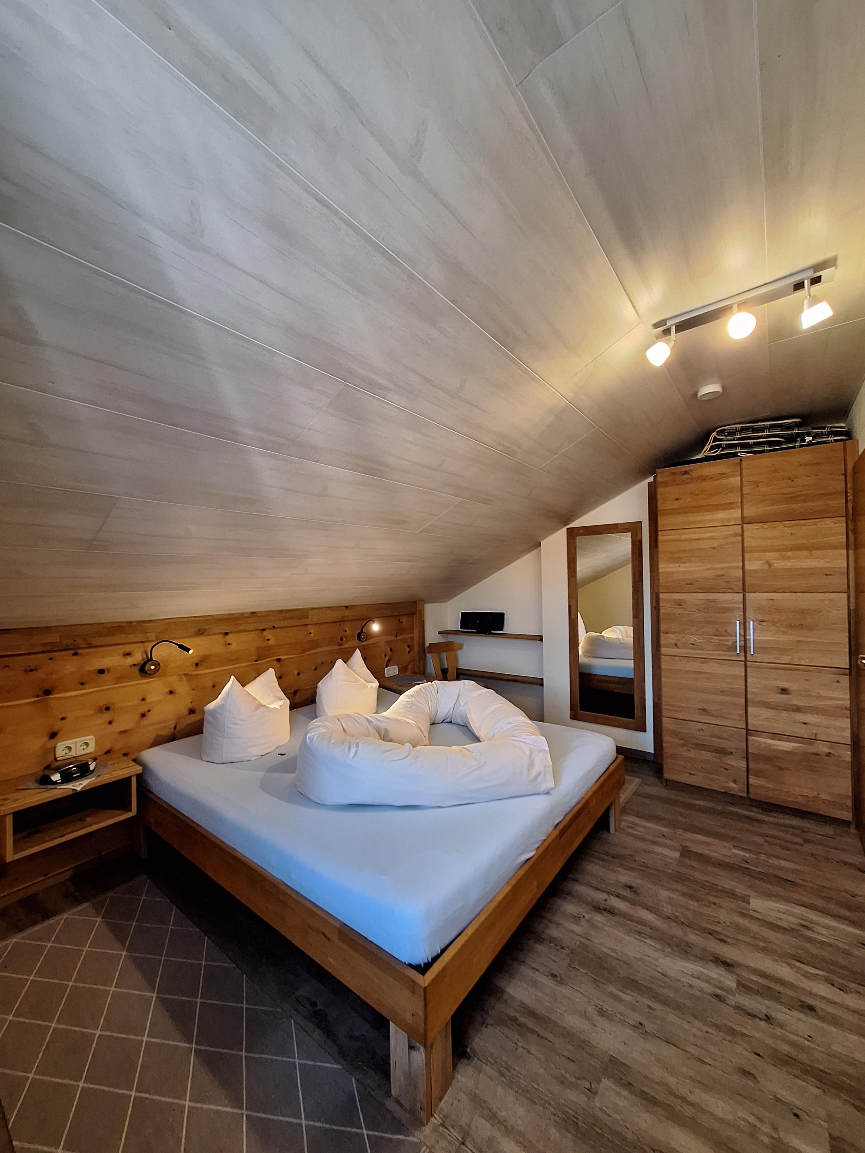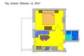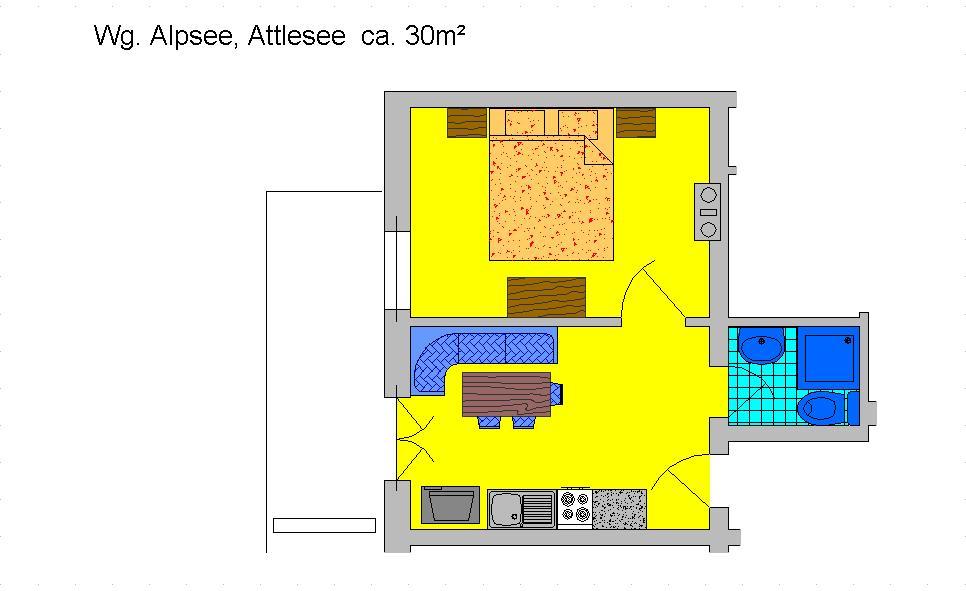 Gemütliche 2-Zimmerferienwohnung Attlesee (30 qm) im 2. Stock mit Westbalkon (Blick zur Alpspitze und zum Grünten), 1 Doppelschlafzimmer, schöner Wohnküche (Backofen, Ceranfeld, Kaffeemaschine, Mikrowelle, Spülmaschine, Toaster, Wasserkocher), Sat-TV, Stereoanlage und Radiowecker sowie Badezimmer mit Dusche/WC und Haarfön.