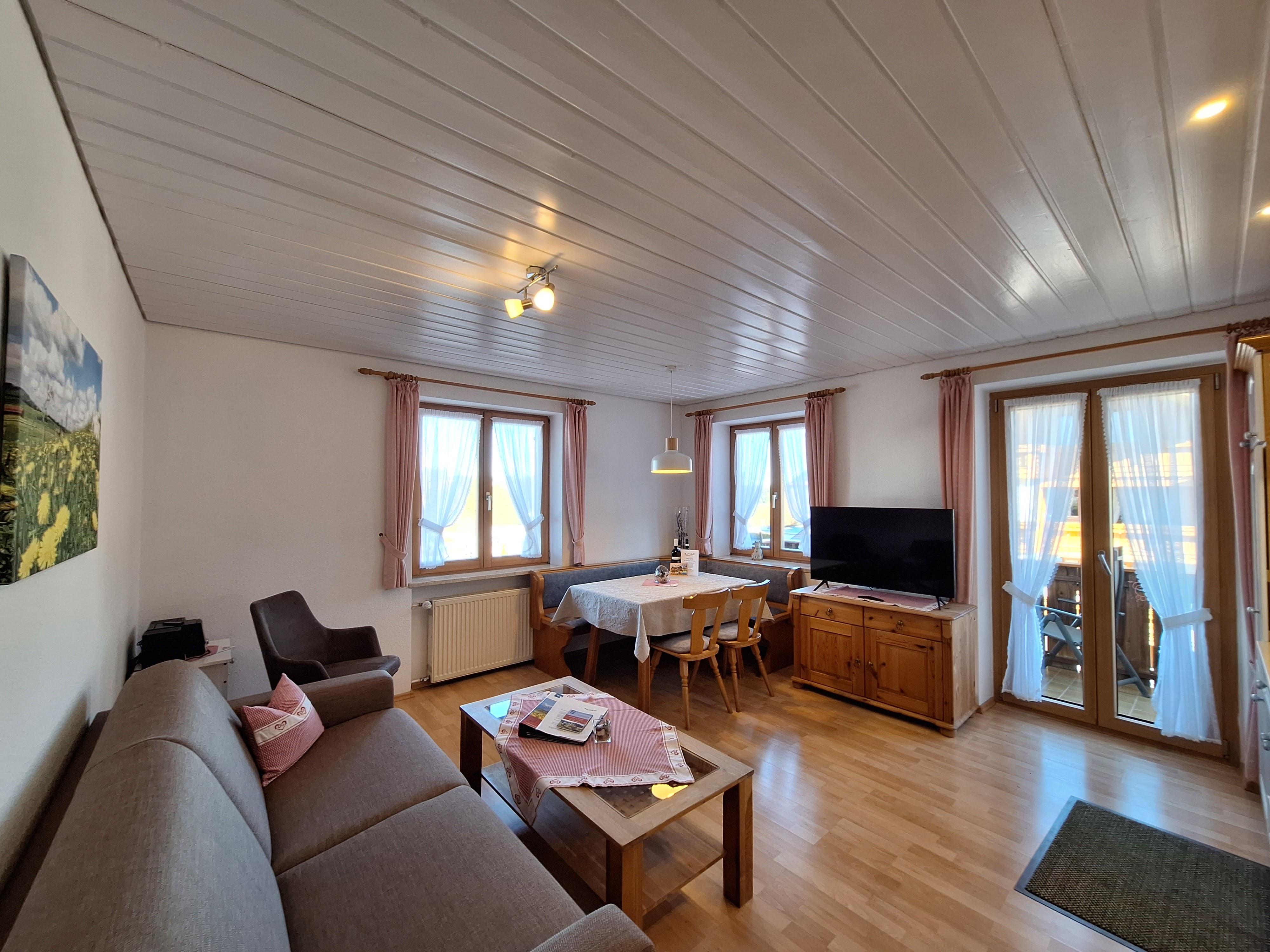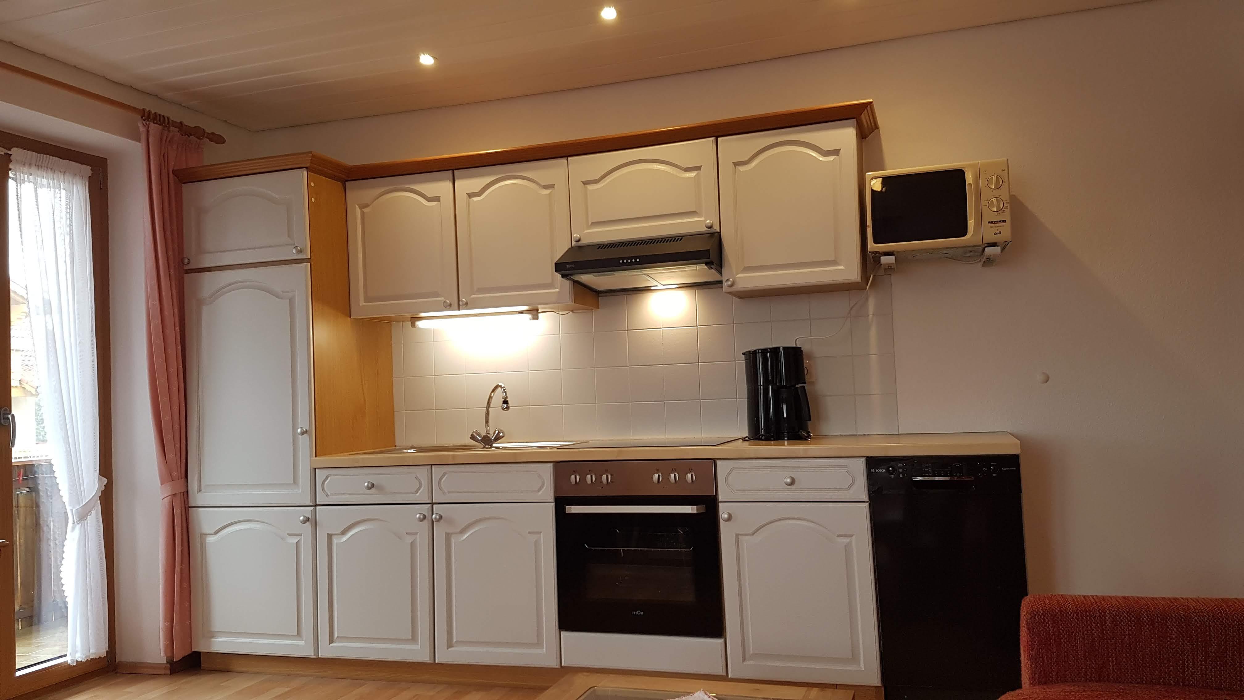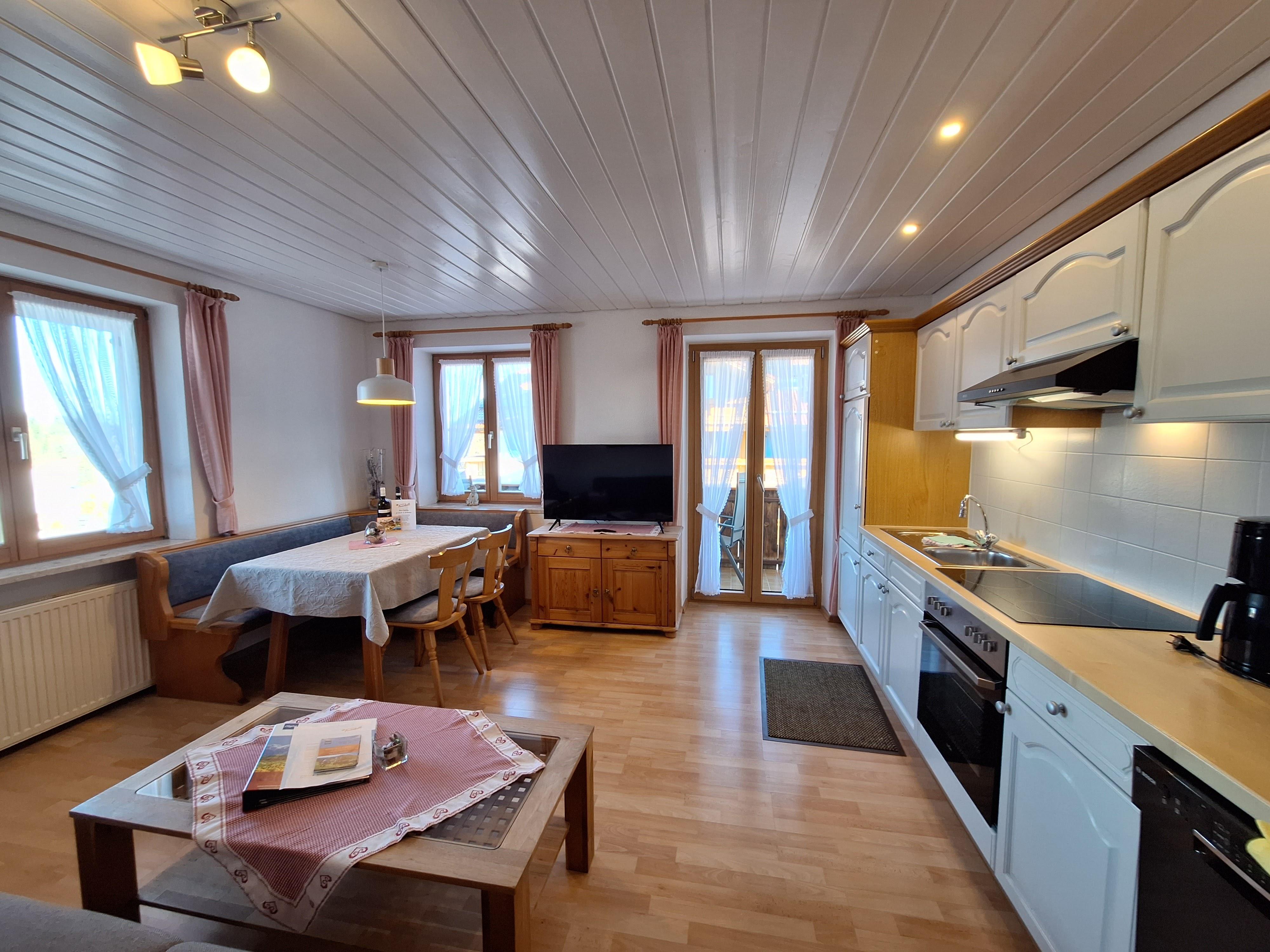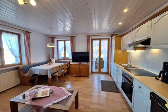 Gemütliche 3-Zimmerferienwohnung Hohenschwangau (60 qm) im 1. Stock mit Ostbalkon (Blick ins Alpenvorland und zur Zugspitze), 2 getrennte Schlafzimmer (1 x Doppelbett, 1 x getrennte Betten), schöner Wohnküche (Backofen, Ceranfeld, Kaffeemaschine, Mikrowelle, Spülmaschine, Toaster, Wasserkocher), Sat-TV, Stereoanlage und Radiowecker, Badezimmer mit Dusche/WC und Haarfön. Kinder bis 3 Jahre wohnen kostenfrei.