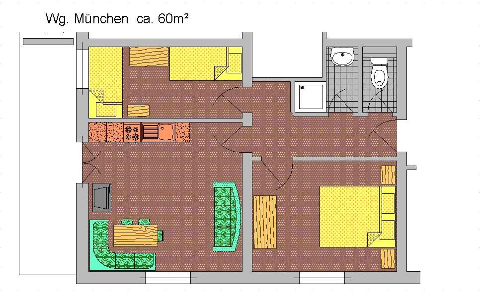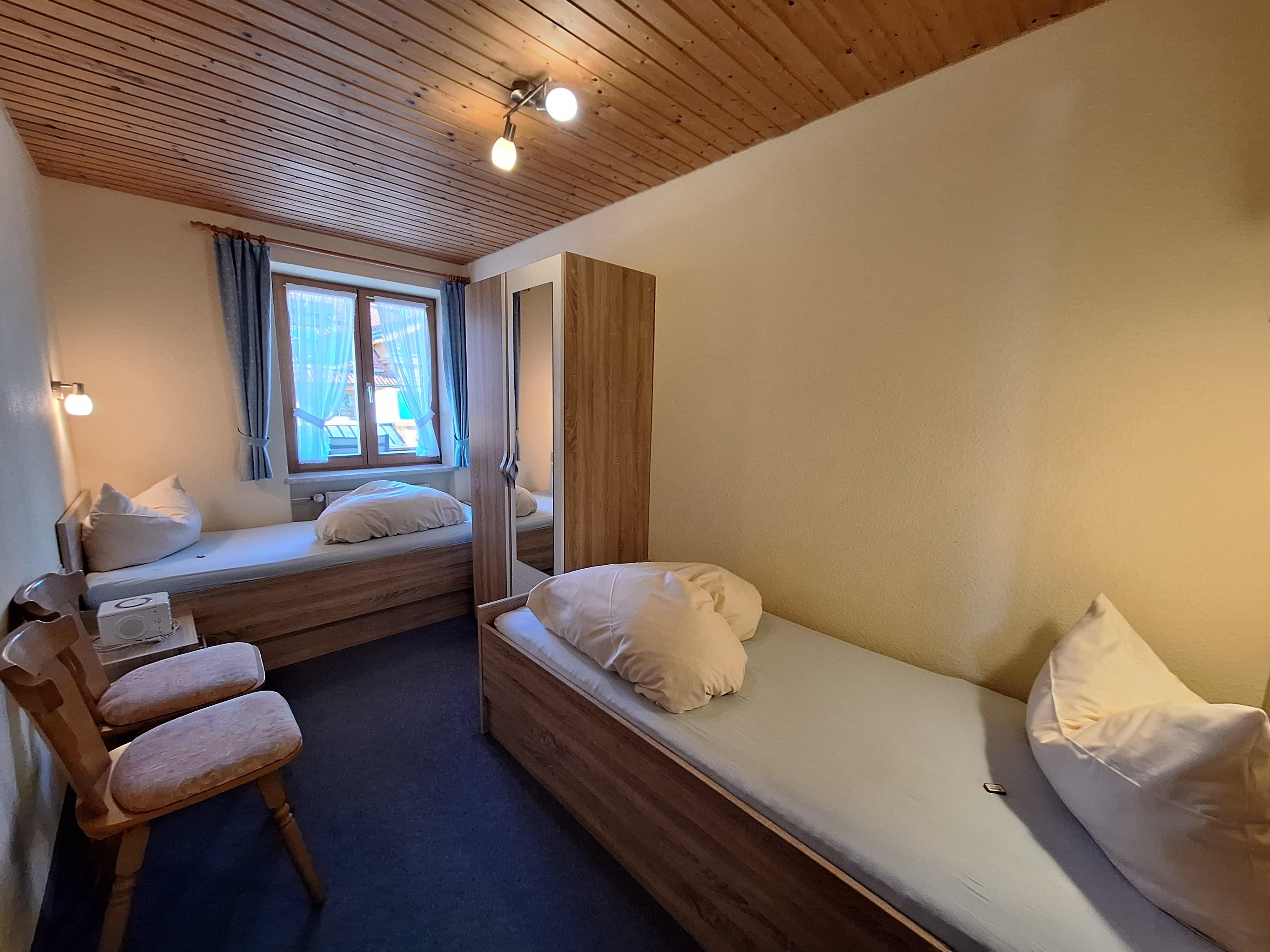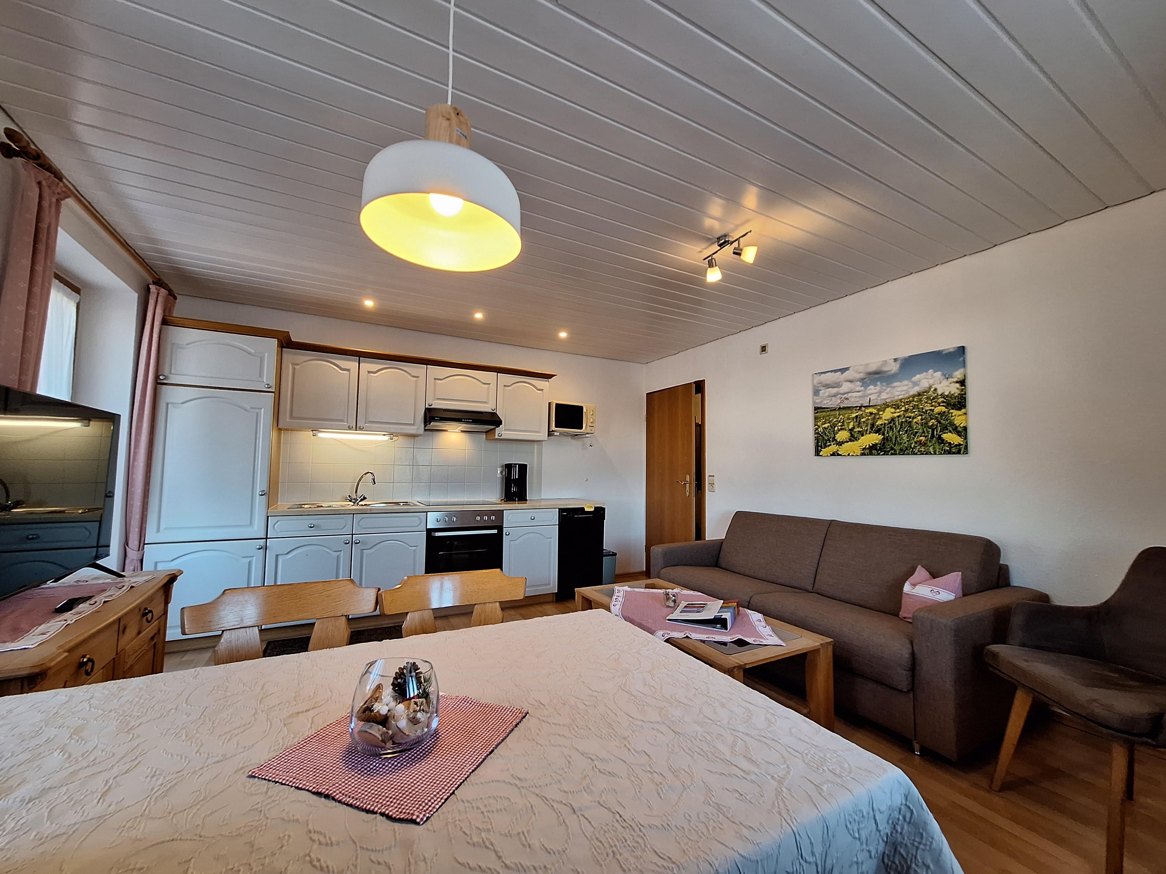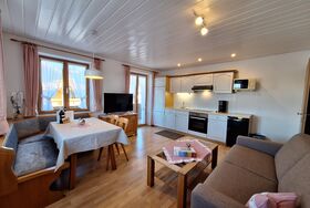 Gemütliche 3-Zimmerferienwohnung Hohenschwangau (60 qm) im 1. Stock mit Ostbalkon (Blick ins Alpenvorland und zur Zugspitze), 2 getrennte Schlafzimmer (1 x Doppelbett, 1 x getrennte Betten), schöner Wohnküche (Backofen, Ceranfeld, Kaffeemaschine, Mikrowelle, Spülmaschine, Toaster, Wasserkocher), Sat-TV, Stereoanlage und Radiowecker, Badezimmer mit Dusche/WC und Haarfön. Kinder bis 3 Jahre wohnen kostenfrei.