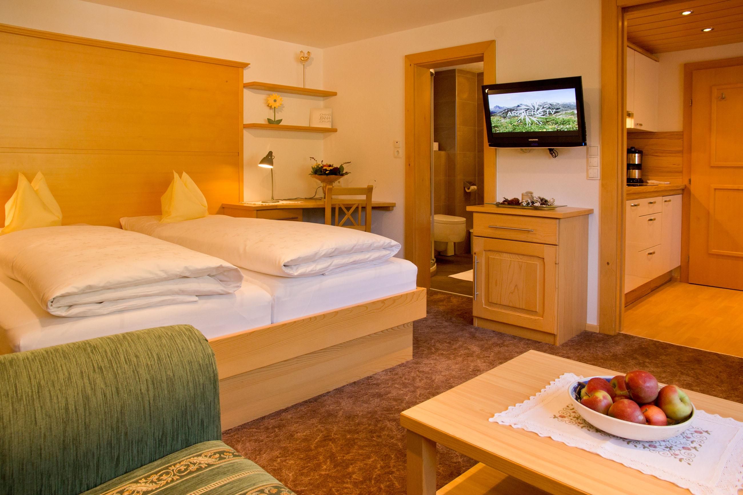 Das Appartement Nr. 6 mit 30 m² für 2 Personen bietet einen wunderbaren Blick über Lech. Außerdem verfügt die Wohnung über eine große Sonnenterrasse. Wurde heuer im Herbst 2010 neu renoviert. Diese Wohnung besteht aus einem Doppelbettschlafzimmer mit gemütlicher Sitzcouch und Schreibtisch, einem getrennten Eßbereich mit komplett eingerichteter Kochnische ( Kombibackrohr, Ceranherd mit vier Felder, Kaffeemaschine, Spülmaschine usw. ). Internetanschluss über W-LAN. Das Badezimmer ist mit einer Dusche,WC und Waschbecken mit Spiegelschrank ausgestattet.