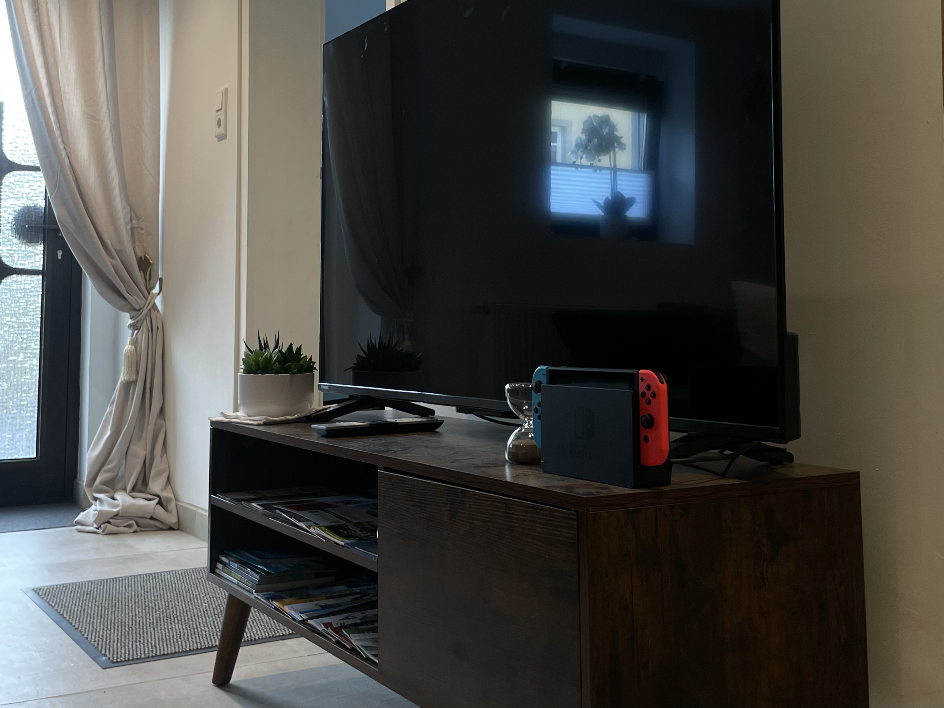 Unsere Wohnung bietet Platz für bis zu vier Personen und ist voll möbliert. Sie verfügt über ein gemütliches Doppelbett sowie eine große Schlafcouch im Wohnzimmer. Die Küche ist mit allem ausgestattet, was Sie für einen komfortablen Aufenthalt benötigen: Toaster, Mikrowelle, Wasserkocher, Kaffepadmaschine, Spülmaschine und Backofen. Der Wohnbereich ist mit einem Fernseher, einer Auswahl an Spielen und einer Nintendo Switch ausgestattet.