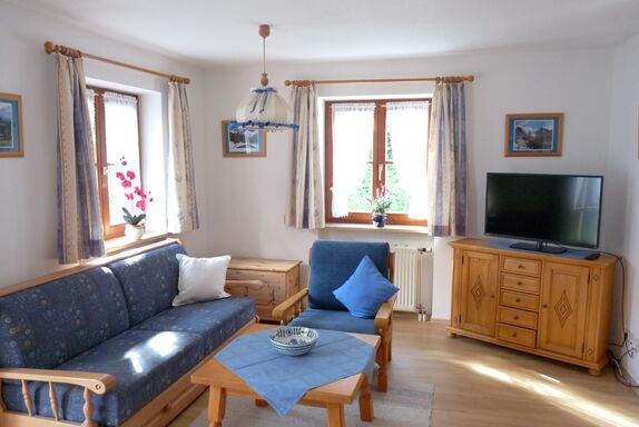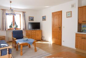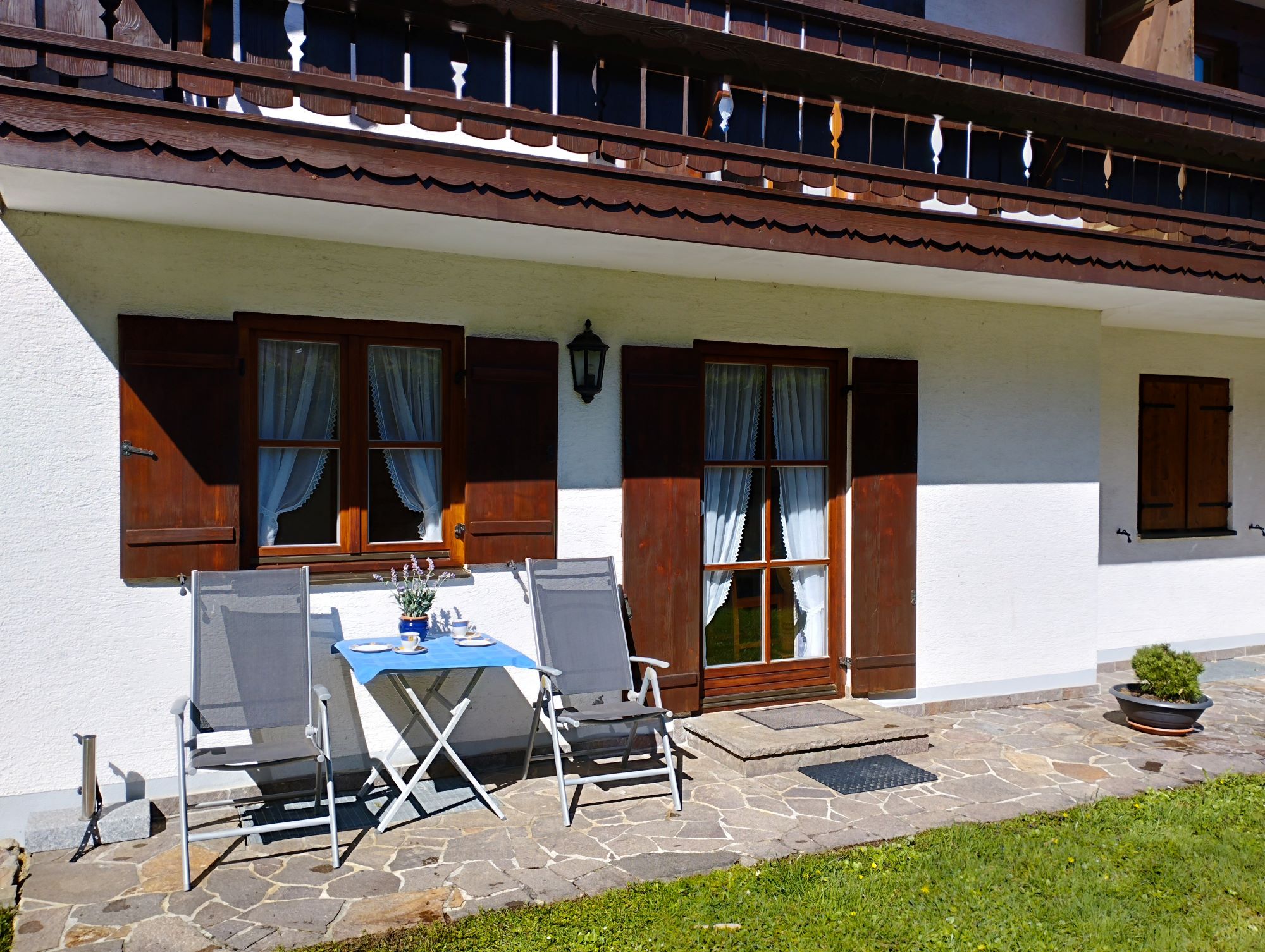 Unsere Ferienwohnung befindet sich im Erdgeschoß und bietet Platz auf 42 qm. Sie ist ausgestattet mit einem sep. Schlafzimmer, Wohnküche mit Essecke, Ausziehcouch, Flachbildfernseher und kleiner Küchenzeile mit Minibackofen, Badezimmer mit Dusche und WC. Kleine Diele mit Garderobe. Terrasse mit Gartenmöbel mit Bergblick.