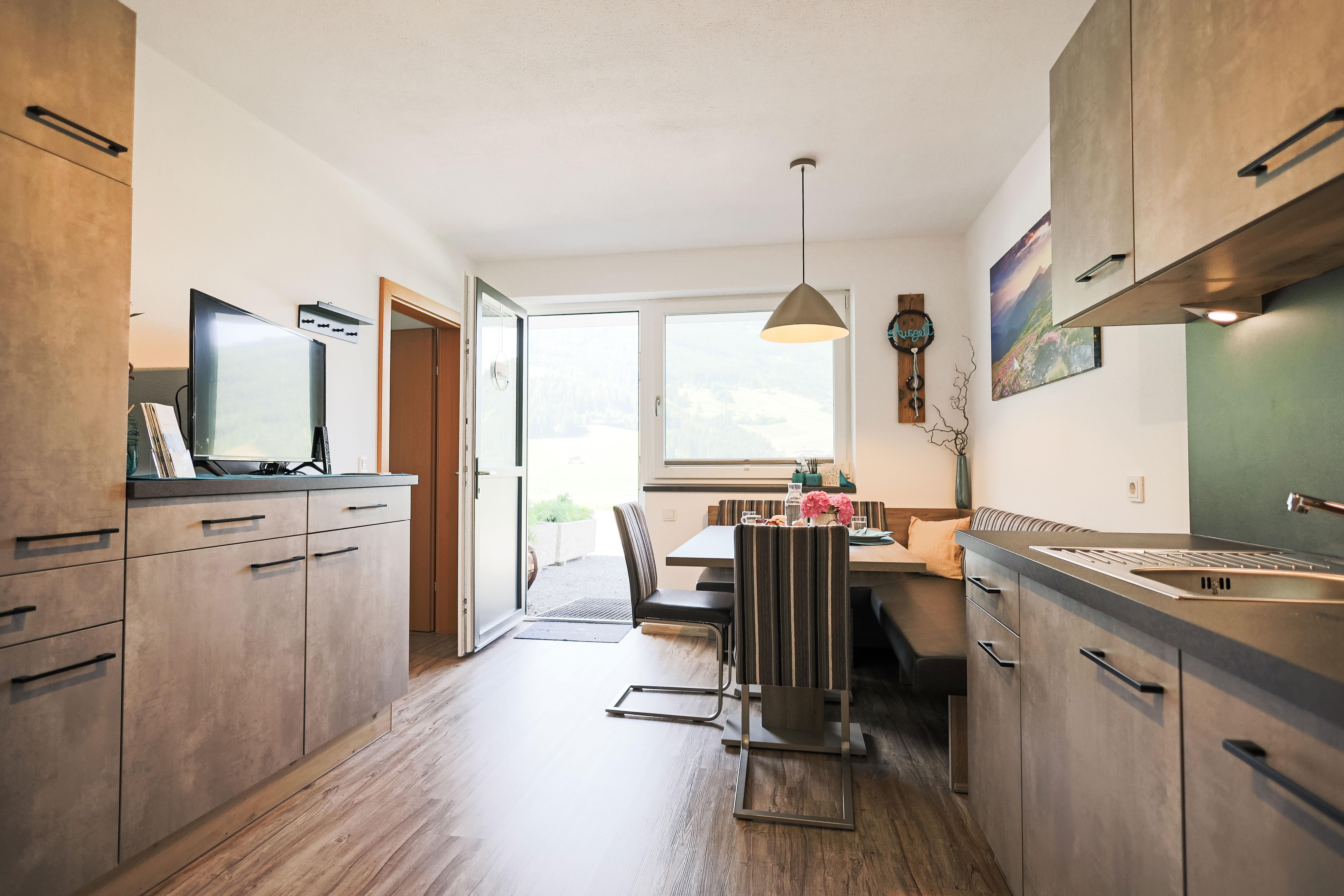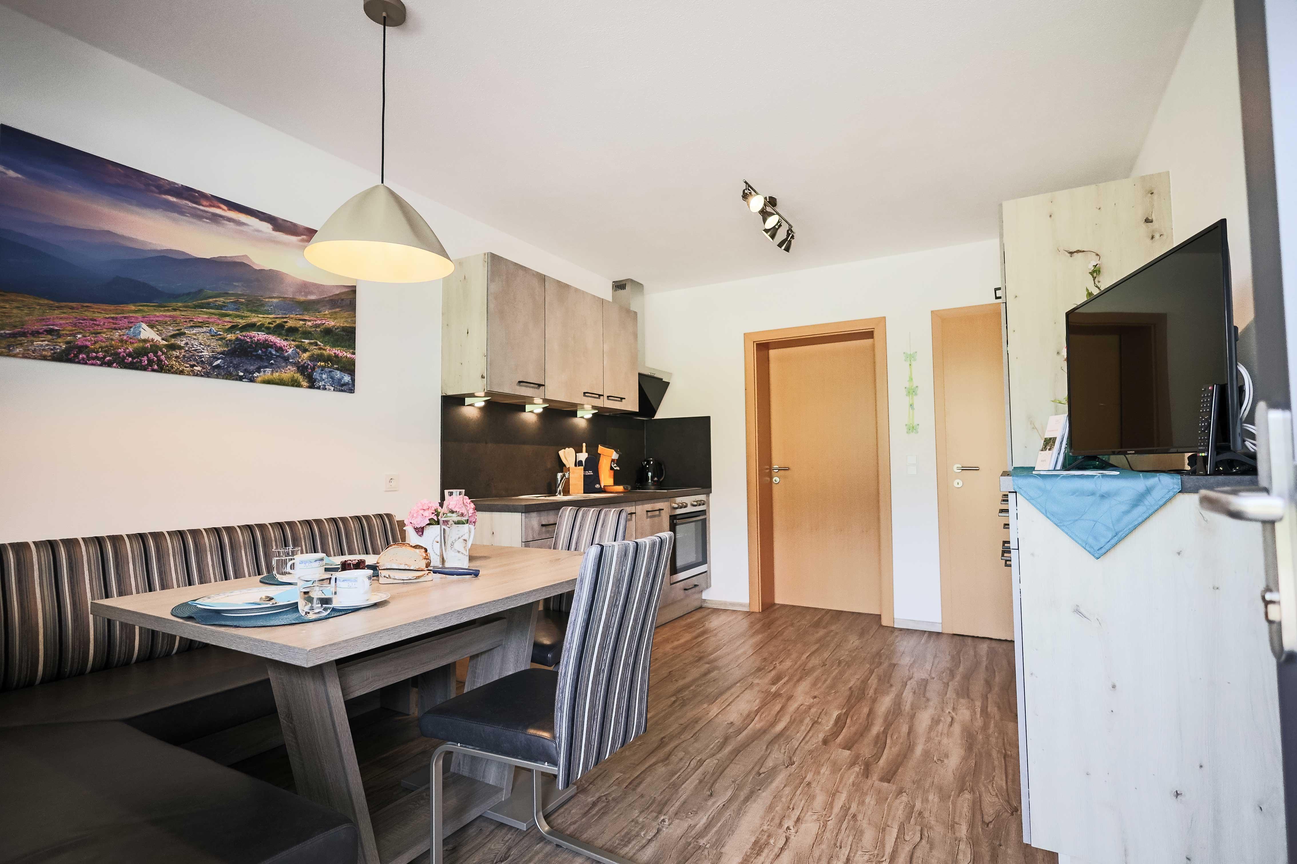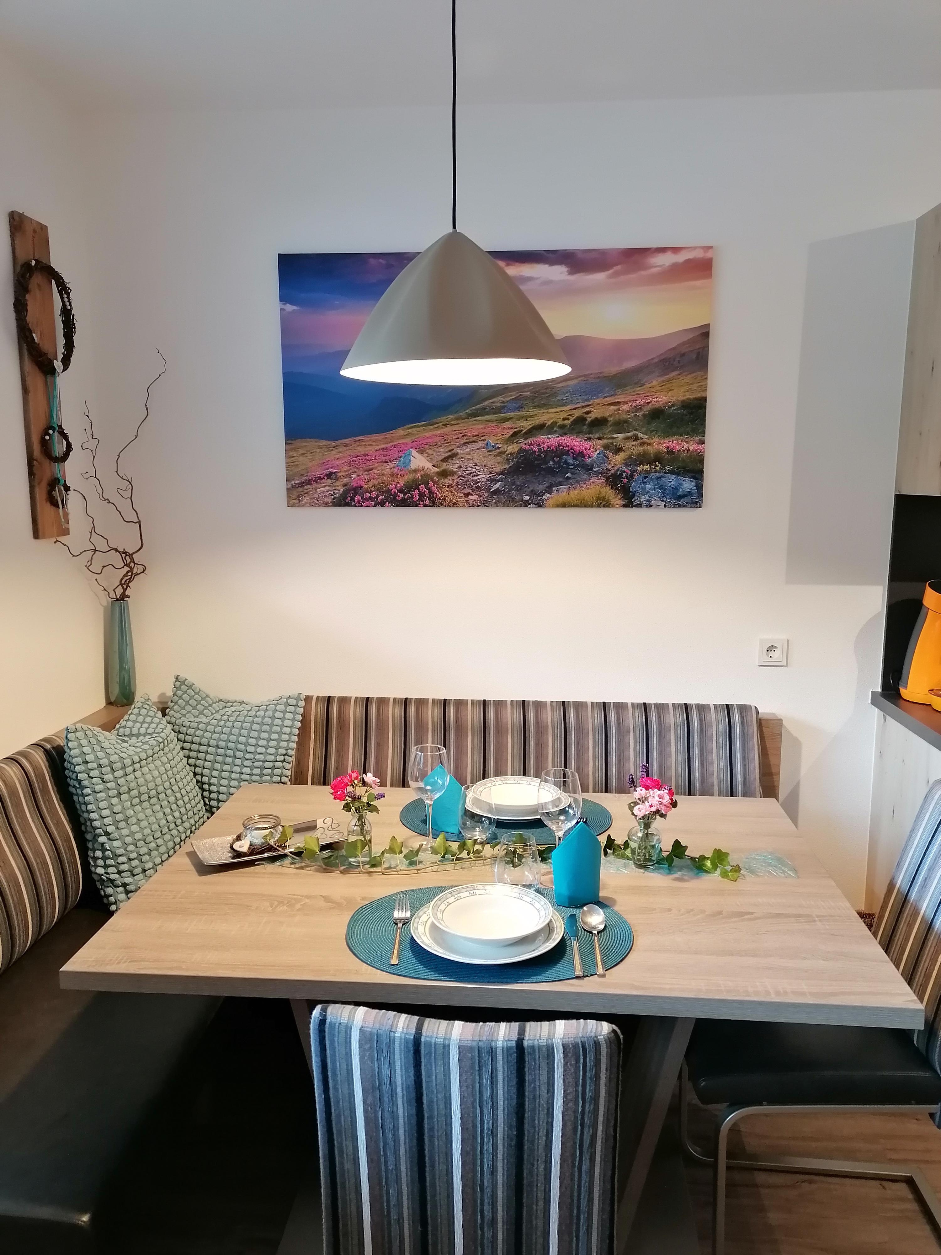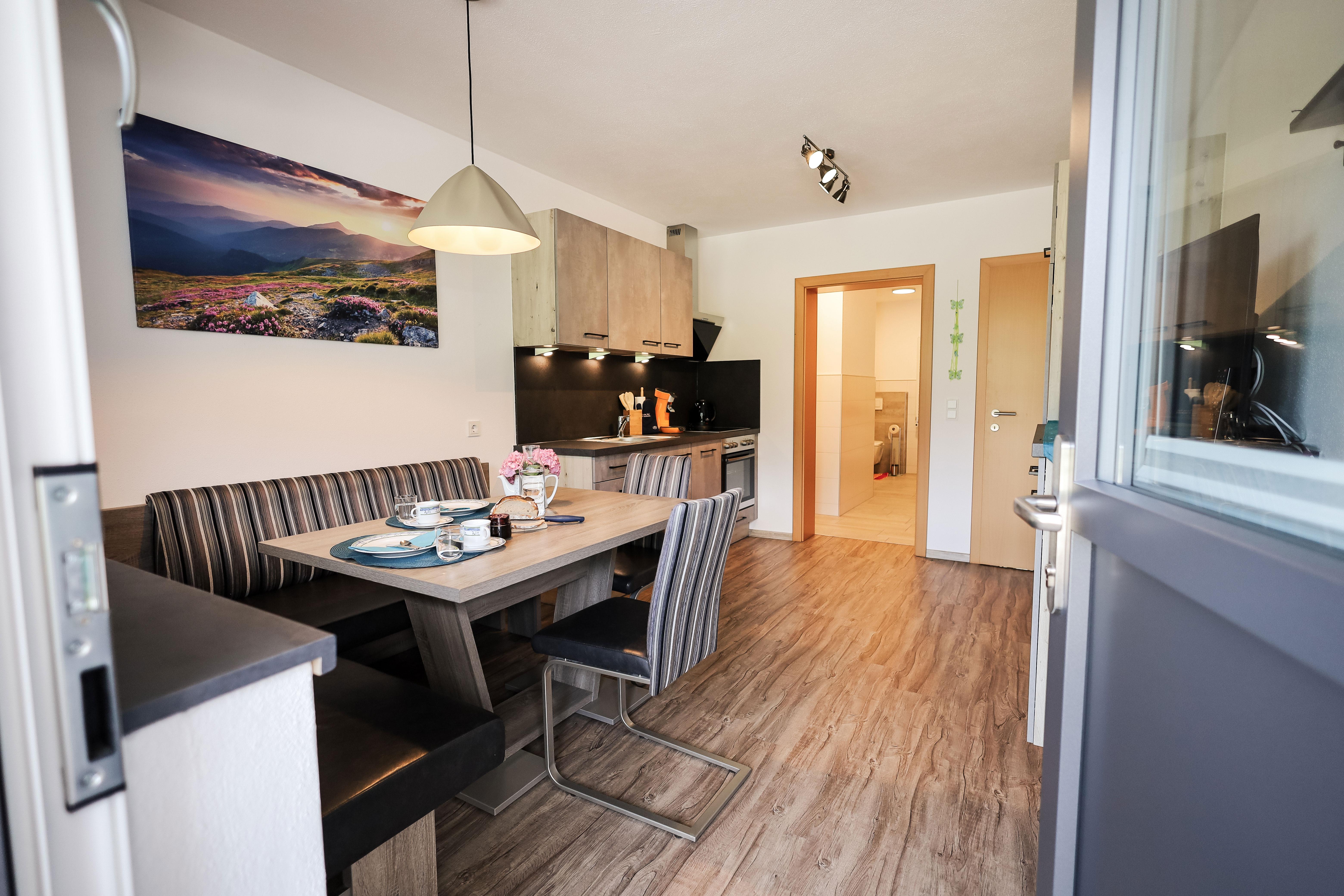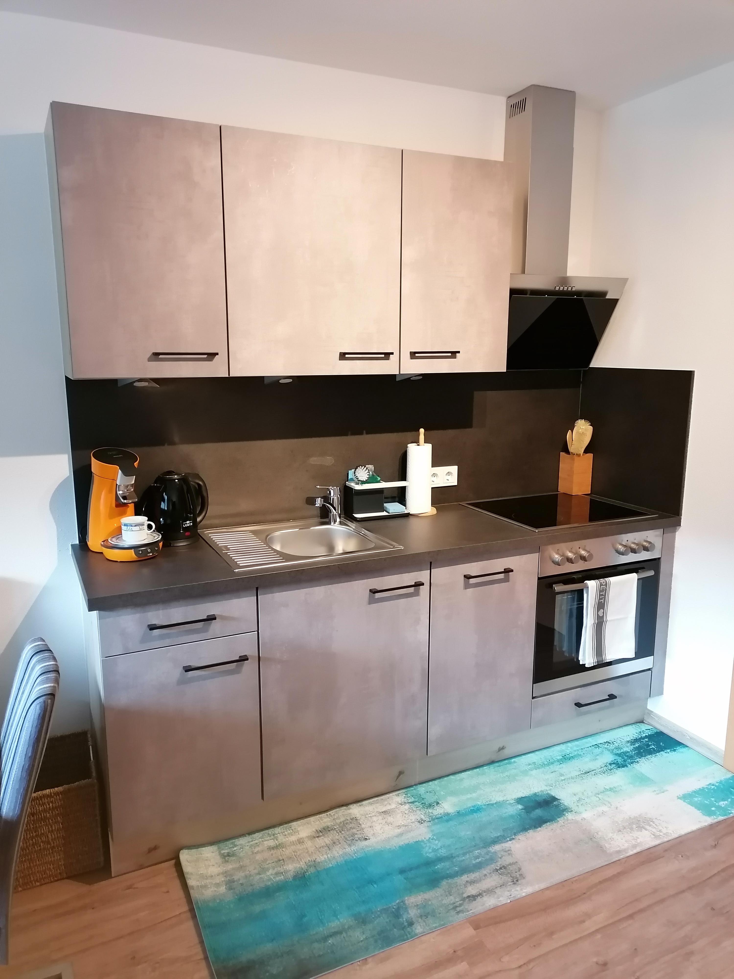 • Wohnküche ausgestattet mit Sitzecke, Sat-TV, Kühlschrank mit Gefrierfach, E-Herd, Backofen, Geschirrspüler, Kaffeemaschine und Wasserkocher