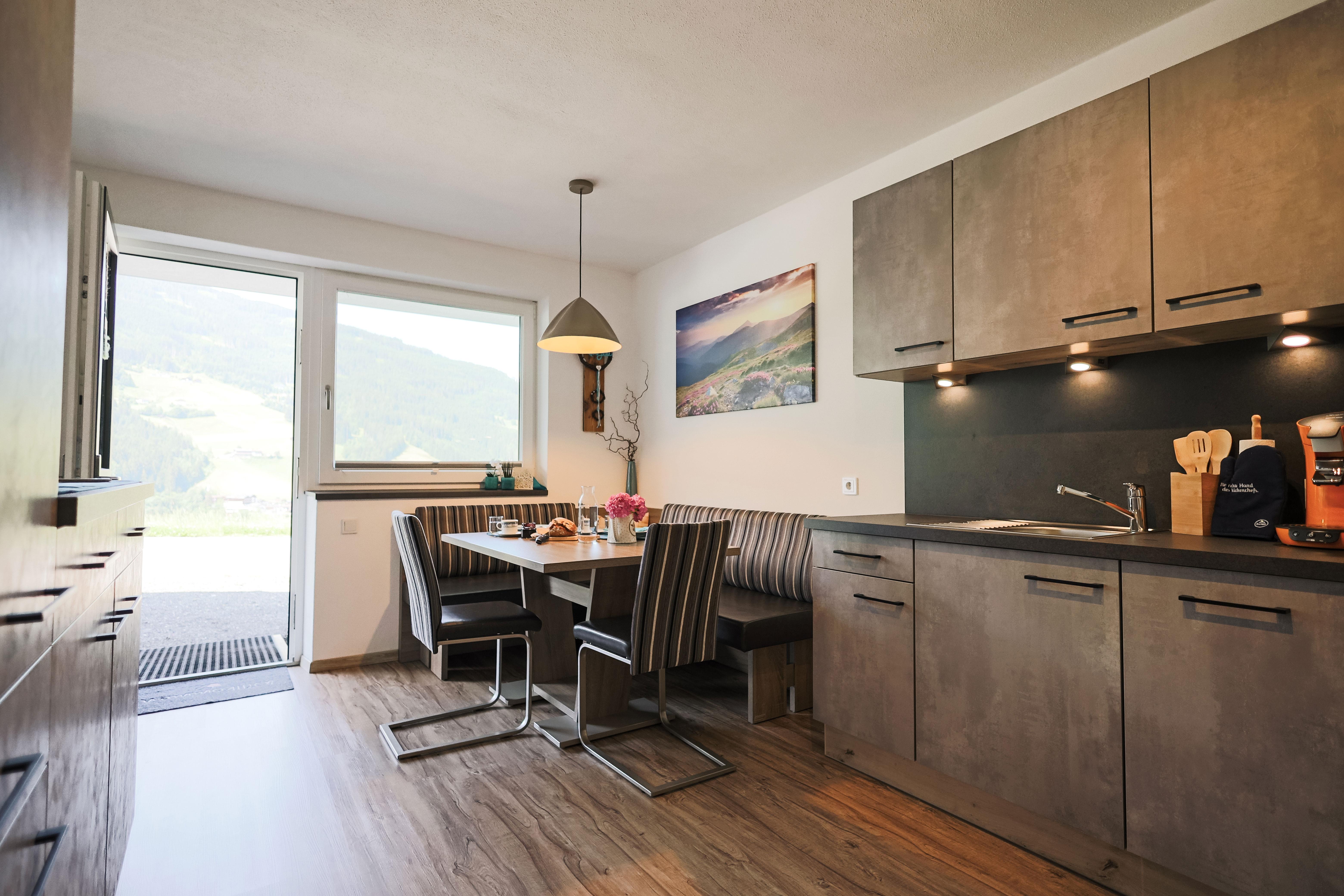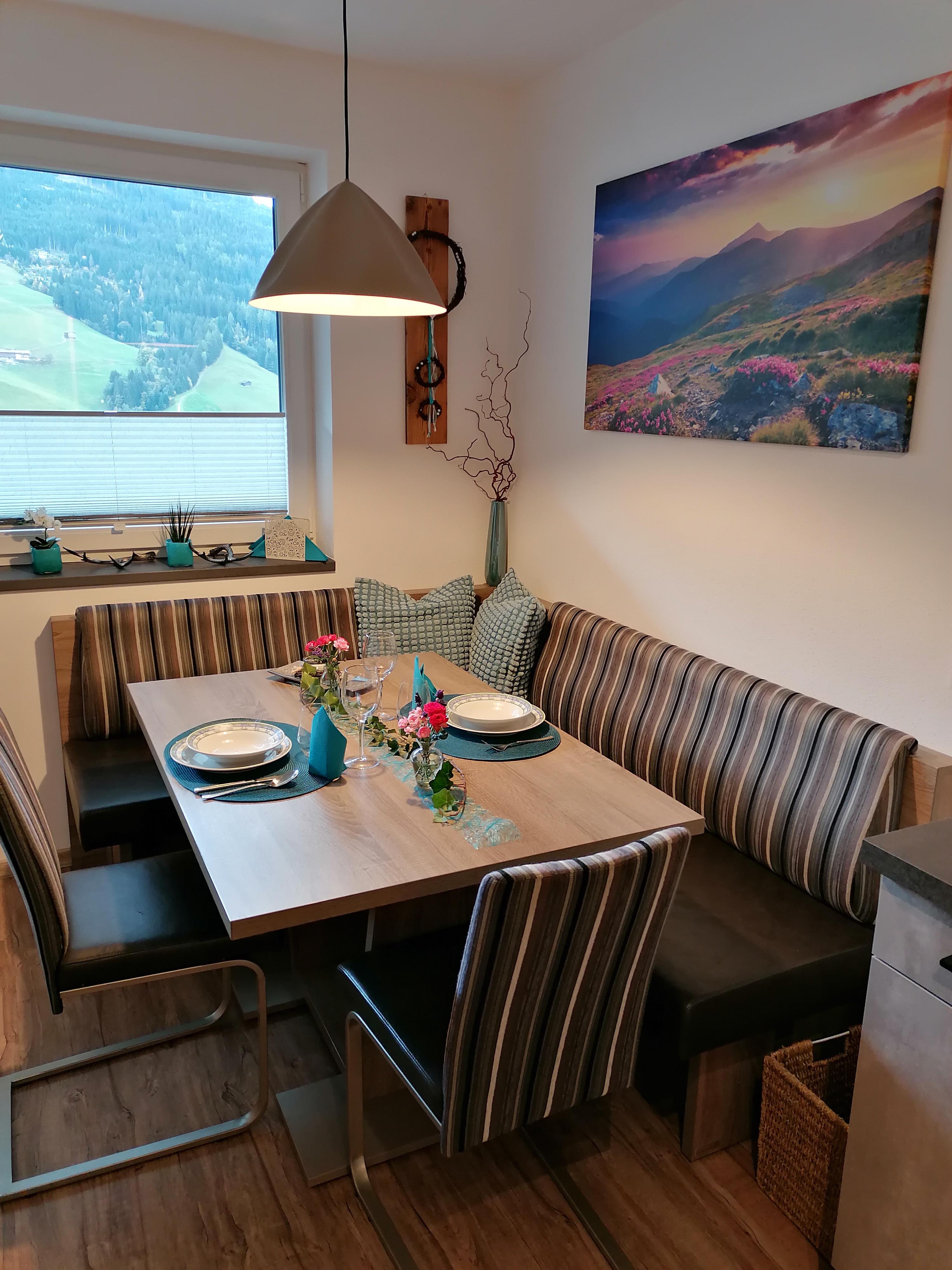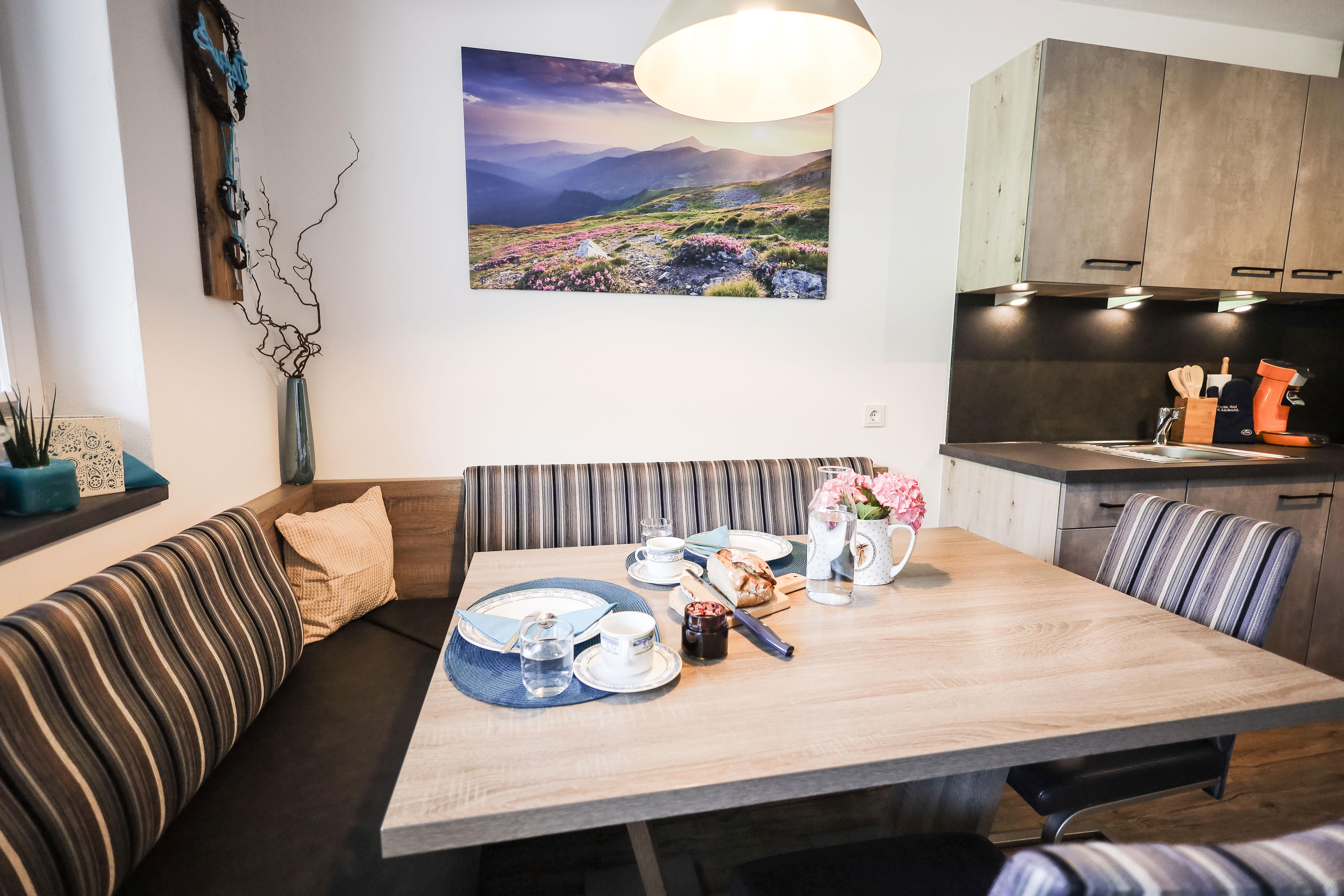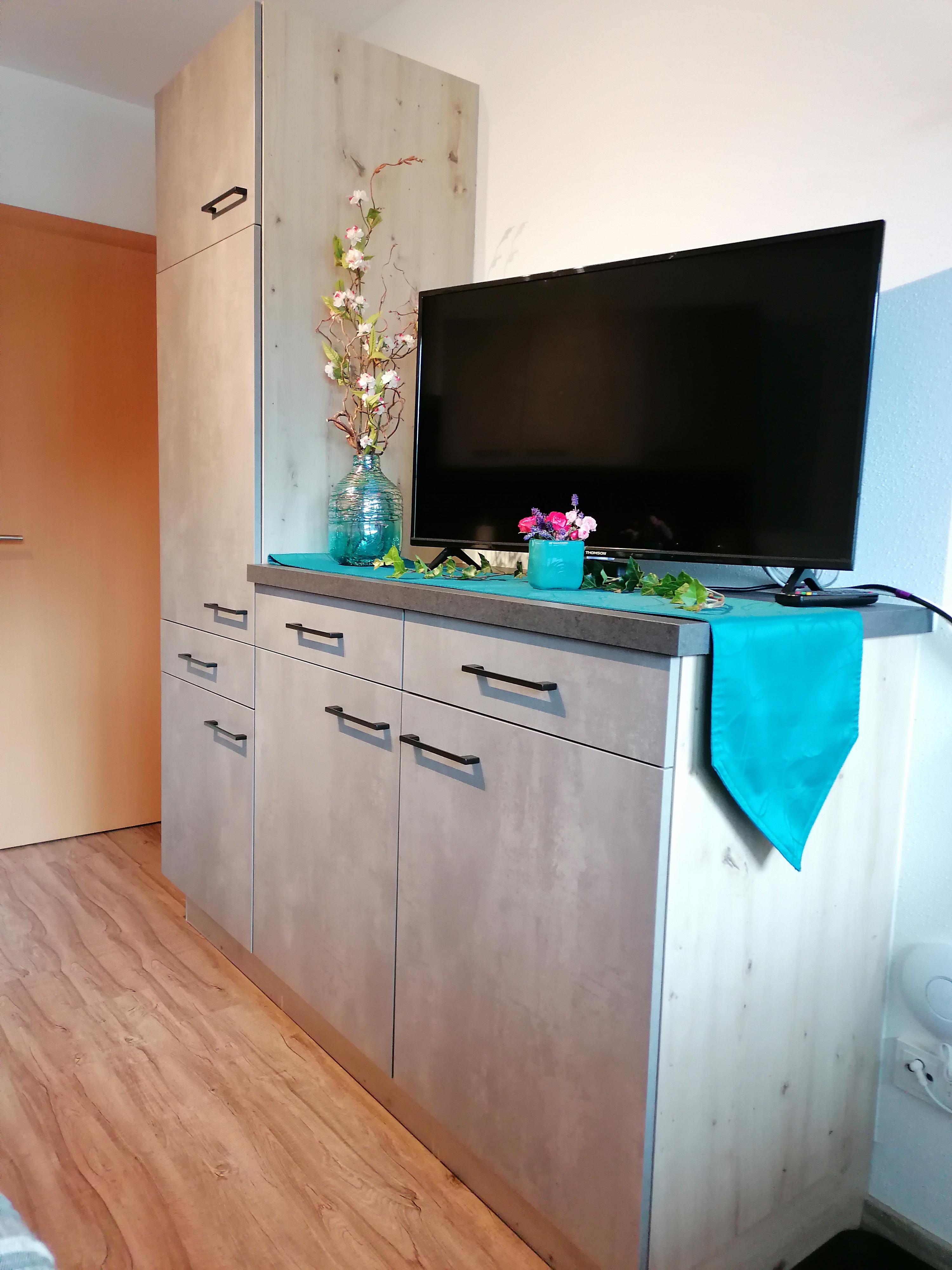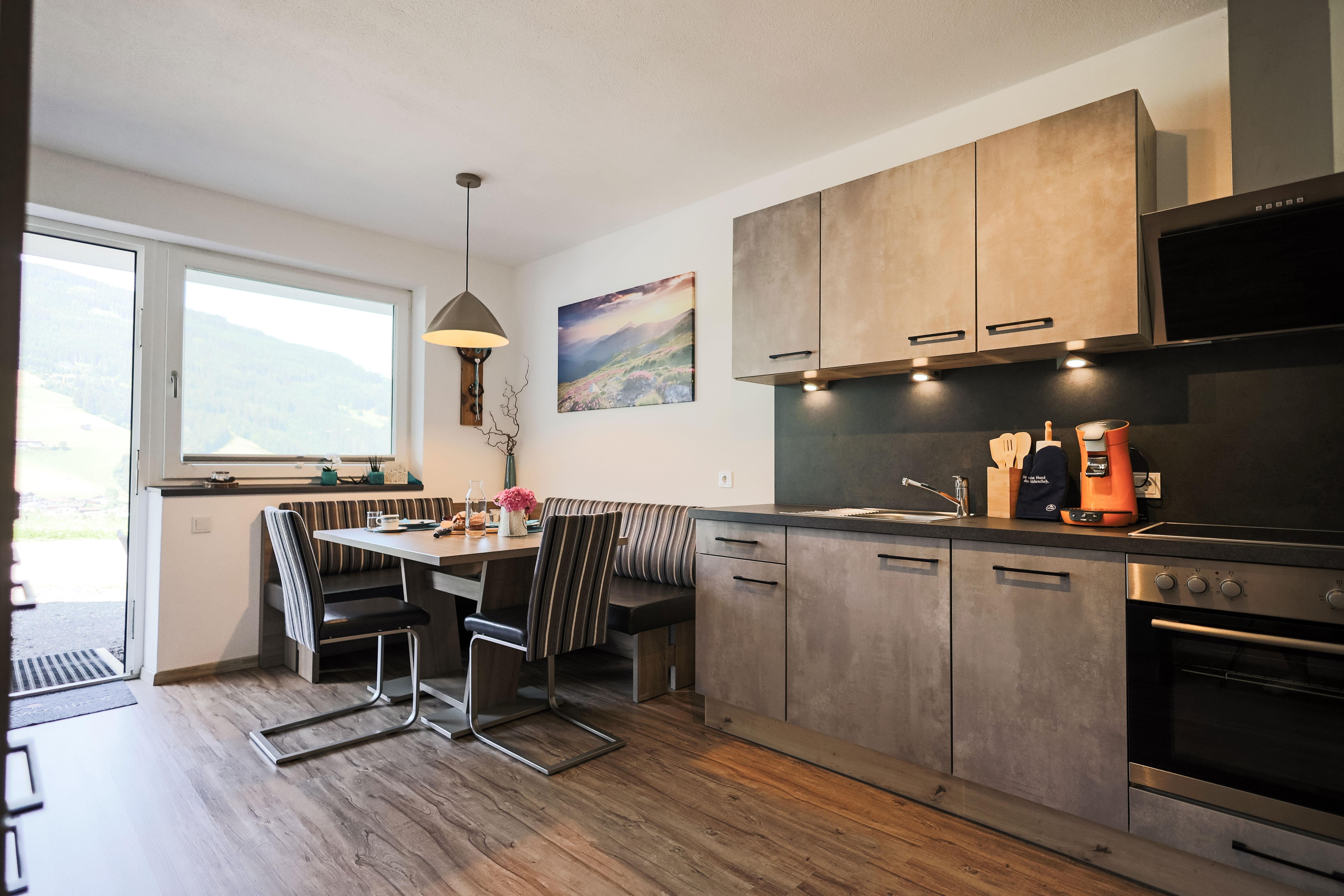 • Wohnküche ausgestattet mit Sitzecke, Sat-TV, Kühlschrank mit Gefrierfach, E-Herd, Backofen, Geschirrspüler, Kaffeemaschine und Wasserkocher