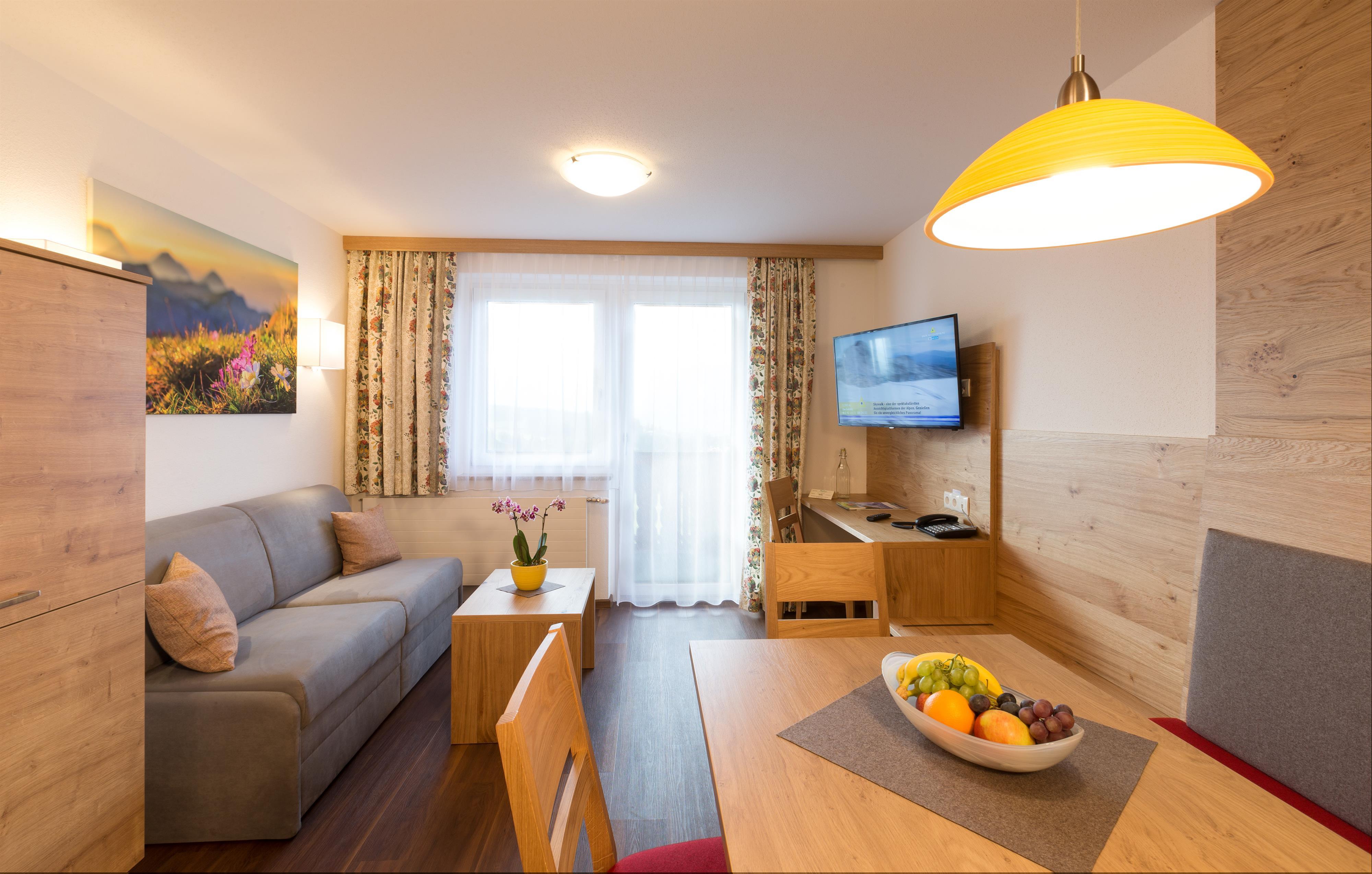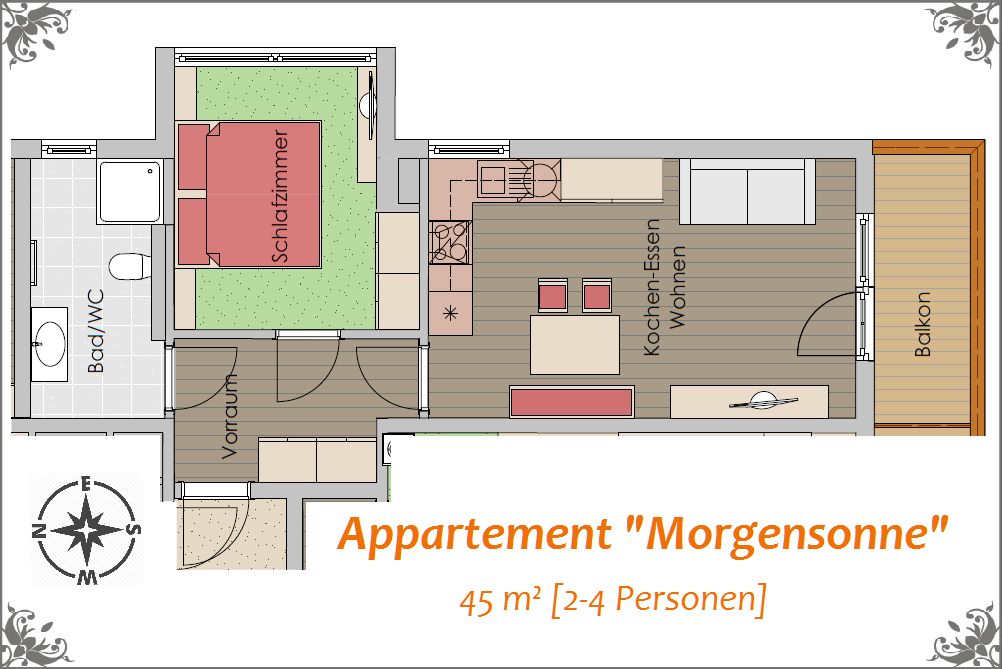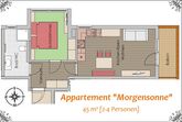 Unser Appartement MORGENSONNE bietet 45 m². Lassen Sie sich im gemütlichen Schlafzimmer von der Morgensonne wecken. Helles, modernes und geräumiges Bad mit Dusche & WC. Herzstück ist die voll ausgestattete Küche mit geschmackvollem Wohnraum, welcher zum Verweilen einlädt. Genießen Sie den Blick vom Balkon mit atemberaubendem Panorama auf die Schladminger Tauern. Standardbelegung: 2 Personen, maximal 4 Personen (Couchbett)