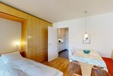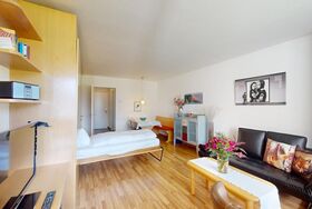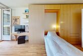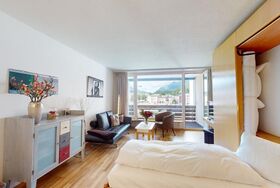 Zweckmässige, helle 1 - Zimmer-Ferienwohnung im 3. Obergeschoss. Wohn- /Esszimmer mit 2 integrierten Schrankbetten 80 x 200. Überdachter Balkon mit Aussicht. Kleine Küche. Ein Lift im Ferienhaus erleichtert den Zugang, und Sie profitieren von einem Parkplatz in einer Garagenbox. Für aktive Gäste steht ein Fitnessraum zur öffentlichen Nutzung im Ferienhaus zur Verfügung.