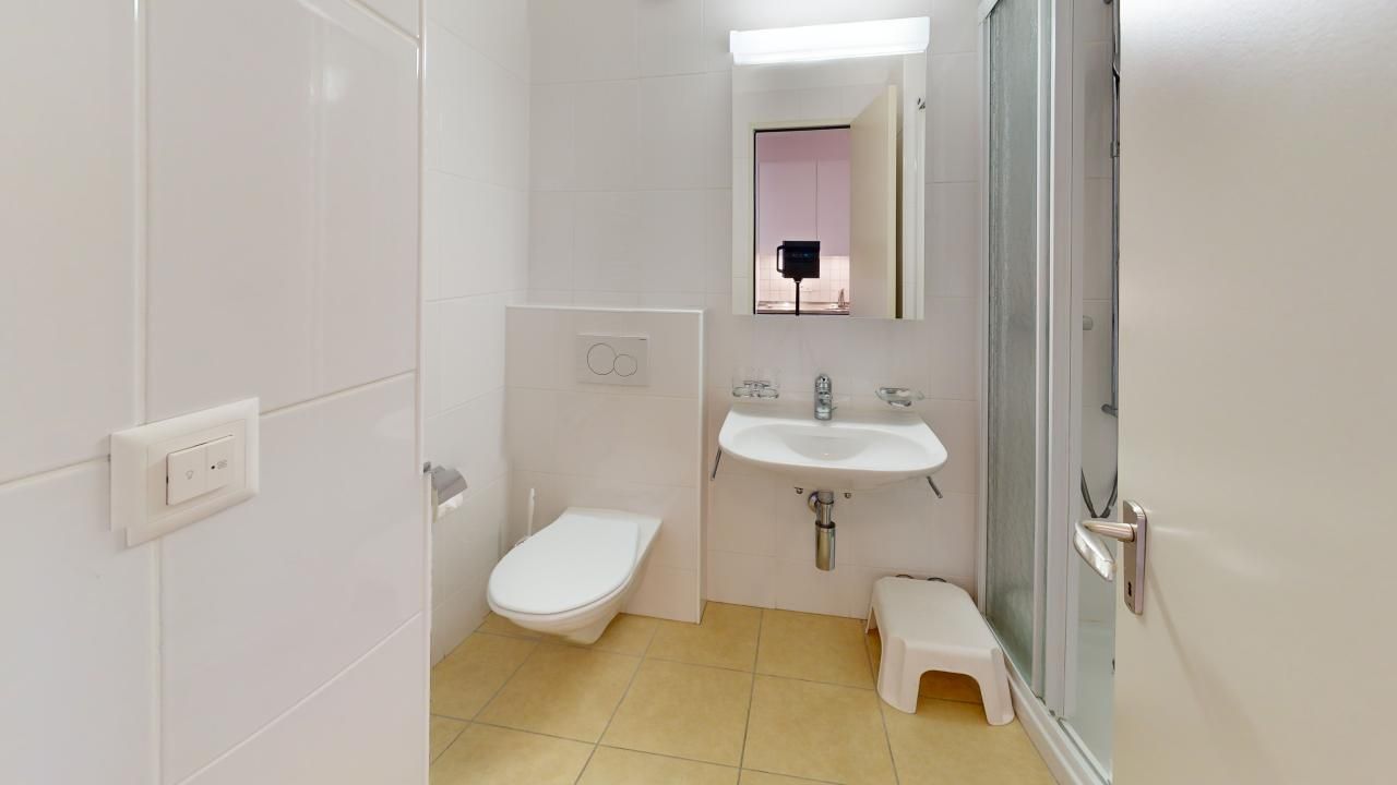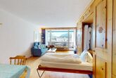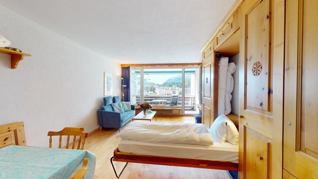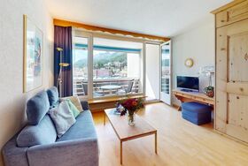 Gemütliche 1-Zimmer-Ferienwohnung im 4. Obergeschoss, eingerichtet im traditionellen Engadiner Stil. Wohn- /Esszimmer mit 2 integrierten Schrankbetten 80 x 200. Überdachter Balkon mit Aussicht. Kleine Küche. Bad mit Dusche. Beschränkte Anzahl Aussenparkplätze (max. 1 Auto/Wohnung, nicht reserviert). Fitnessraum zur öffentlichen Nutzung befindet sich im Ferien-Wohnhaus.