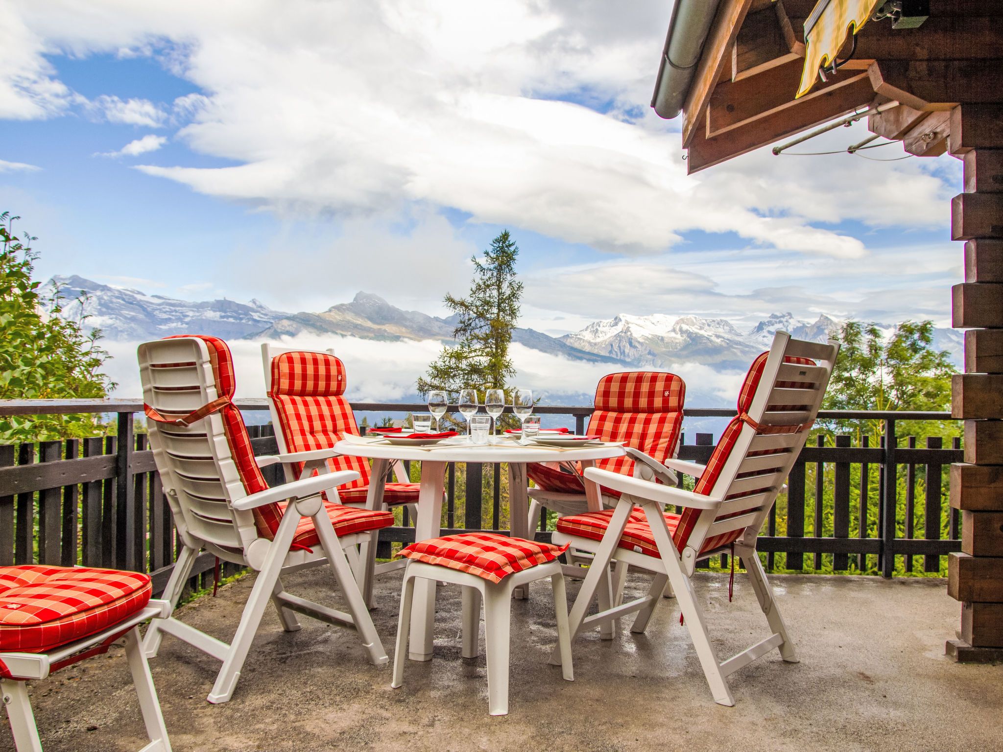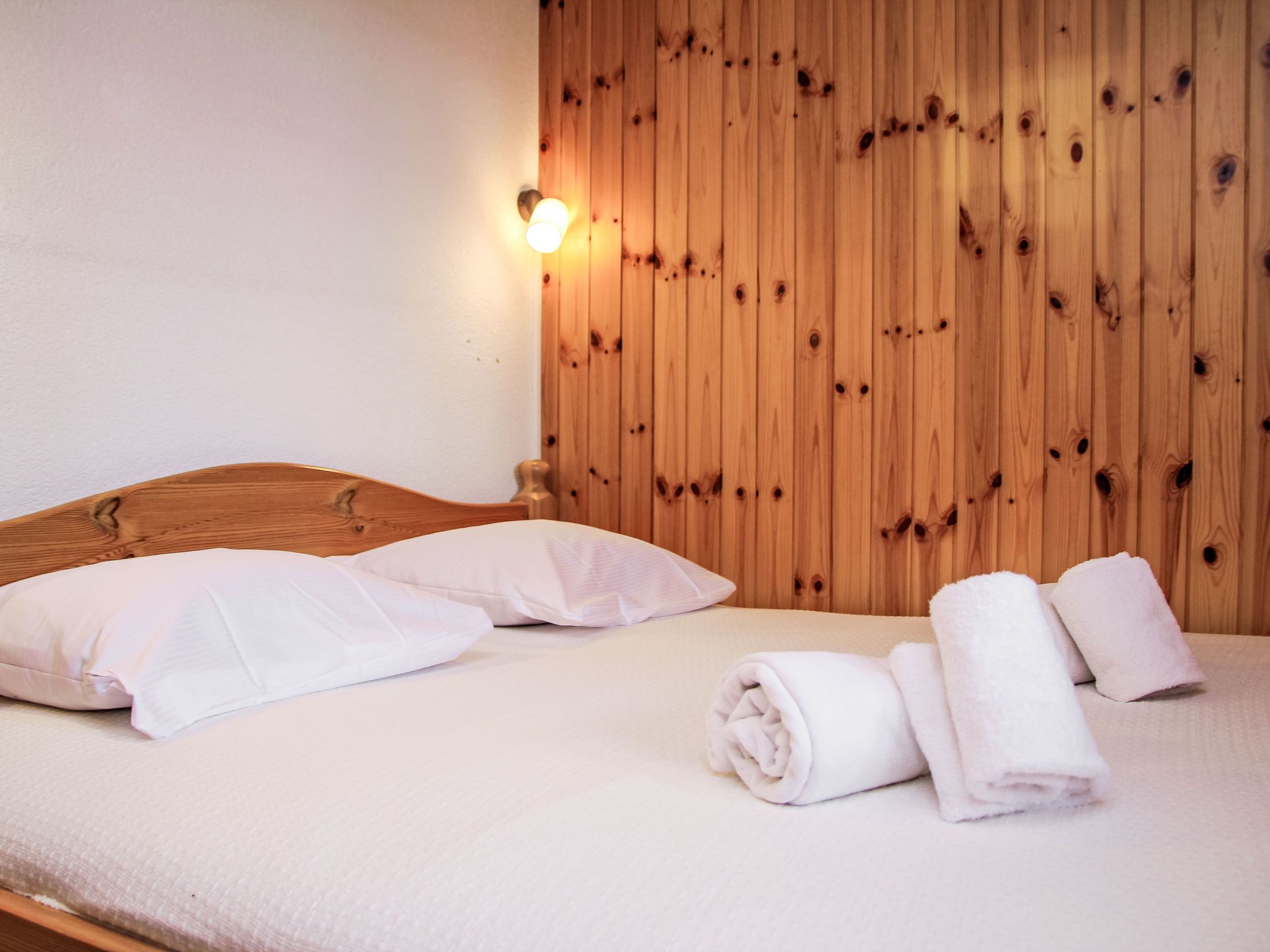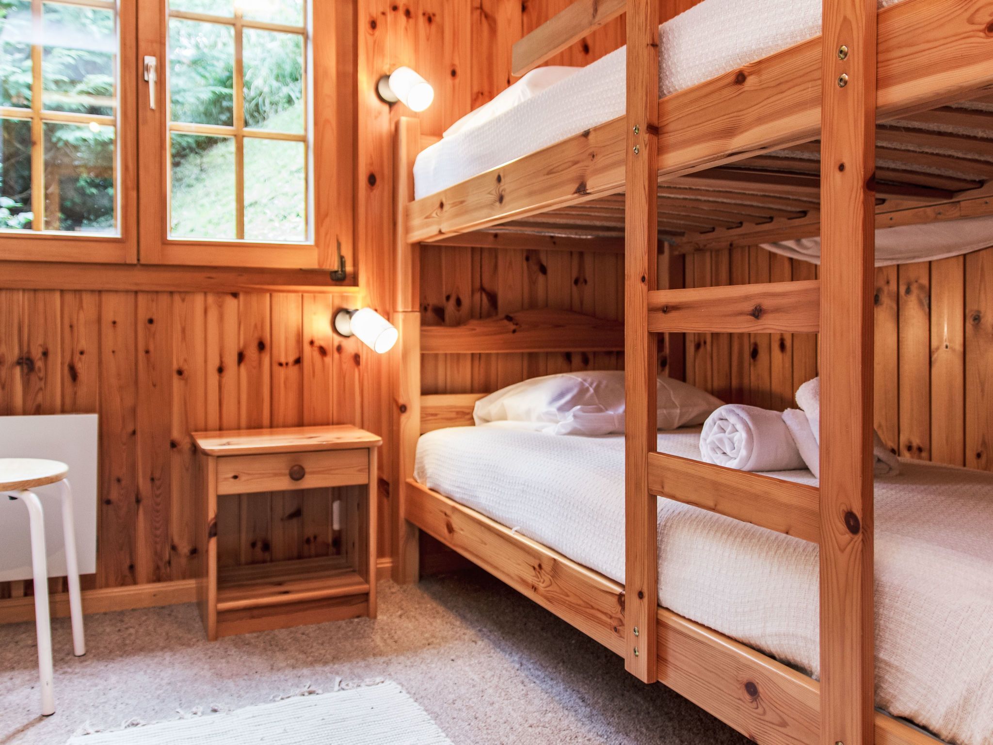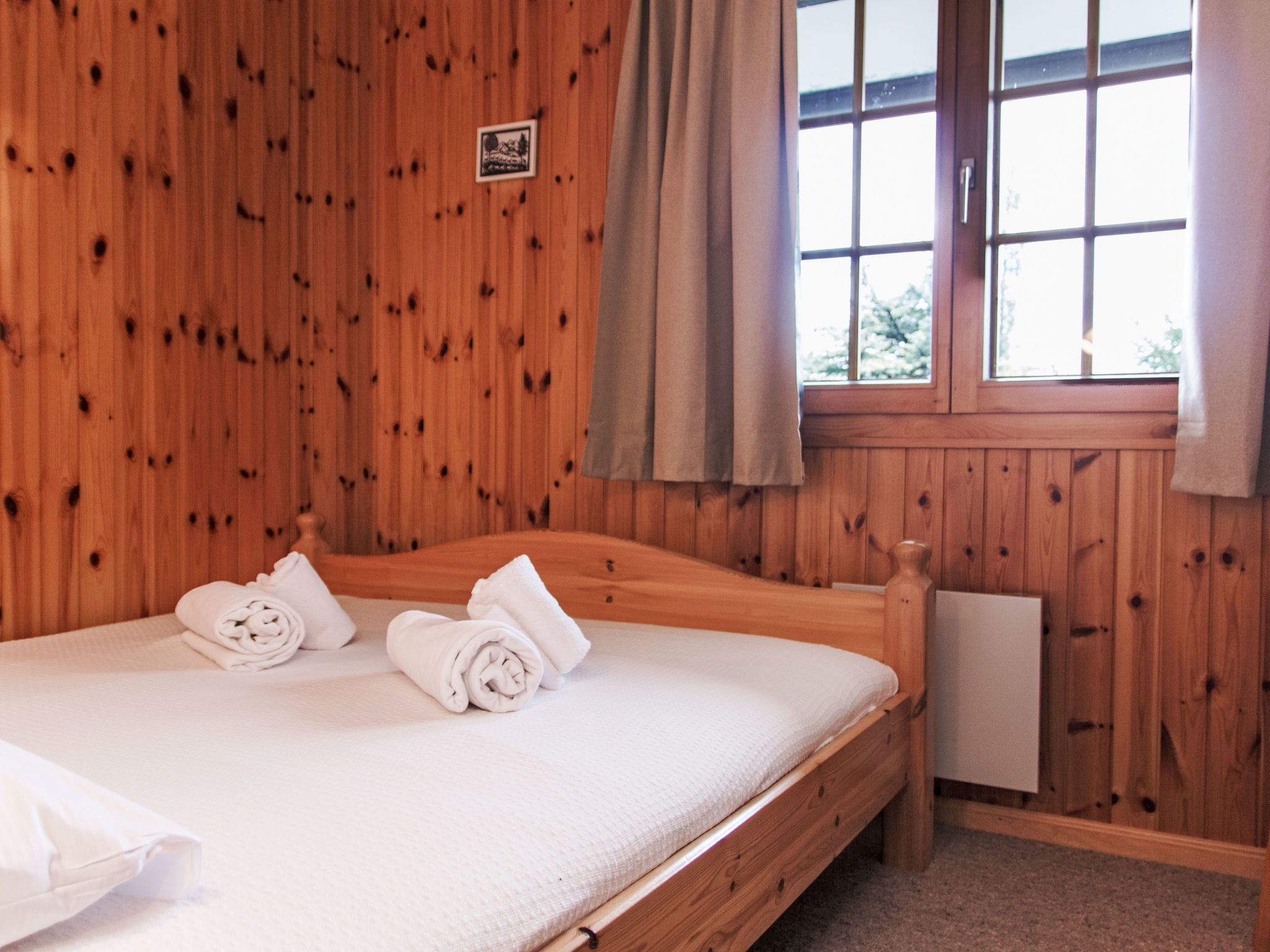 Chalet Soleil, 4-Zimmer-Chalet 80 m2 auf 2 Stockwerken. Komfortabel und schön eingerichtet: Eingang. Wohn-/Esszimmer mit offenem Kamin und Kabel-TV. Ausgang zur Terrasse, Richtung Osten. Offene Küche (4 Kochplatten, Backofen, Geschirrspüler, Toaster, Wasserkocher, Mikrowelle, elektrische Kaffeemaschine, Racletteofen, Fondue Set (Käse)). Sep. WC. E-Heizung. Unteres Geschoss: 1 Zimmer mit 1 franz. Bett (160 cm, Länge 200 cm). 1 Zimmer mit 1 franz. Bett (160 cm, Länge 200 cm). 1 Zimmer mit 1 x 2 Etagenbetten (90 cm, Länge 190 cm). Bad/WC. Balkon, Nordlage, Terrasse, Ostlage. Terrassenmöbel. Sehr schöne Sicht auf die Berge und das Tal. Zur Verfügung: Waschmaschine, Haartrockner. Internet (WLAN, gratis). Parkplatz (1 Auto), Garage (1 Auto). Bitte beachten: Nichtraucher-Unterkunft.