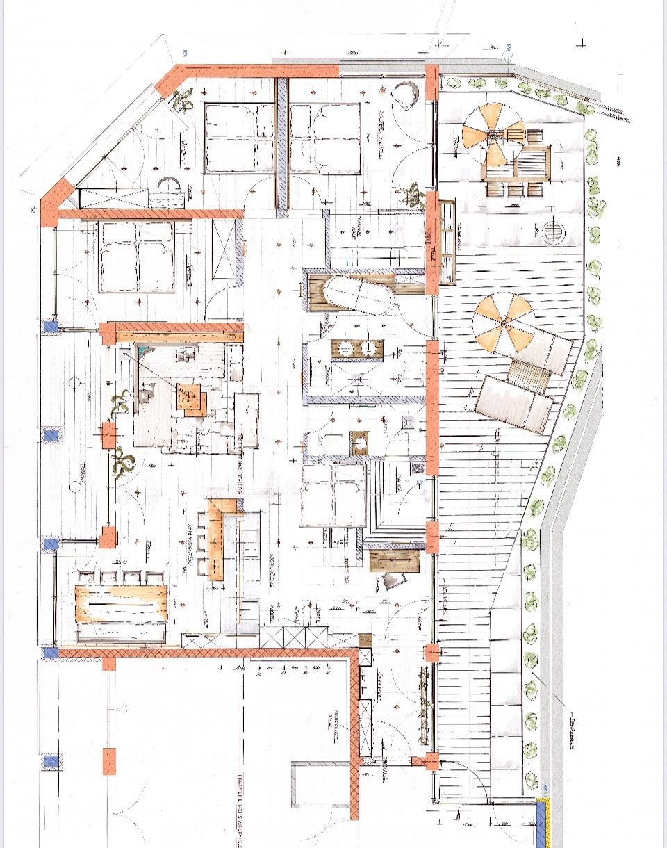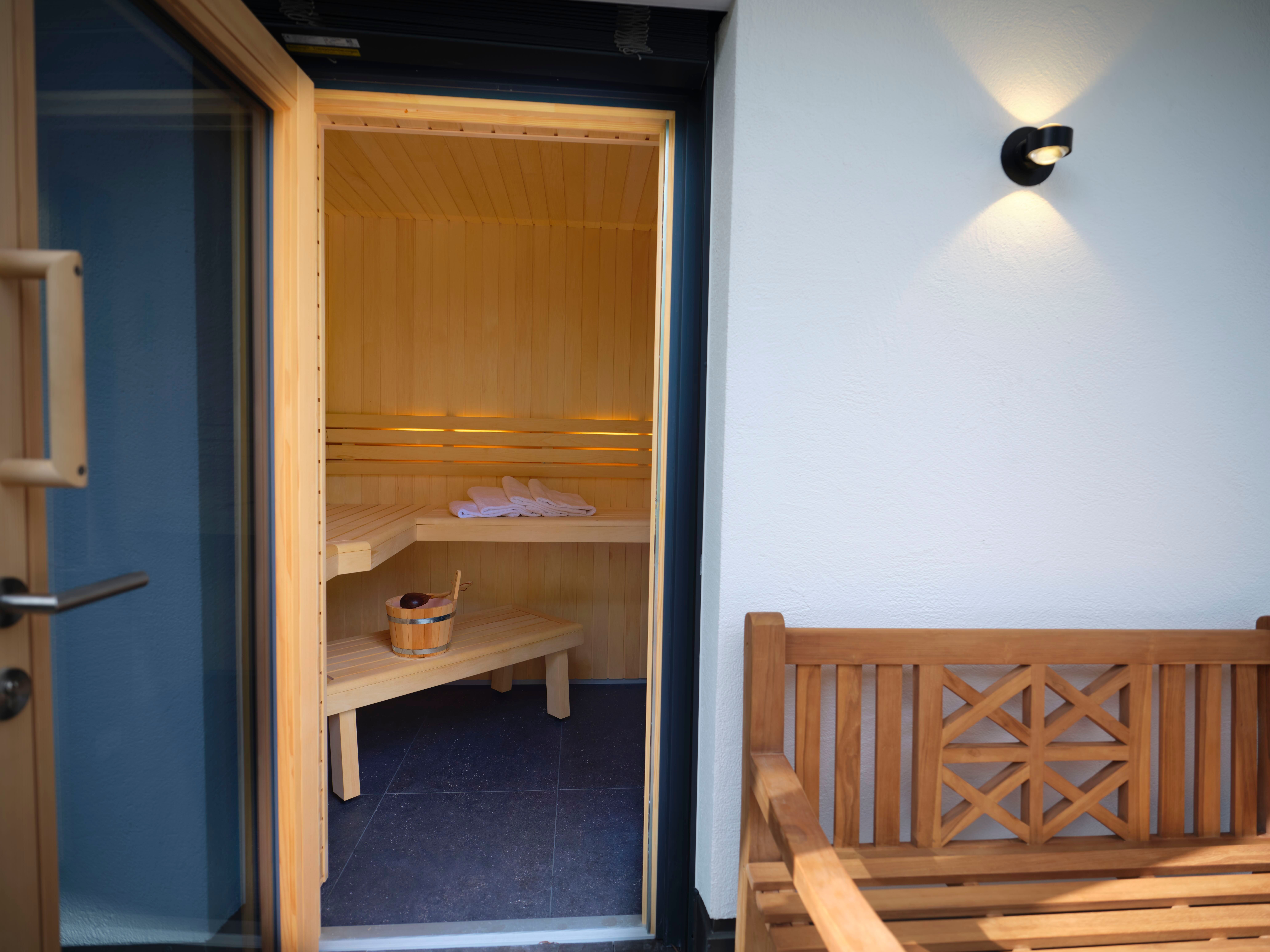 Drei Schlafzimmer, zwei Bäder, eine private Sauna und eine maßgefertigte Kücheninsel bieten viel Komfort. Das Hauptbad verfügt über Wanne, Dusche und Bidet. Die Sauna hat eine Innen- und eine Außendusche. Loggia und die große Terrasse laden ein zum Frühstück in der Sonne oder zum Aperitif am Abend. Drinnen wie draußen finden bis zu acht Personen Platz an den großen Esstischen. Die Einrichtung wurde im modernen, alpenländischen Stil vom Schreiner gefertigt.
