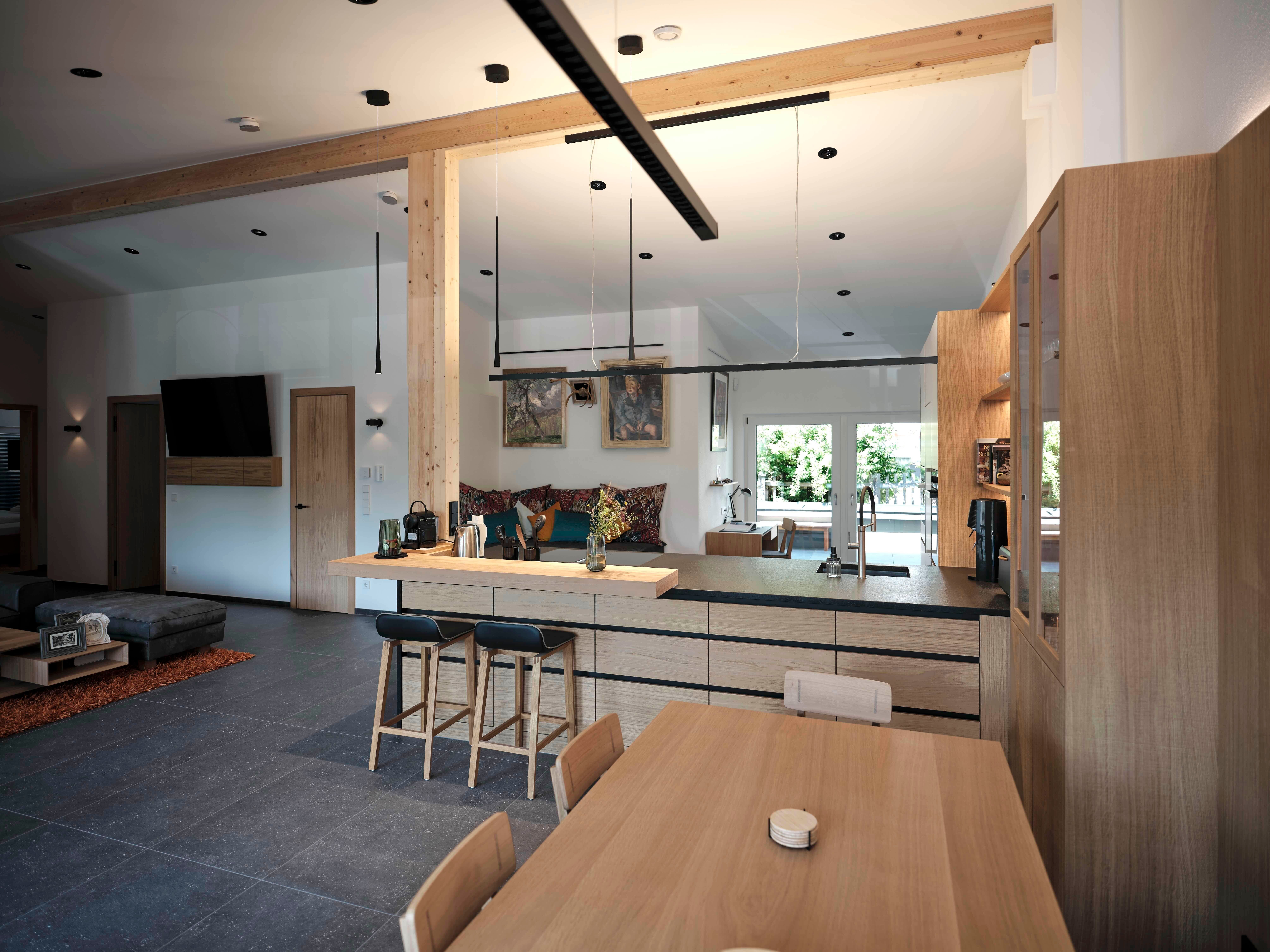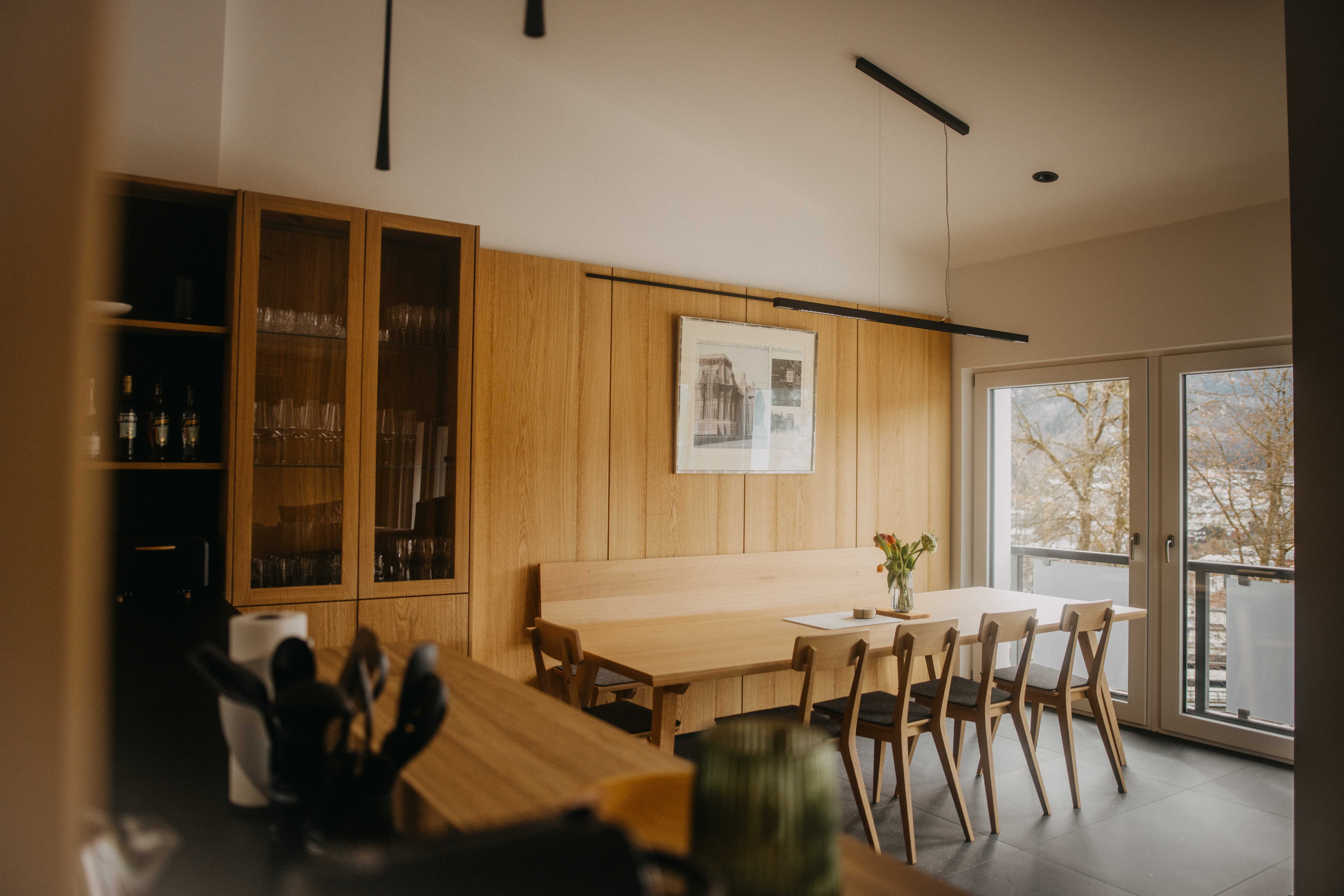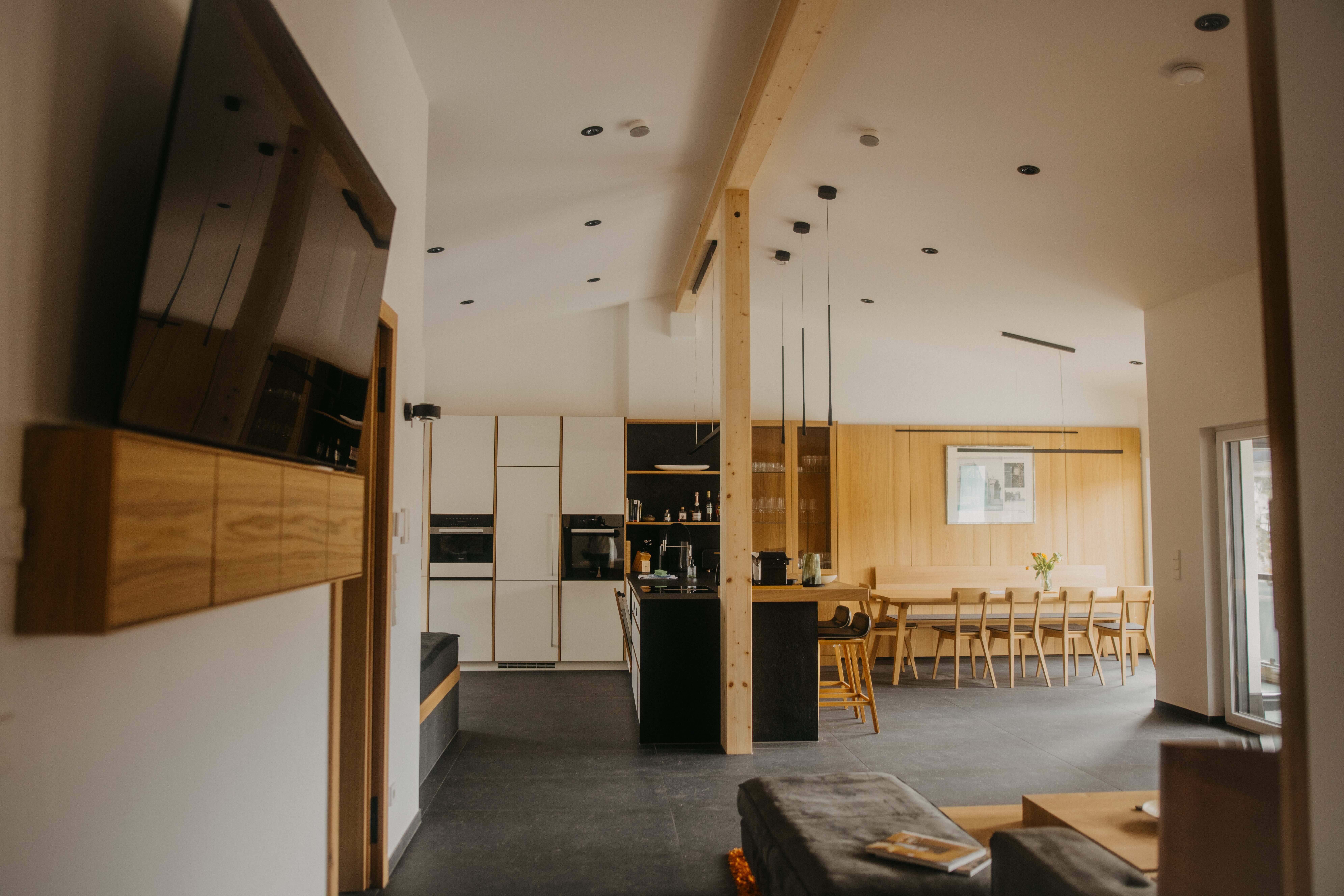 Unser Penthouse liegt im zweiten Stock eines hochwertigen Neubaus und ist barrierearm über den Aufzug erreichbar. Bodentiefe Fenster öffnen den Blick auf die Berge. Hohe Decken, sichtbare Holzelemente und ein stimmiges Lichtkonzept schaffen ein offenes Raumgefühl im Stil eines modernen Chalets.