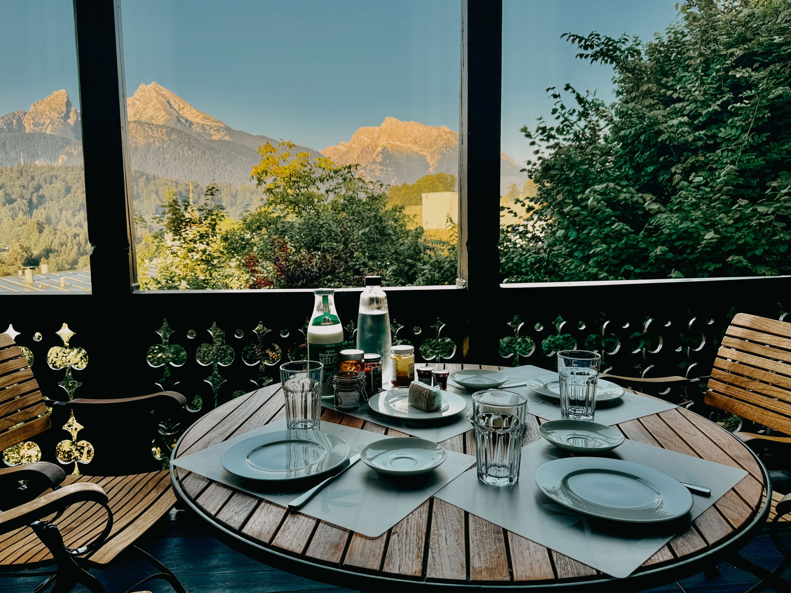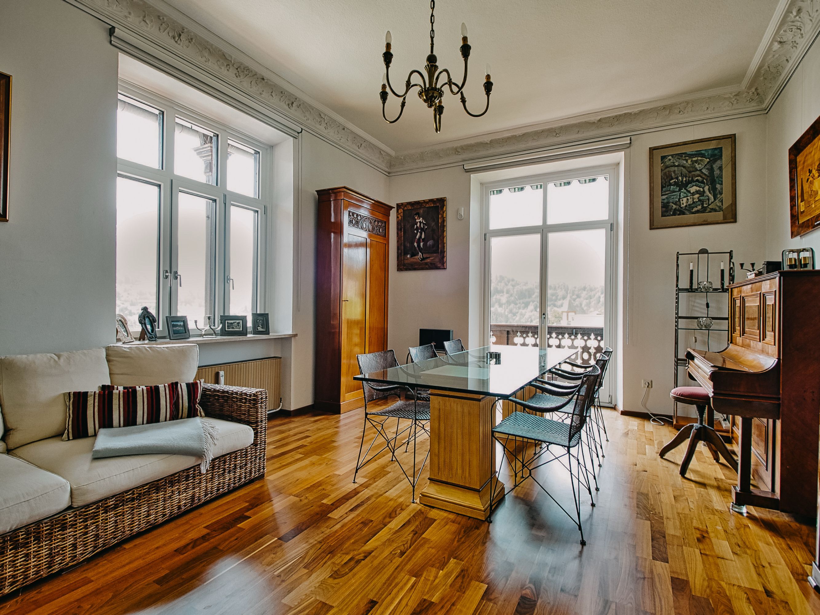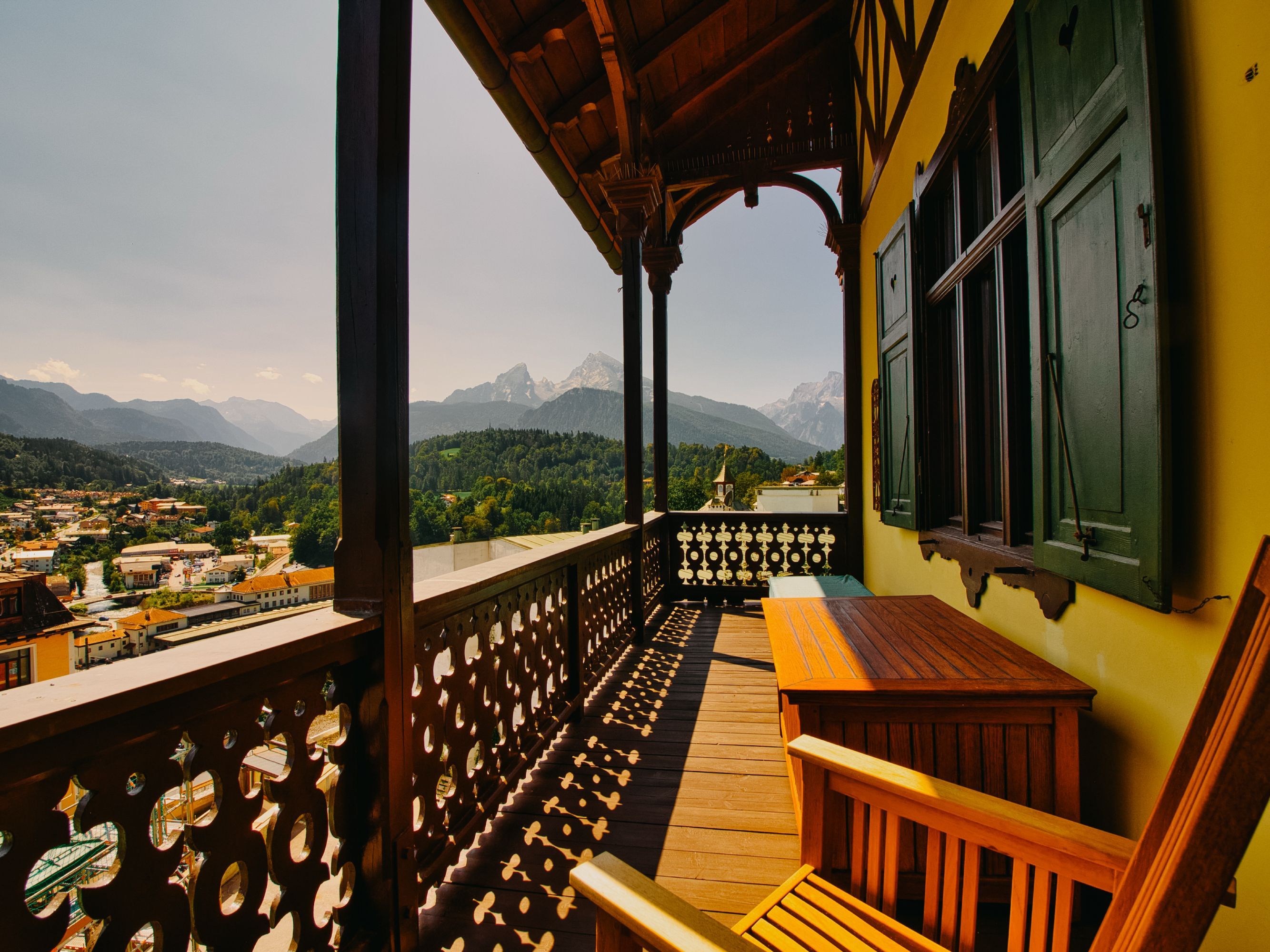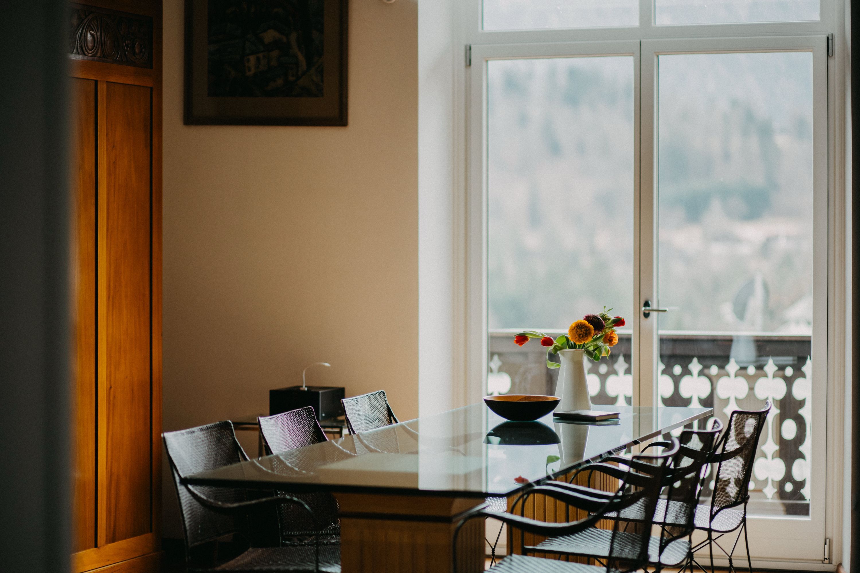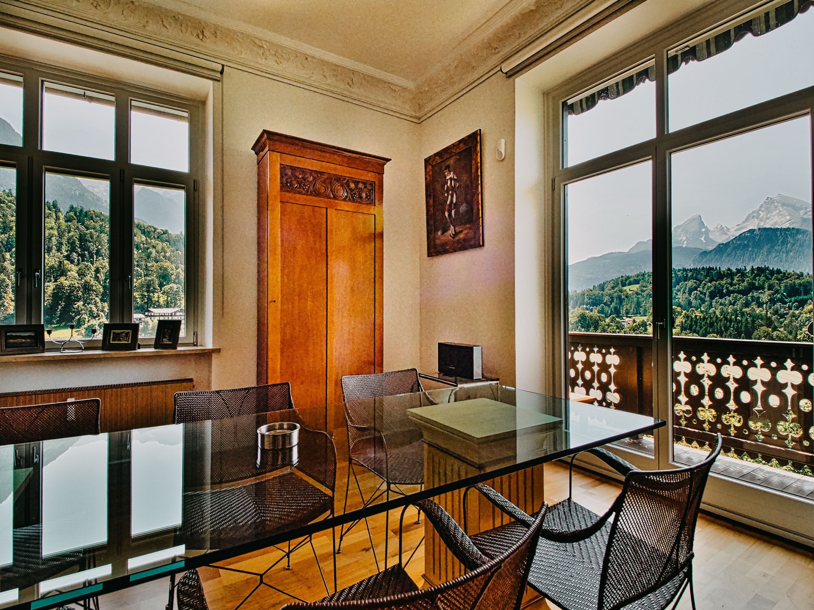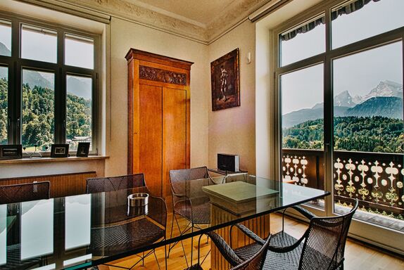 Unser Apartment liegt im ersten Stock einer Villa im alpinen Jugendstil aus dem Jahr 1899. Ein Aufzug ist vorhanden. Hohe Stuckdecken, Holzfußböden, ausgesuchte Kunst und harmonische Einrichtung sorgen für eine besondere Atmosphäre. Große Fenster geben den Blick auf die Berchtesgadener Alpen frei. Licht, Landschaft und Jahreszeiten werden Teil des Raumes.