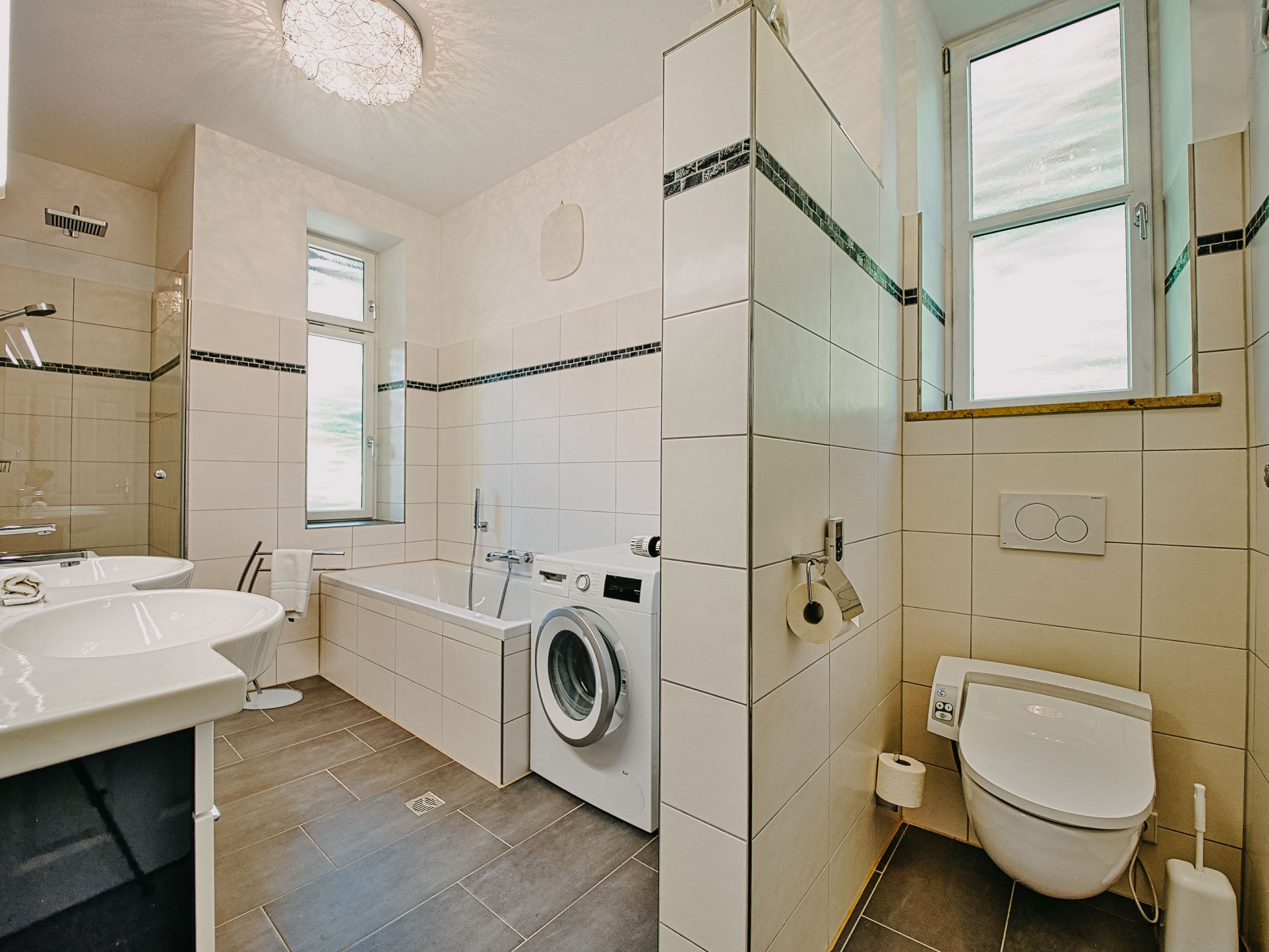 Das Wohnzimmer mit antikem Kronleuchter ist das Herz der Wohnung. Zwei Schlafzimmer, ein Tageslichtbad und eine separate Wohnküche mit Loggia bieten Raum für Rückzug und Begegnung. Der große Glastisch im Wohnzimmer spiegelt den Watzmann, ein Platz für Gespräche und Genuss.