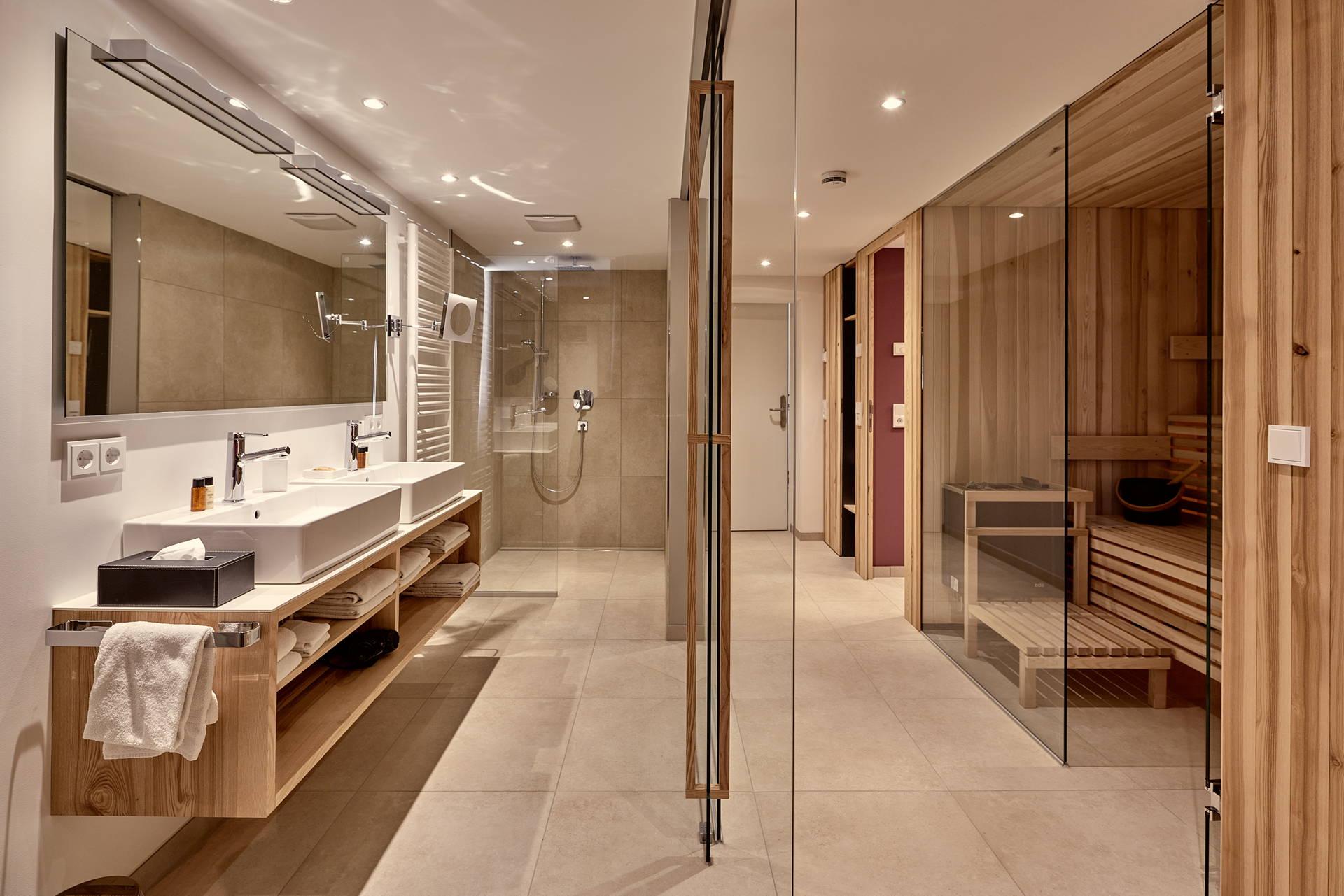 Verbringen Sie entspannte Abende in alpenländischer Atmosphäre vor Ihrem knisternden Kaminfeuer, oder in Ihrer Privatsauna. Die hochwertigen Design-Bäder sind mit Dusche und WC ausgestattet.