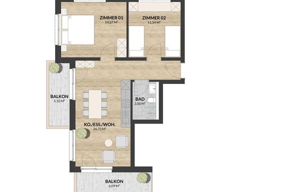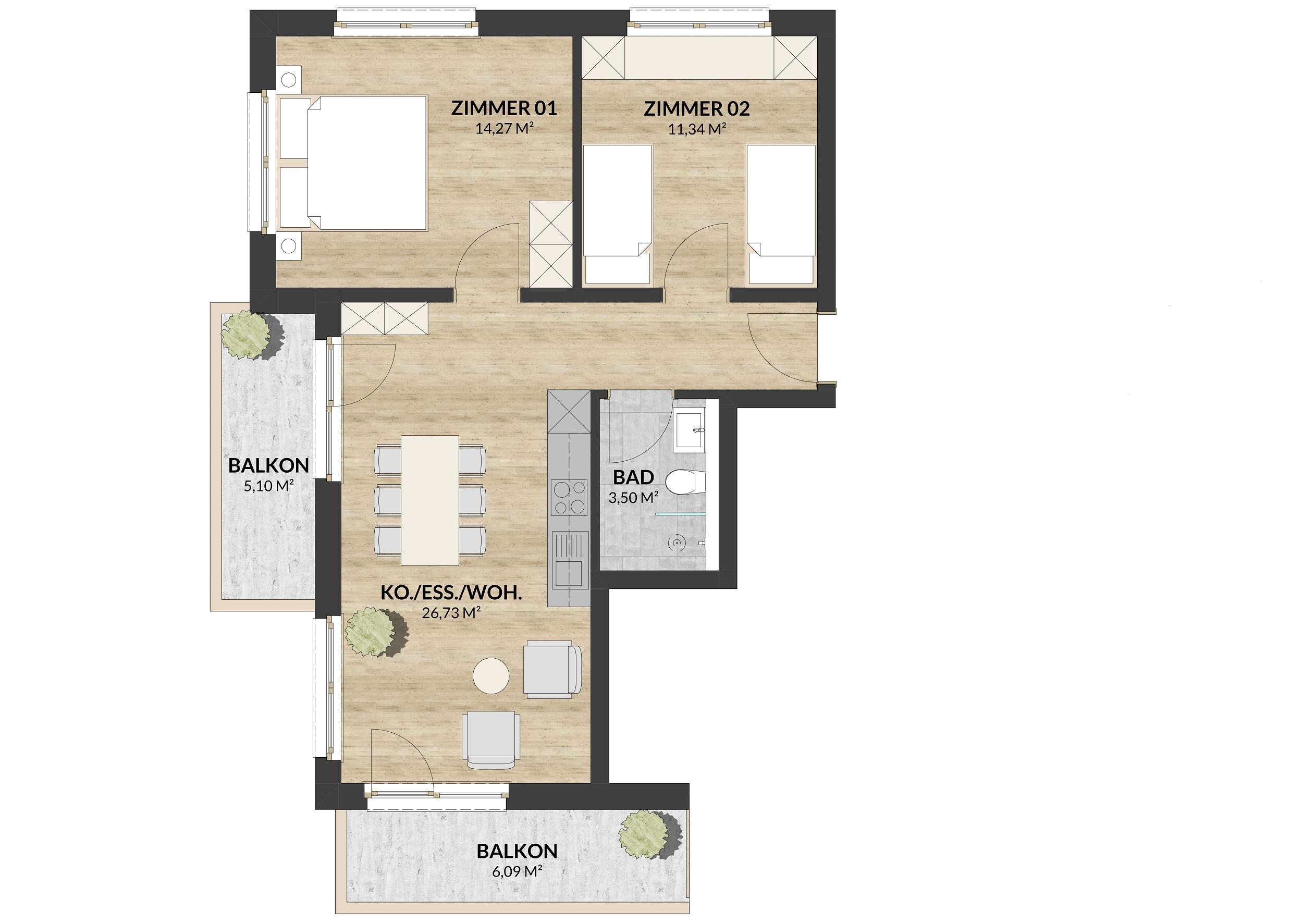 Top 5 mit ca. 56 m² und Balkon: 1 Doppelzimmer, 1 Zweibettzimmer, 1 Badezimmer mit Dusche/WC; vollausgestattete Wohnküche mit Kombi-Backrohr, Cerankochfeld, Geschirrspül- und Kaffeemaschine, Kühlschrank, gemütlicher Esstisch, Sitzbereich mit Kabel-TV uvm.