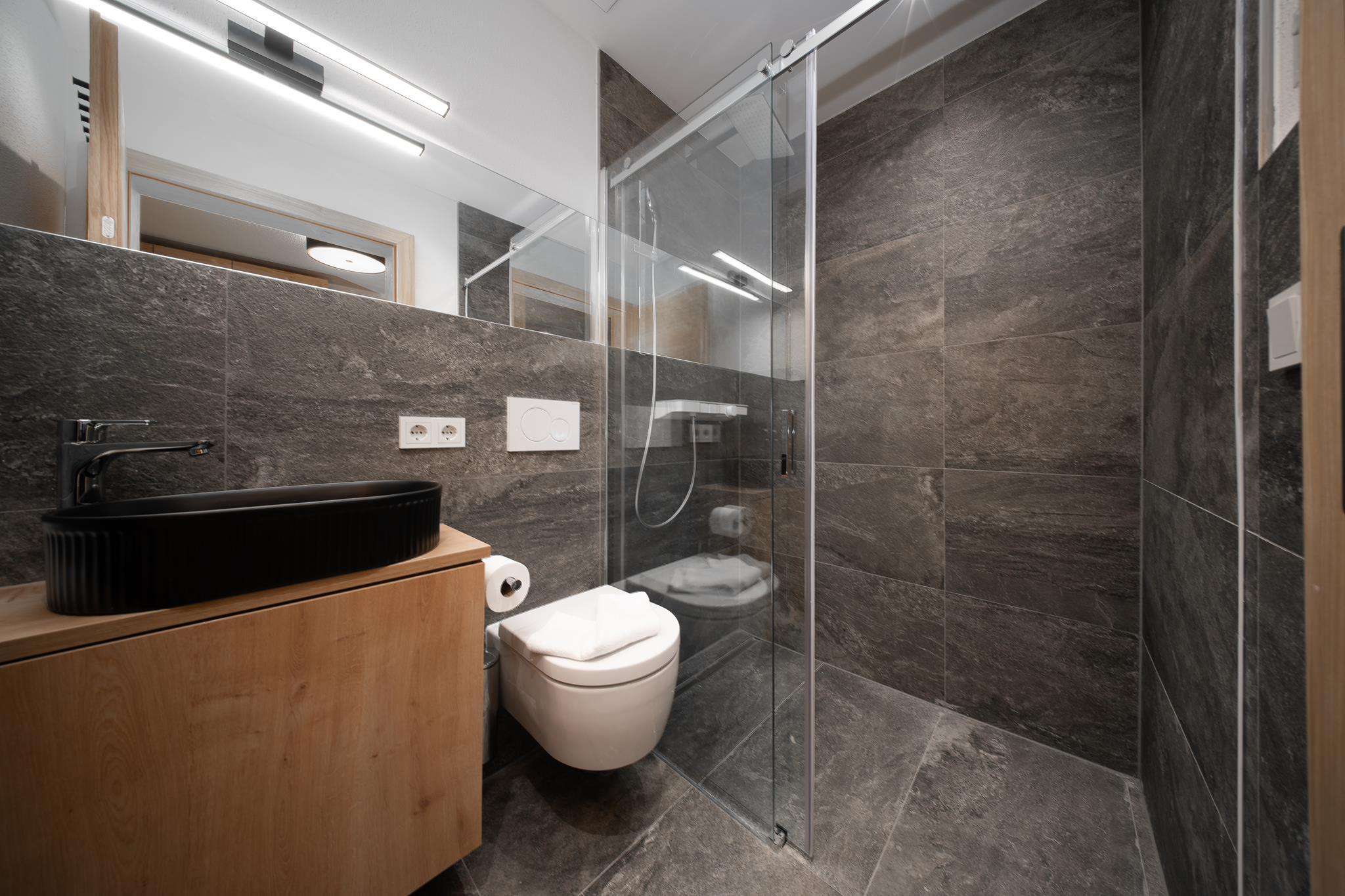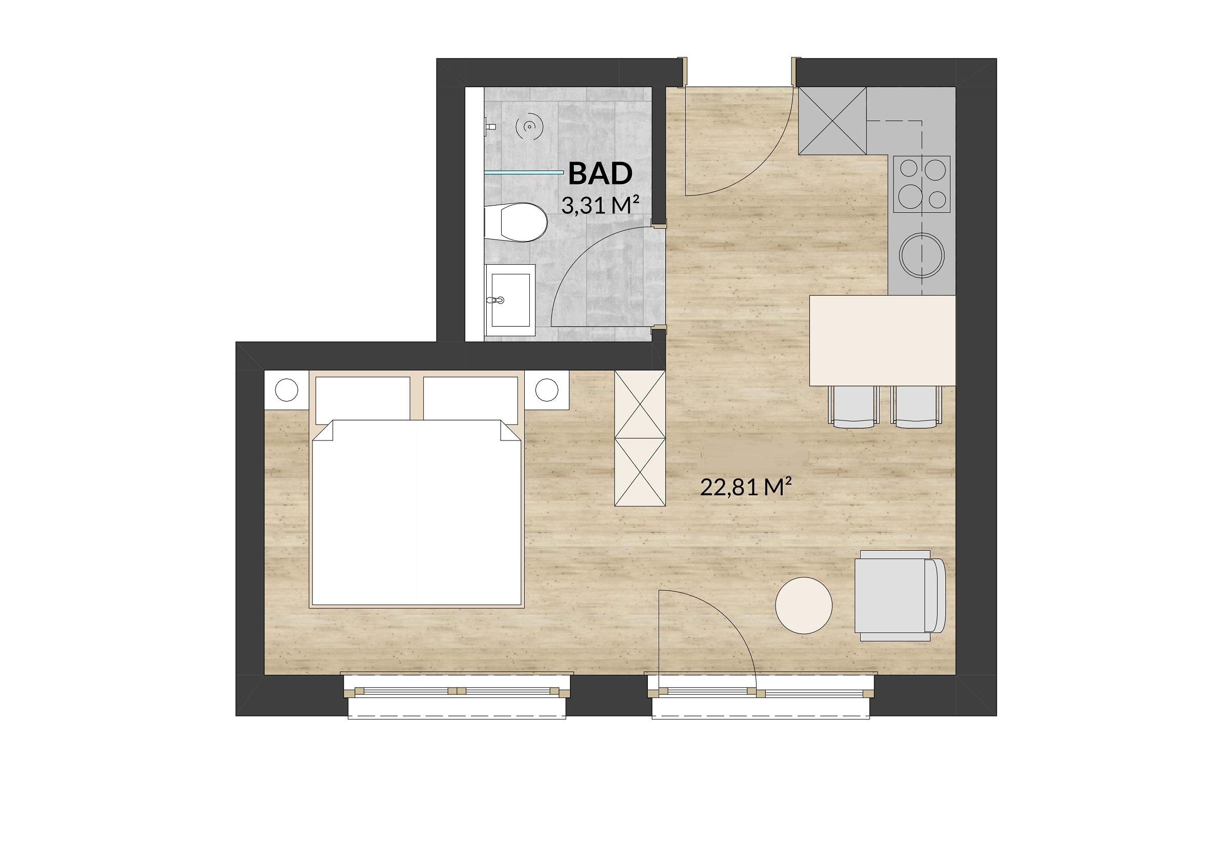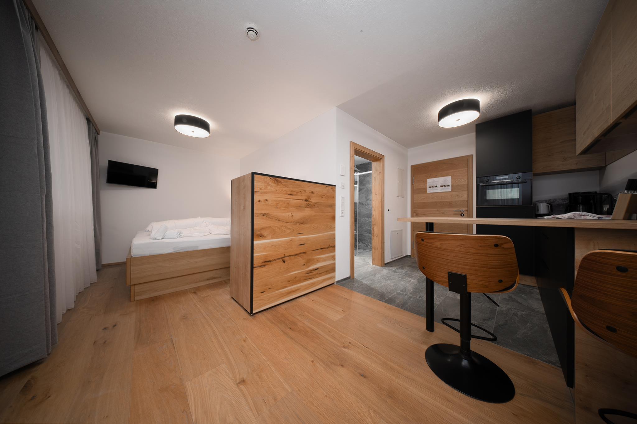 Studio Top 2 mit ca. 27 m² und einer Terrasse: Wohn- Schlafraum mit 1 Doppelbett, volllausgestatteter Kücke mit Cerankochfeld, Kombi-Backrohr, Geschirrspül- und Kaffeemaschine, Kühlschrank, Kaffeemaschine, gemütlichen Esstisch, Sitzbereich uvm.; 1 Badezimmer mit Dusche/WC.