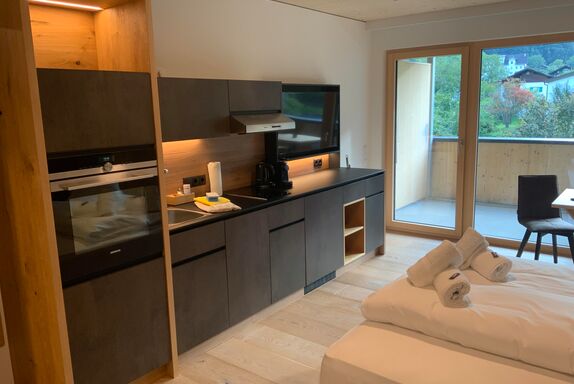 Als Alleinurlauber oder Paar kommen Sie in den vollen Genuss aller Vorzüge moderner Appartements, mit eigener Garderobe, Kabel-Smart-TV und Pkw- bzw. Fahrradabstellplatz. Als kleines, aber mehr als feines Extra sind sie ausgestattet mit einem möblierten Balkon, auf dem Sie bei einem prickelnden Kaltgetränk die Sonne hinter den Bergen untergehen sehen können.