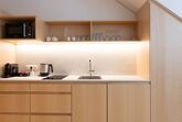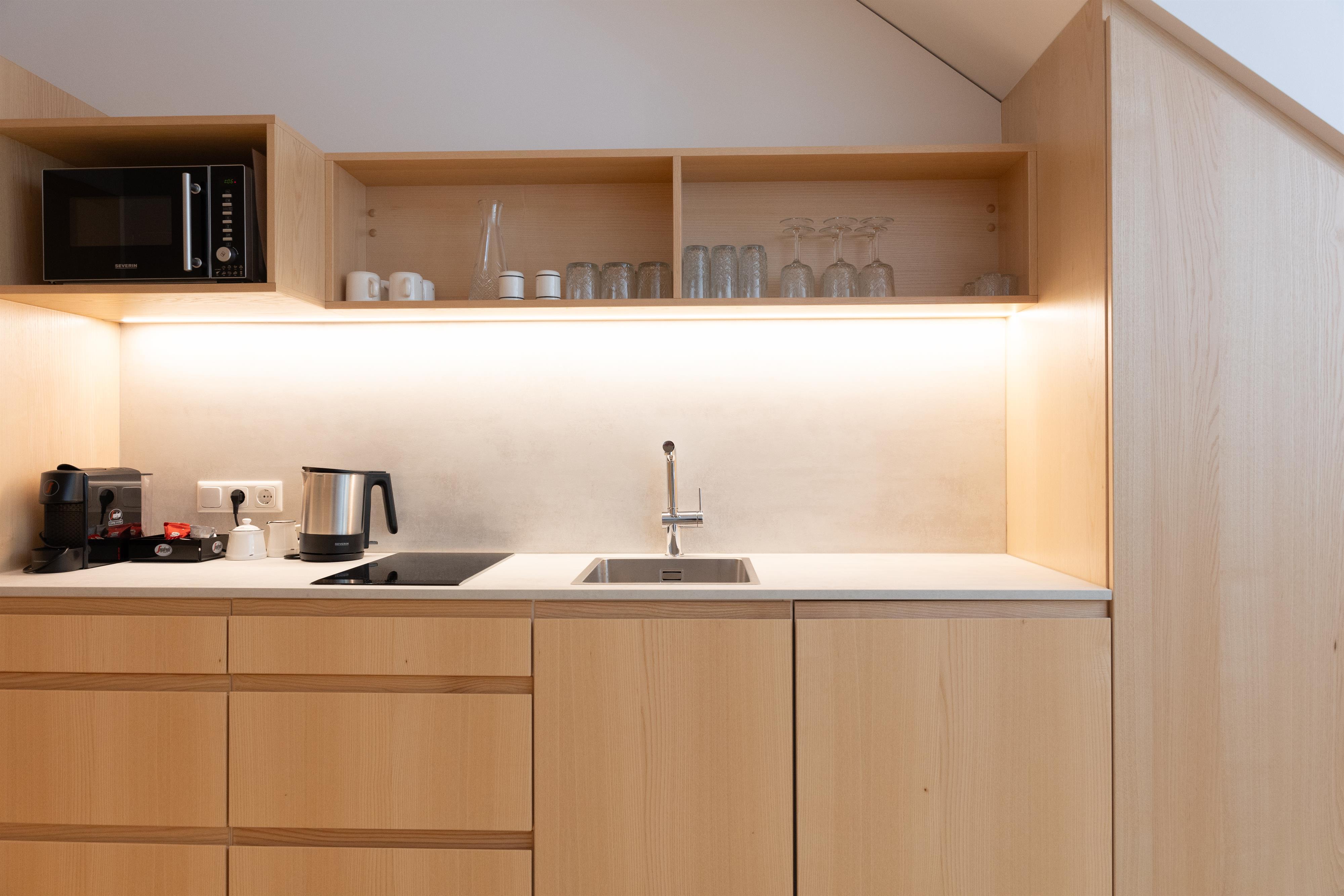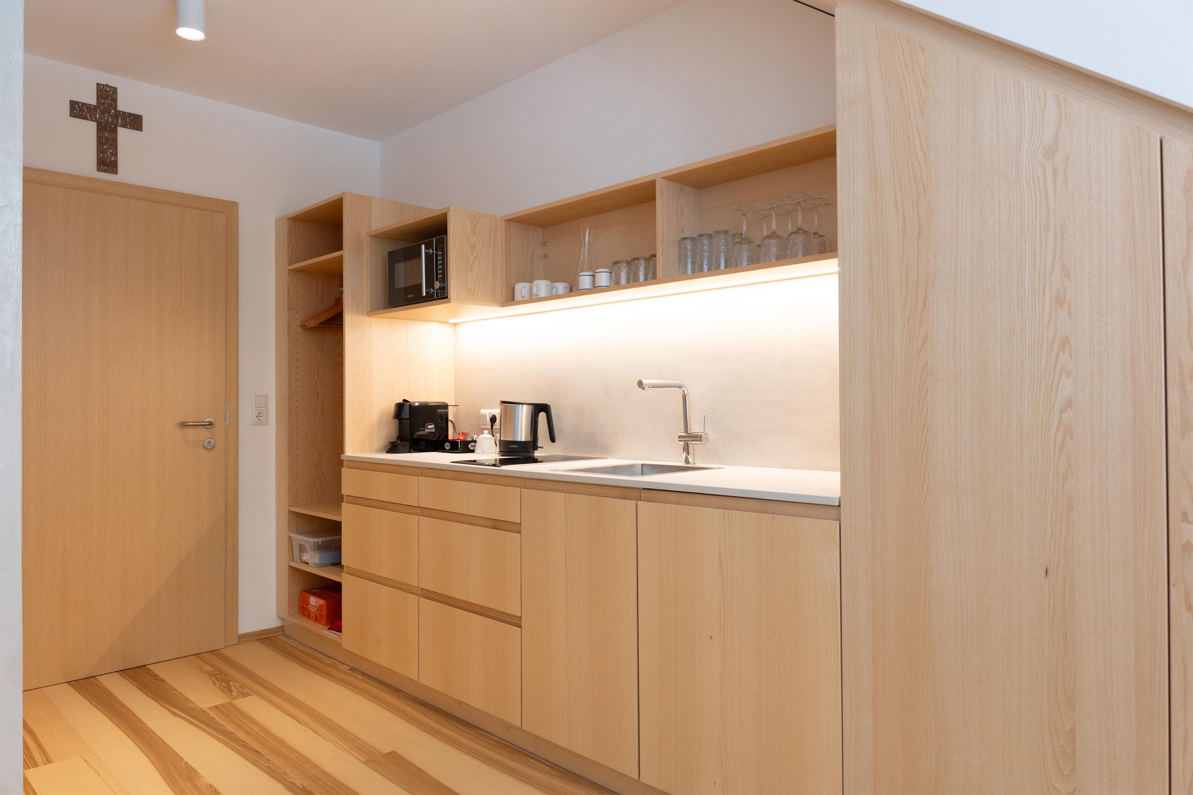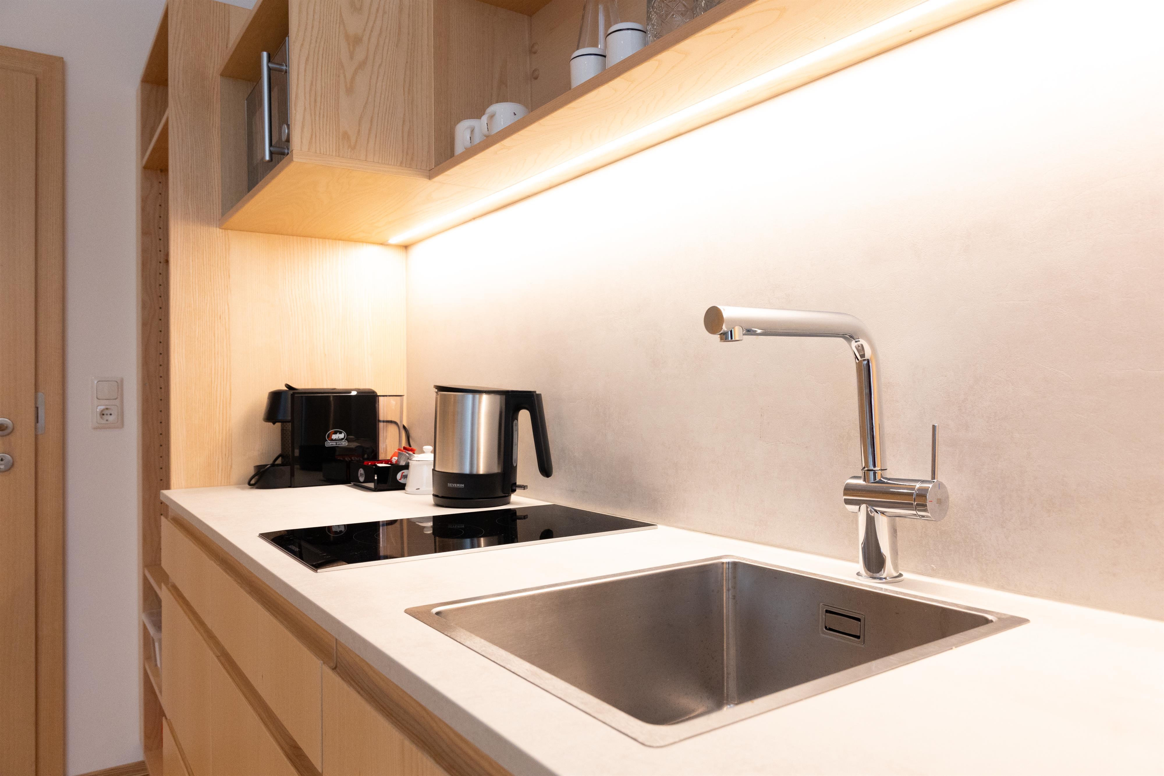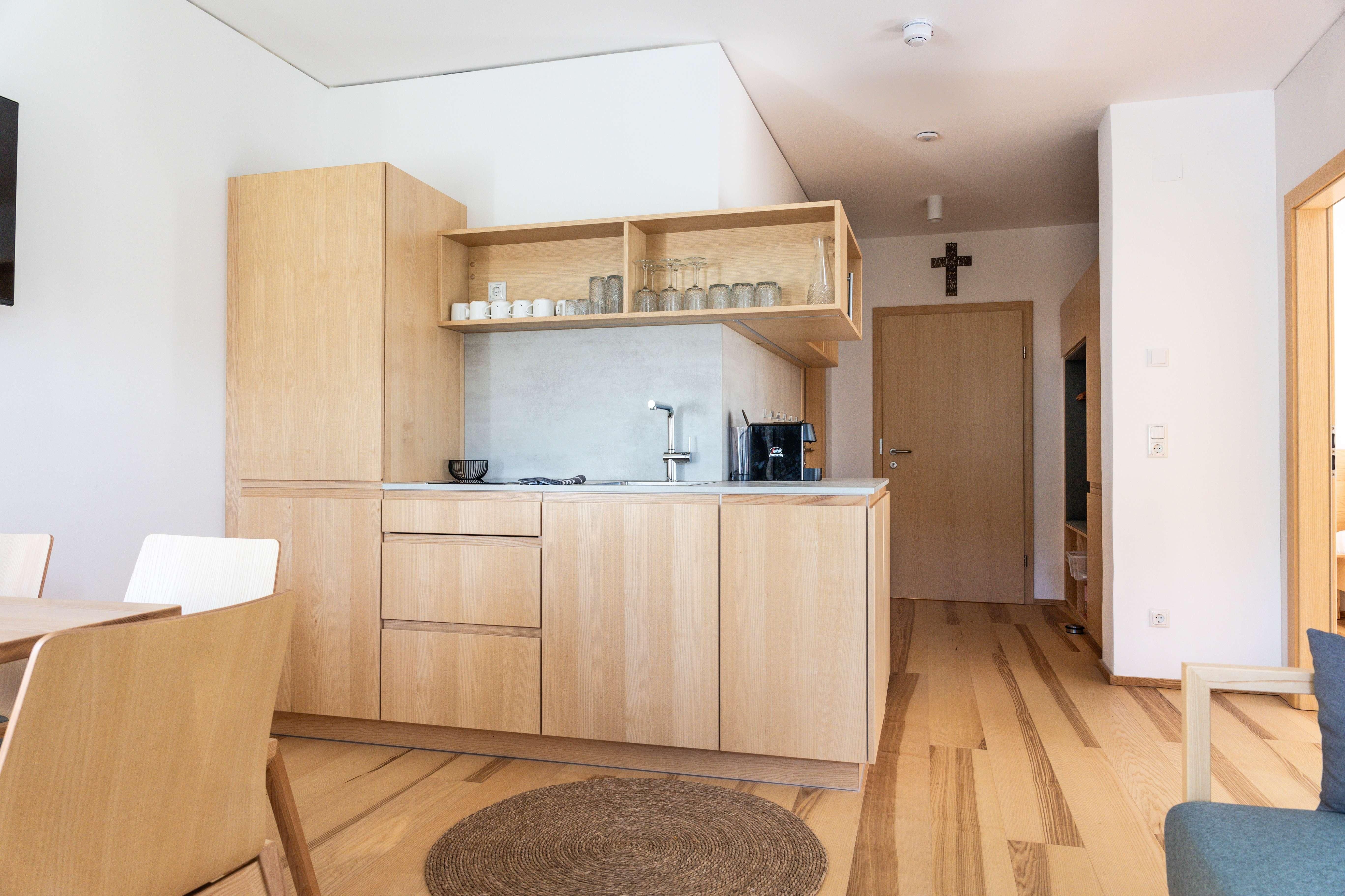 Die Ausstattung der Apartments lässt keine Wünsche offen. In den großzügigen Küchen kannst du dich bequem selbst versorgen, und im Vorraum findest du hausgemachte Gerichte in Kühlschränken, die du in deinem Apartment erwärmen kannst. Außerdem findest du im Kühlschrank in den Appartements einige Erfrischungen, die bereits für dich vorbereitet wurden!