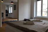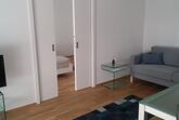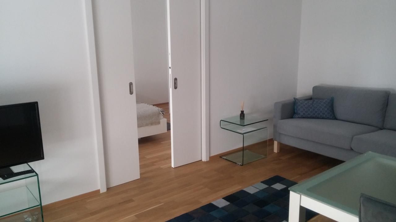 Innen beeindruckt die Wohnung durch ihre clevere Raumaufteilung und die zeitgemäße, neue Möblierung, die ein sofortiges Gefühl von „Zuhause“ vermittelt. Sie umfasst einen großzügigen Wohn-Essbereich, der durch eine Schiebetür vom Schlafzimmer getrennt werden kann. Für Unterhaltung und Konnektivität ist mit einem Flachbildschirm und WLAN bestens gesorgt.