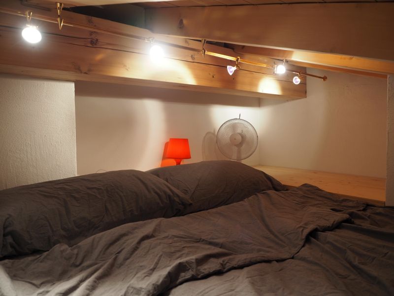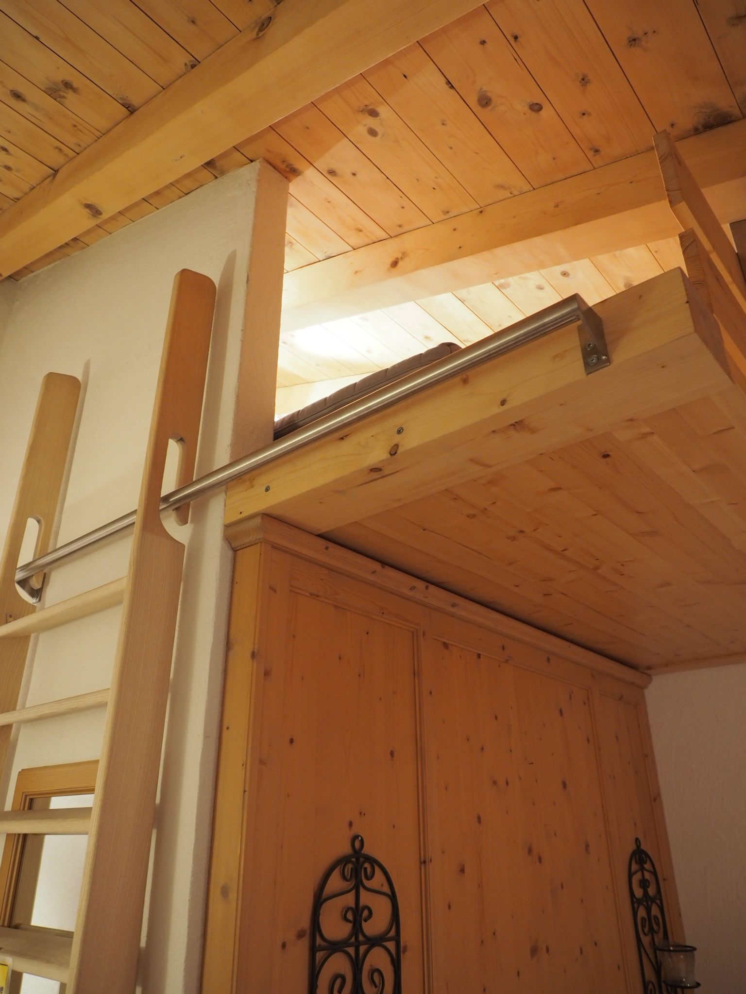 Über eine Leiter ist eine weitere Schlafmöglichkeit auf der Galerie für 2 Personen erreichbar, Bettgrösse 2.00 x 1.60 Meter. Im Wohnzimmer befindet sich ein Bettsofa mit Federkernmatratze, 2.10 x 1.20 Meter. Ein Babybett steht ebenfalls zur Verfügung.