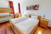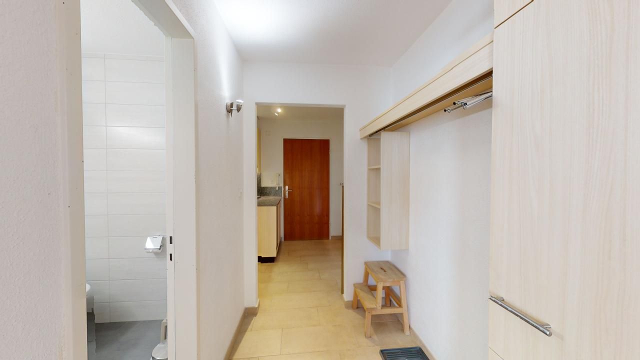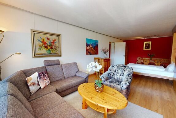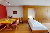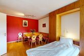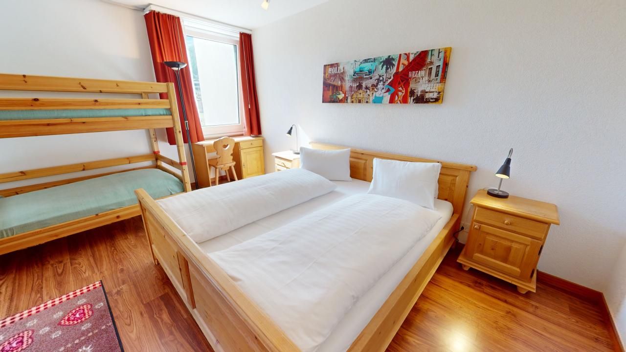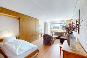 Grosszügige, helle 2.5 - Zimmer - Ferienwohnung im Hochparterre. Eingang mit renovierter Küche. Wohn- /Esszimmer mit 2 eingebauten Schrankbetten 80 x 200. Separates Doppelschlafzimmer mit zusätzlichen Kajüttenbetten. Überdachter Balkon. Renoviertes Badezimmer mit Dusche/WC. Im Ferienhaus befindet sich ein Lift. 1 Parkplatz in Garagenbox. Fitnessraum zur öffentlichen Nutzung befindet sich im Ferien-Wohnhaus.