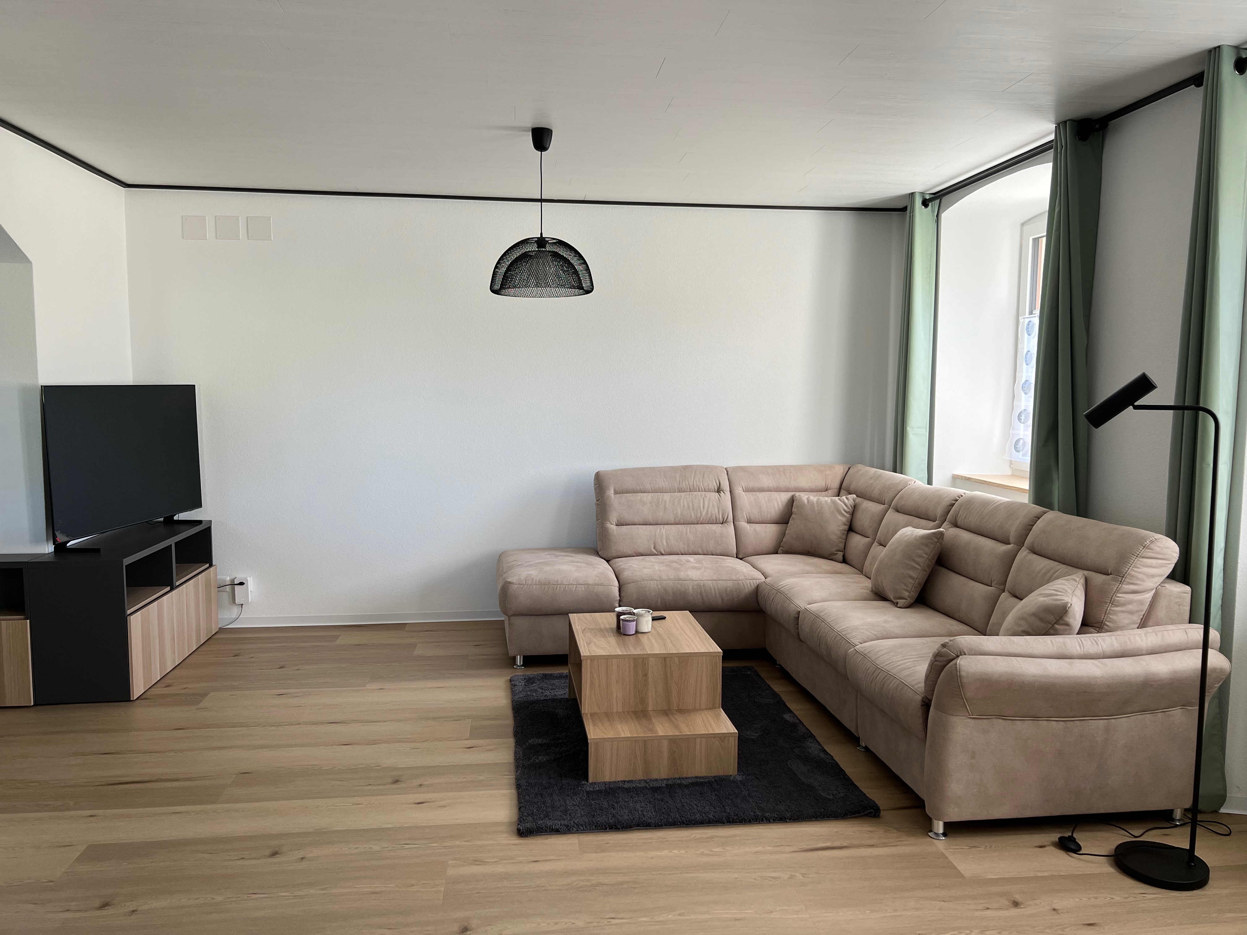 Wohnzimmer mit grossem Sofa und Flachbildschirm-TV; Essbereich für sechs Personen;