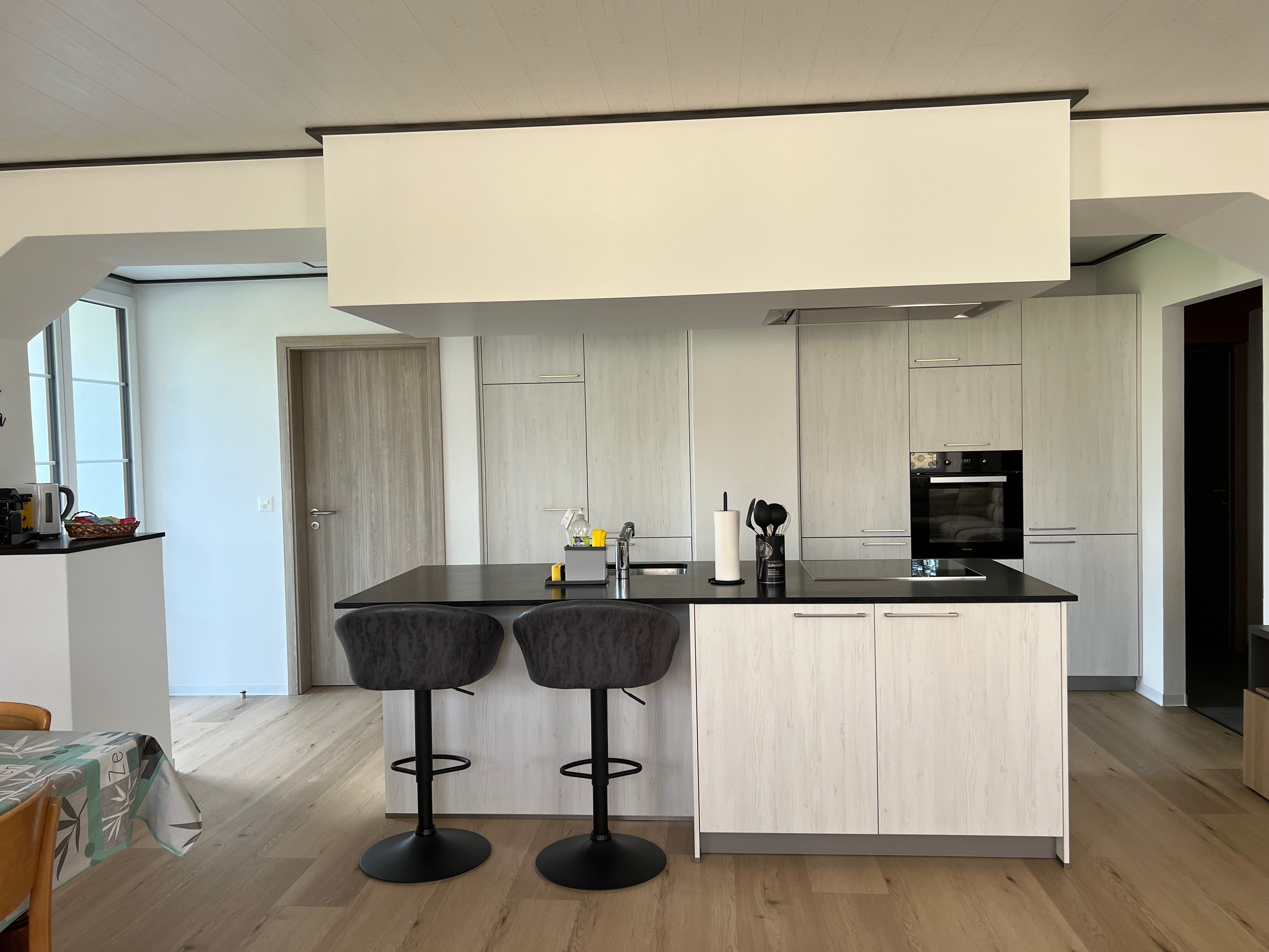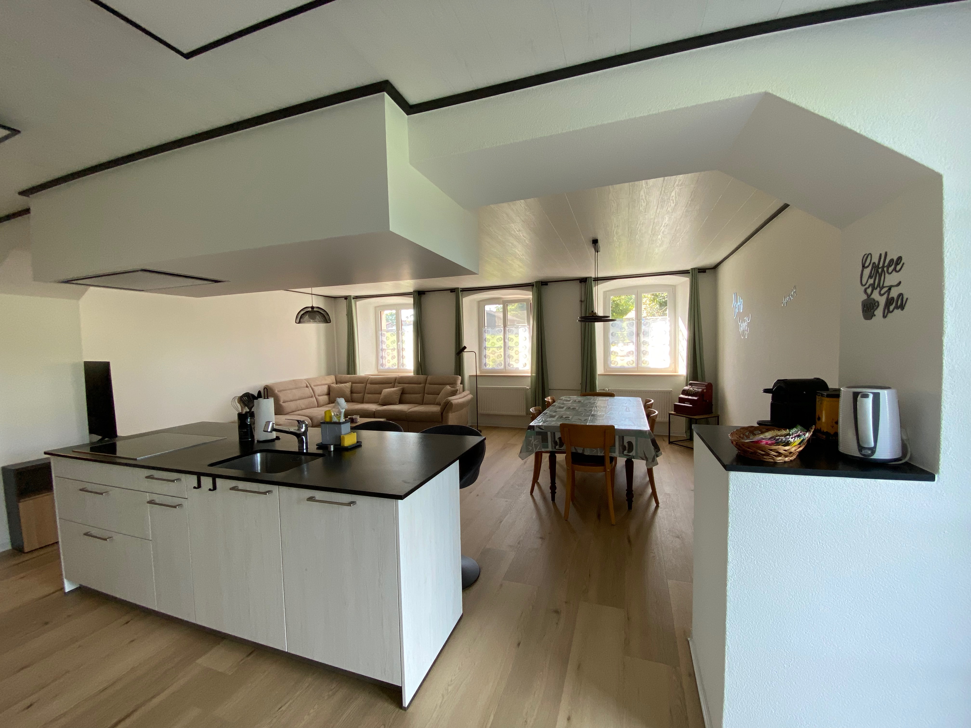vollständig ausgestattete, zu Wohn- und Essbereich offene Küche mit Backofen, Mikrowelle, Kochherd, Geschirrspüler, Toaster, Fondue- und Raclette-Set, Nespresso-Kaffeemaschine, Wasserkocher, Küchentüchern;