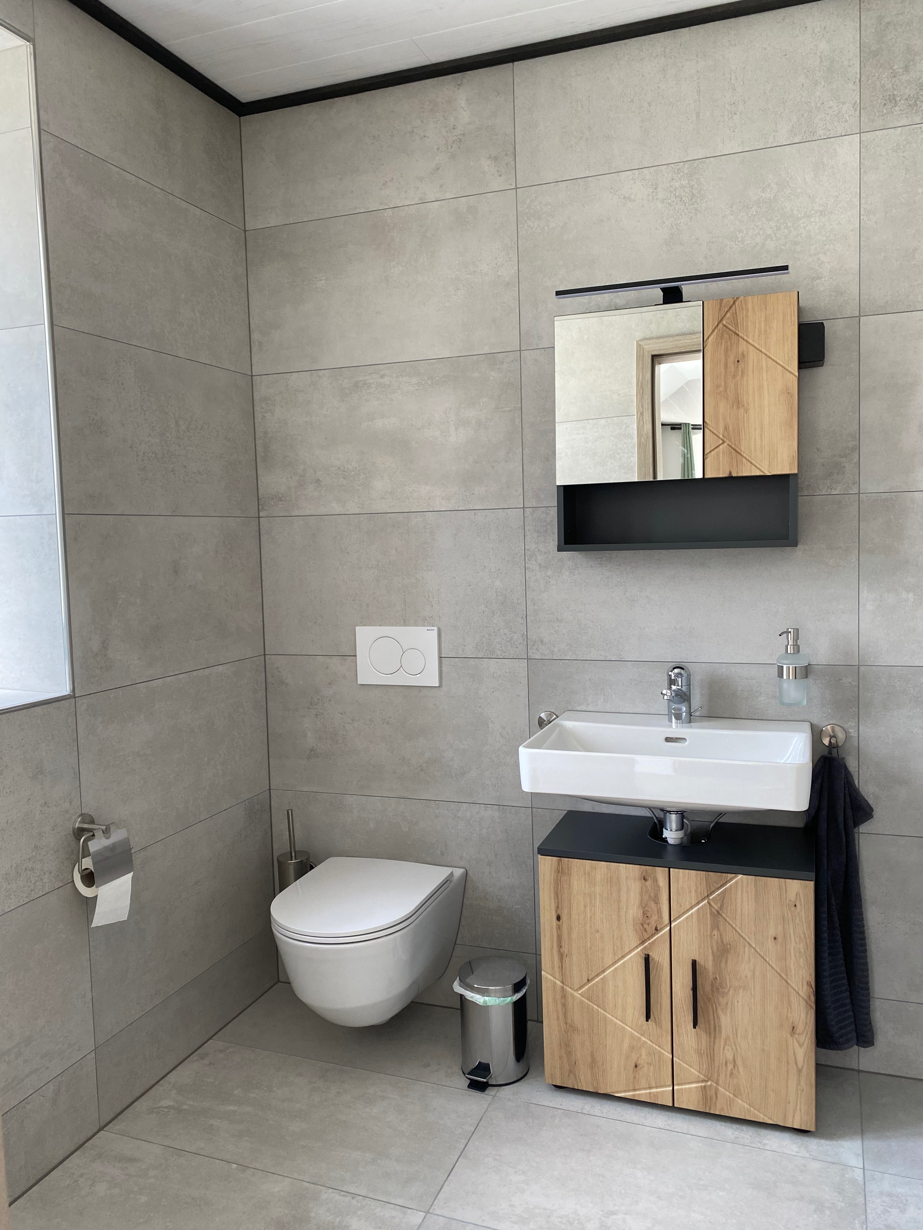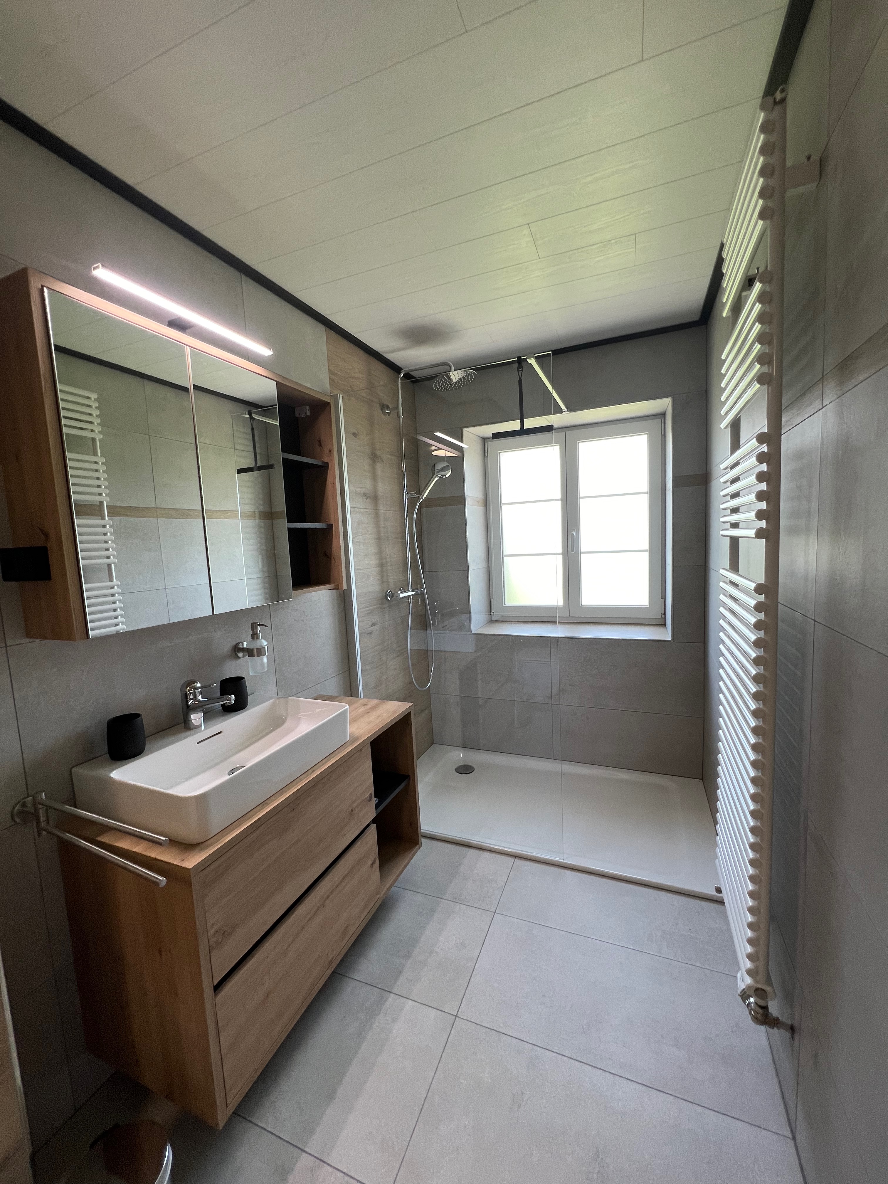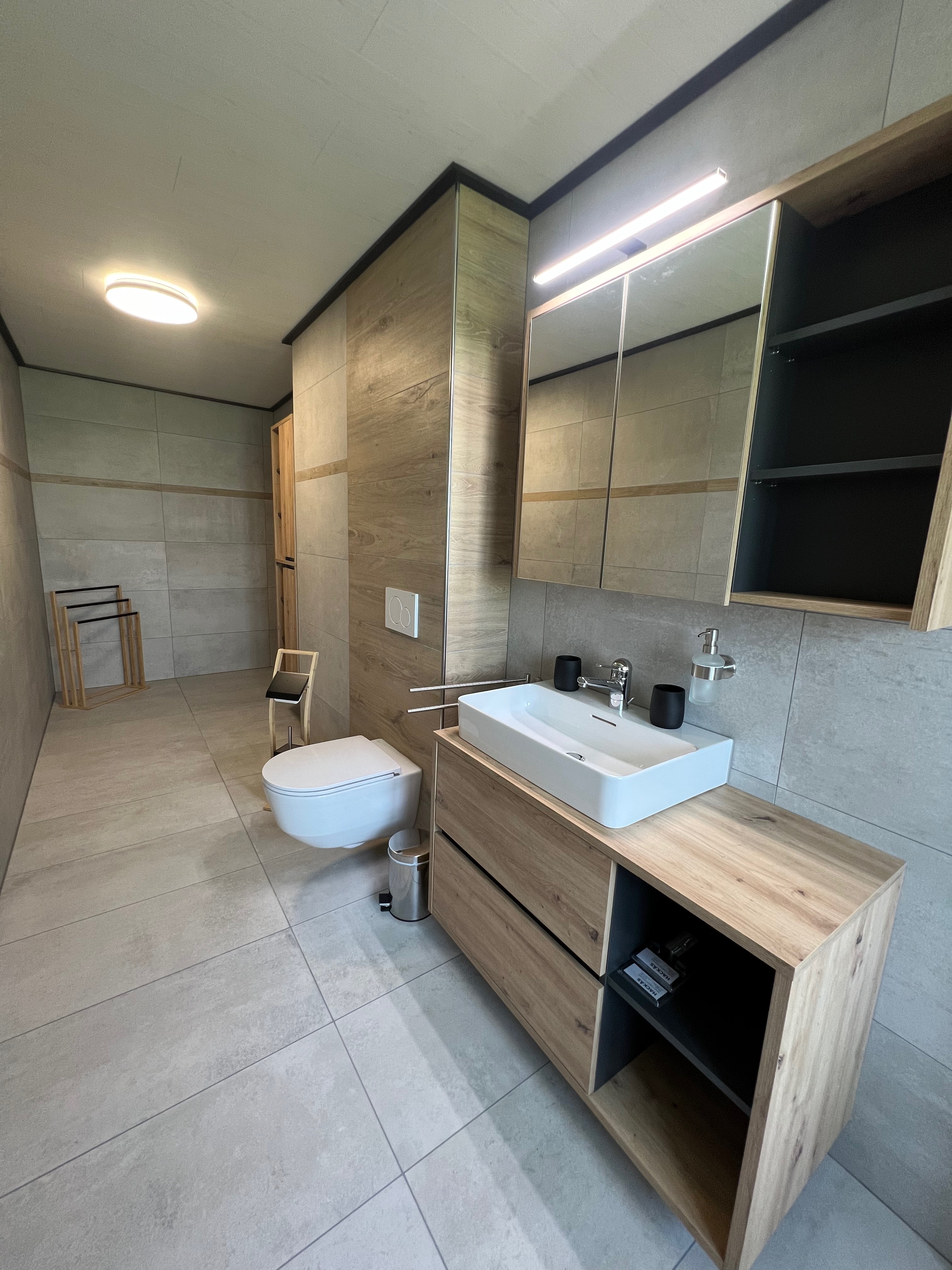 1 grosses Badezimmer mit WC, Lavabo, Dusche 160x90, Haarföhn, Handtuchhalter und Frotteetüchern.