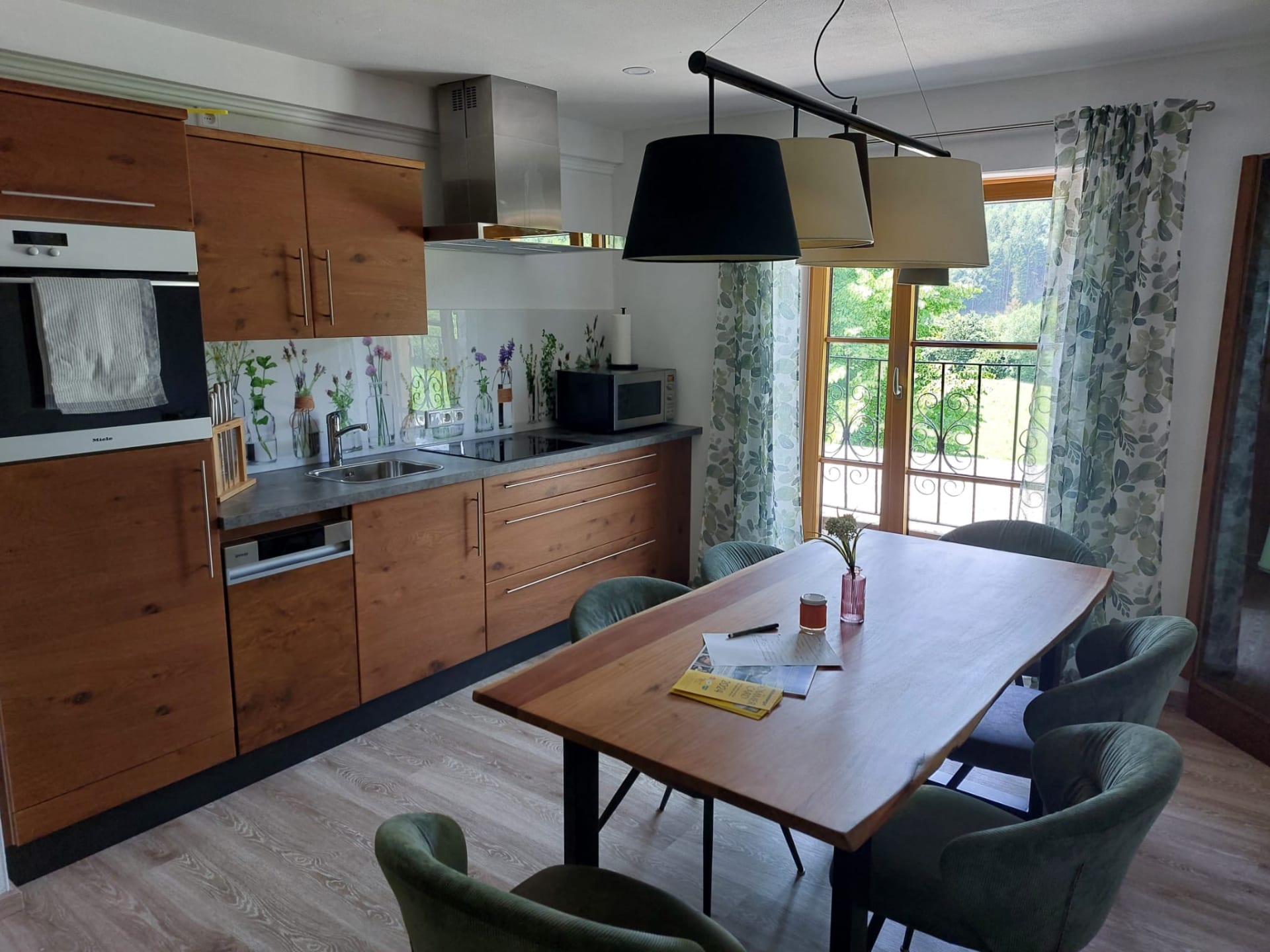 • Küche mit Geschirrspüler, Kaffeemaschine, Mikrowelle, Couch, Esstisch,