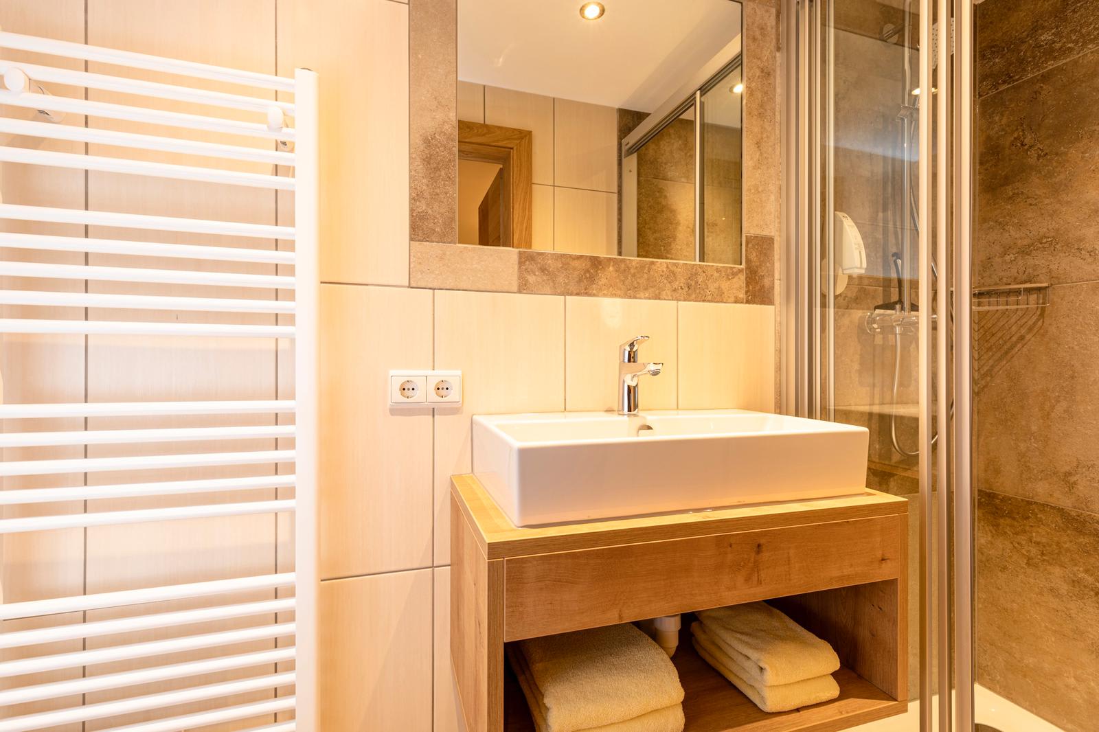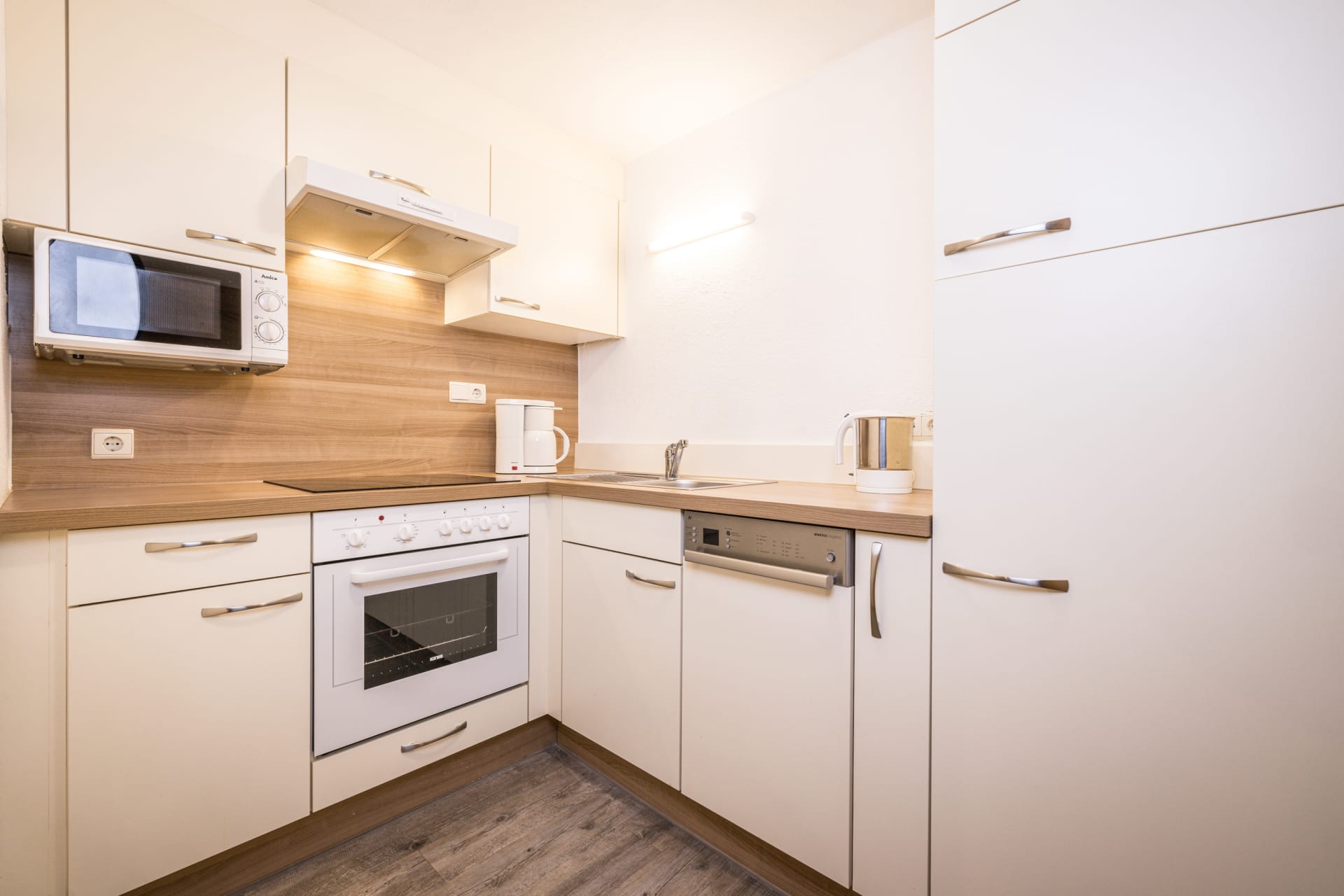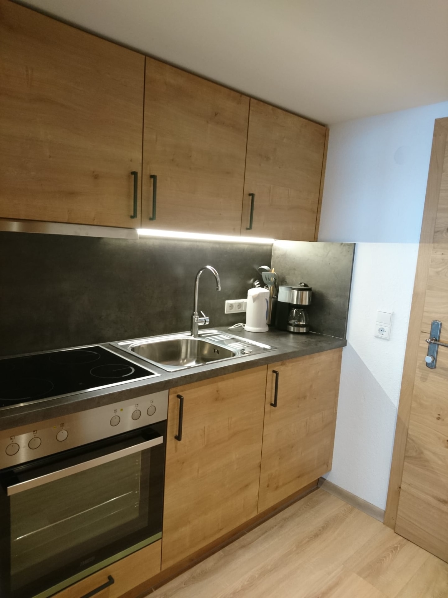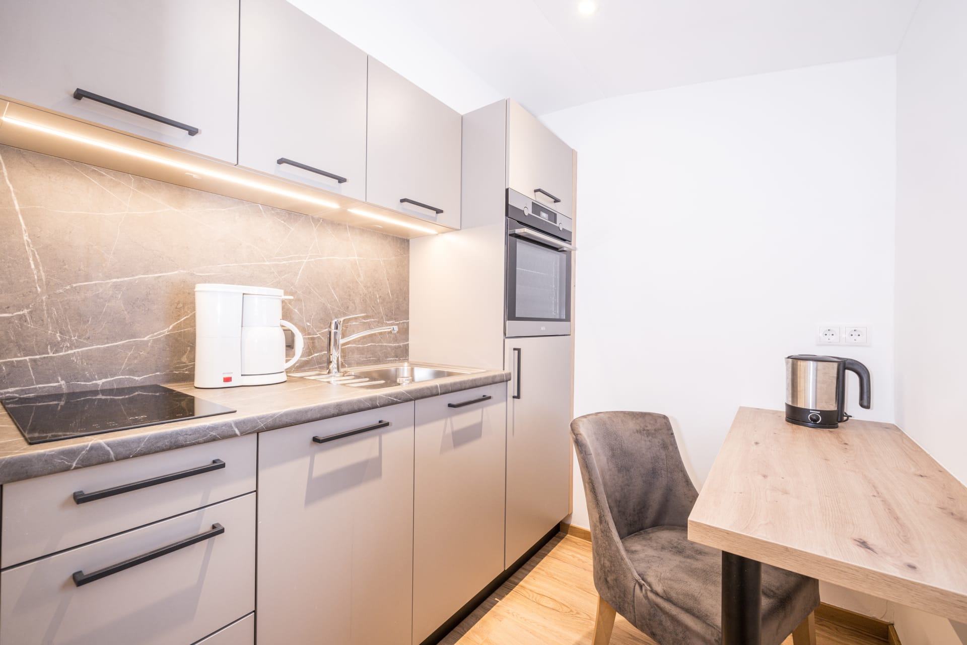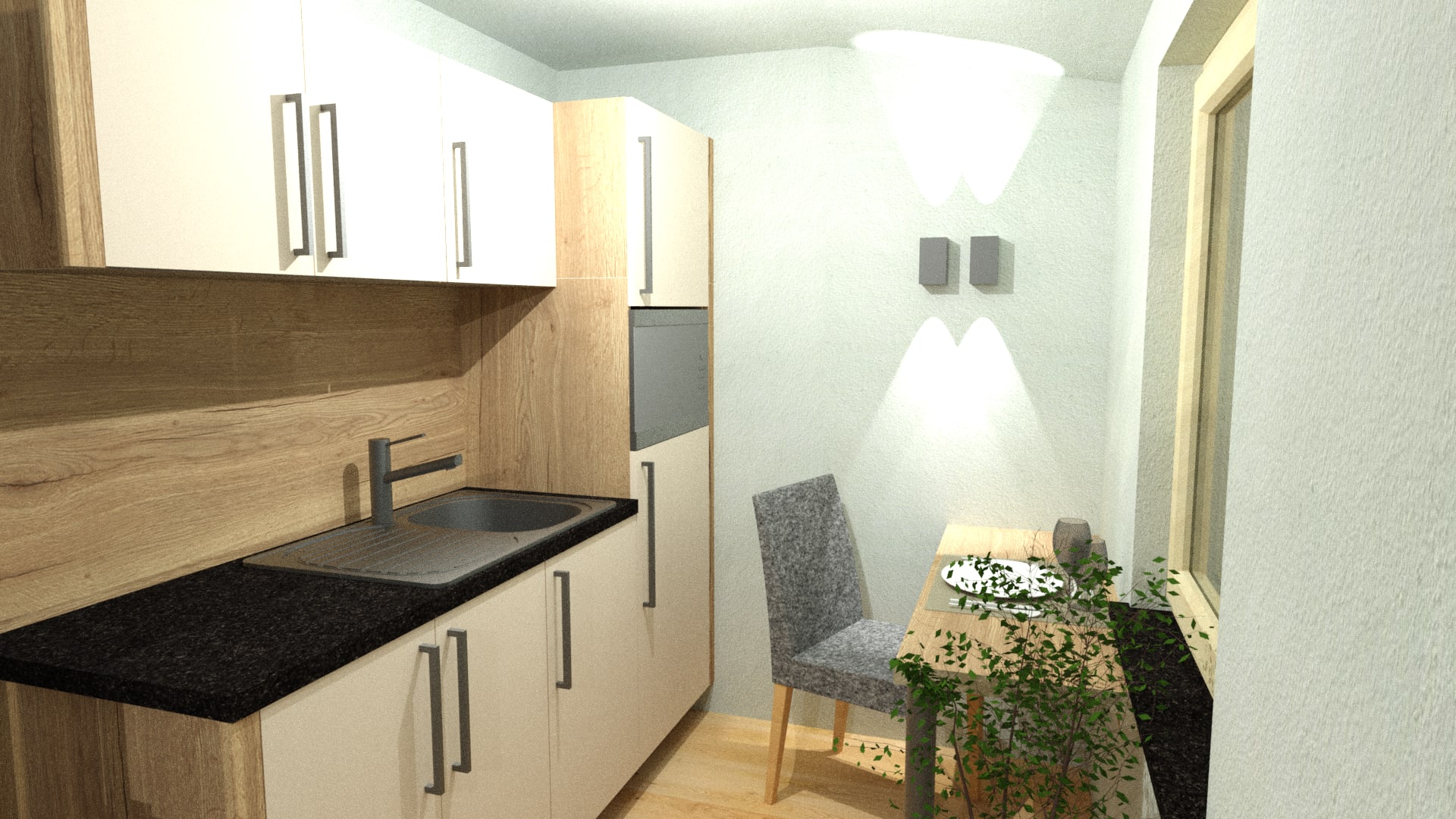 Kleines gemütliches Appartement mit gut ausgestatteter Küchenzeile, Essecke, Schreibtisch, Dusche und WC, Fön, Handtücher, Naturpflegeprodukte, Flat-TV, und freie W-Lan Benützung.