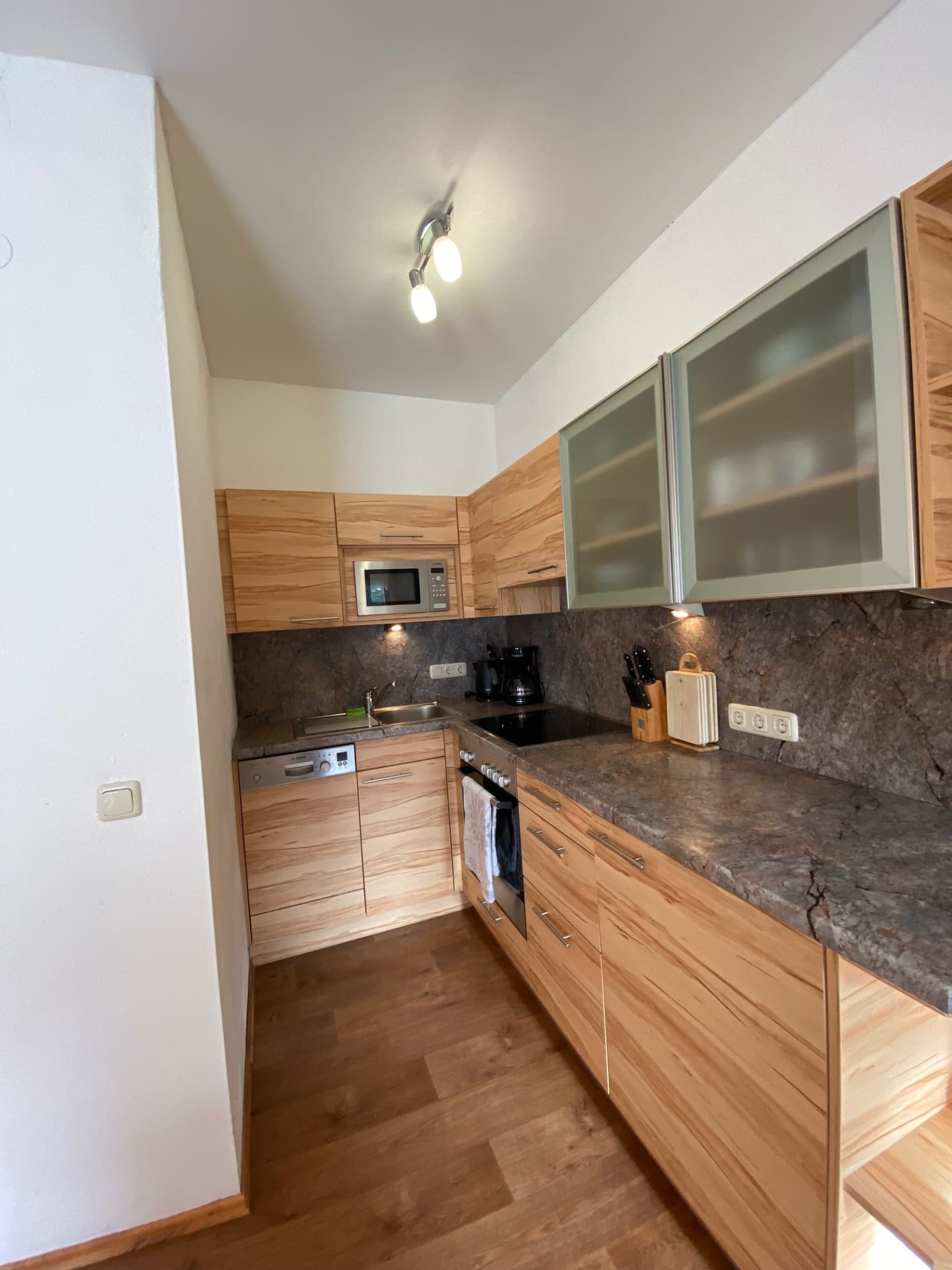 • Moderne, voll ausgestattete Küche mit Kühlschrank inkl. Tiefkühlfach, Geschirrspüler, E-Herd, Backofen, Mikrowelle, Kaffeemaschine und Wasserkocher.