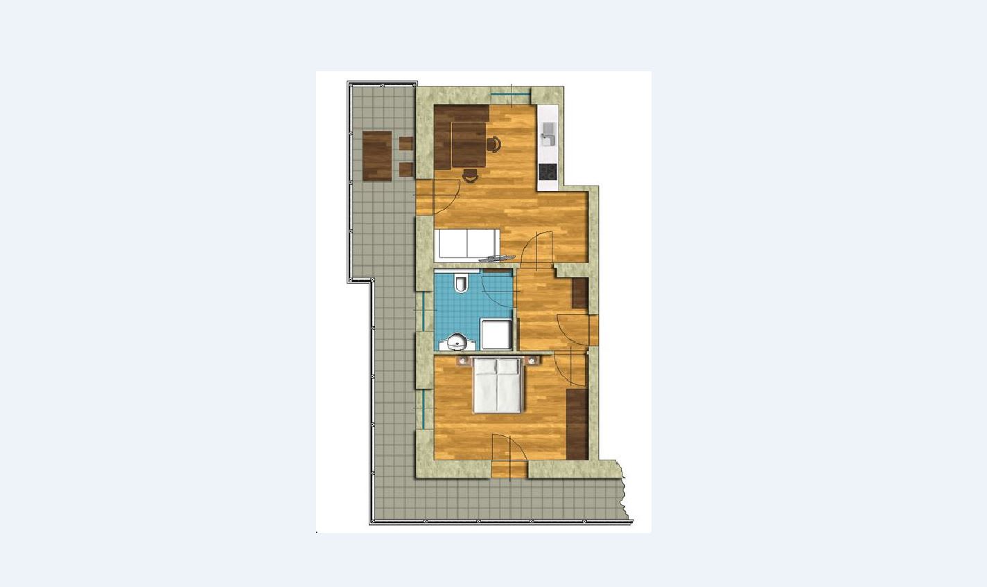 Die kleine, feine Ferienwohnung für Genießer befindet sich im 1. Obergeschoss und ist ca. 37m² groß. Sie besteht aus einem Vorraum, einem Schlafzimmer mit Balkonzugang, einer vollausgestatteten Wohnküche mit Balkon und einem Bad mit WC.