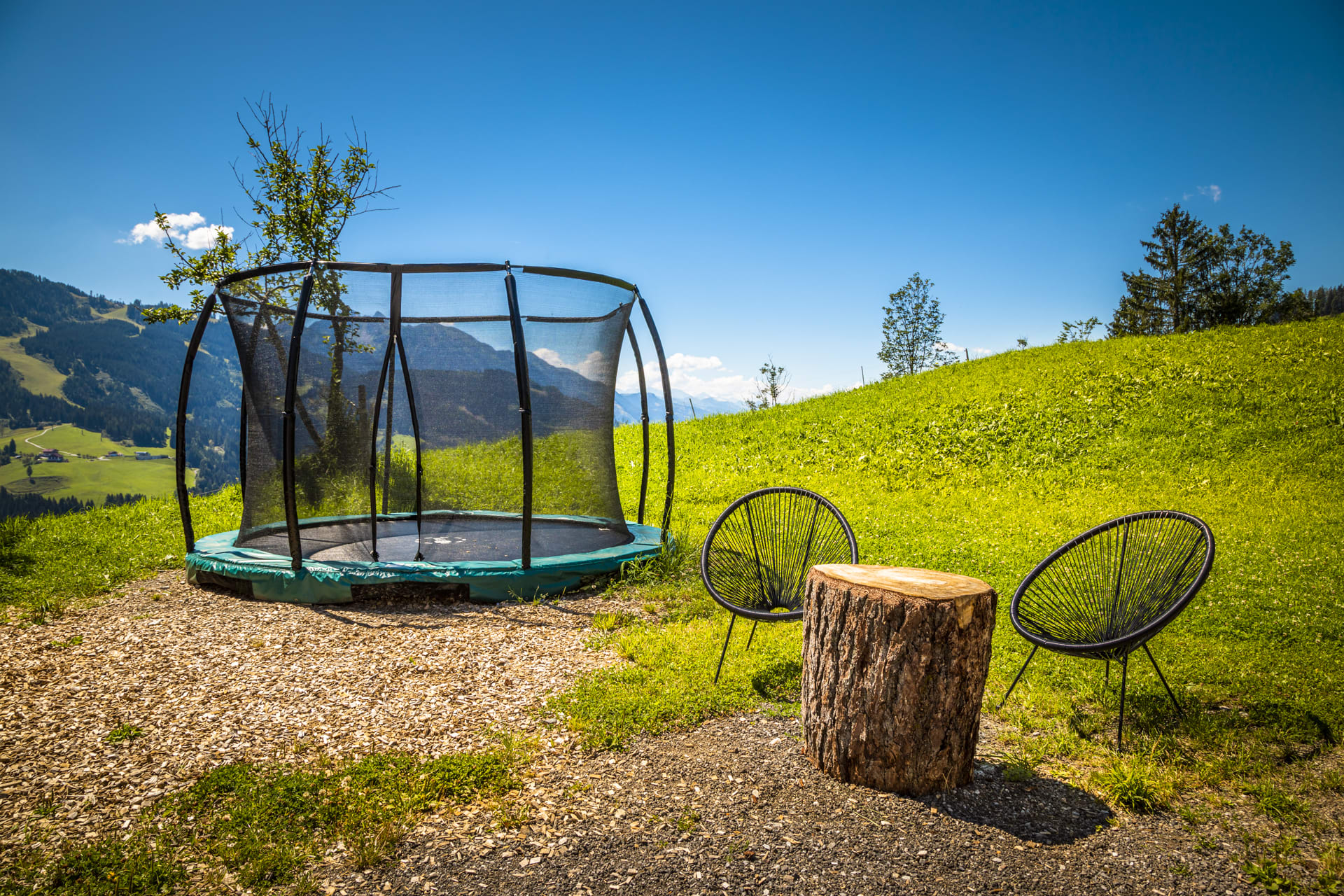 Eigene Terrasse mit Grillmöglichkeit und Spielplatz mit Schaukel, Rutsche, Sandkiste und Trampolin.