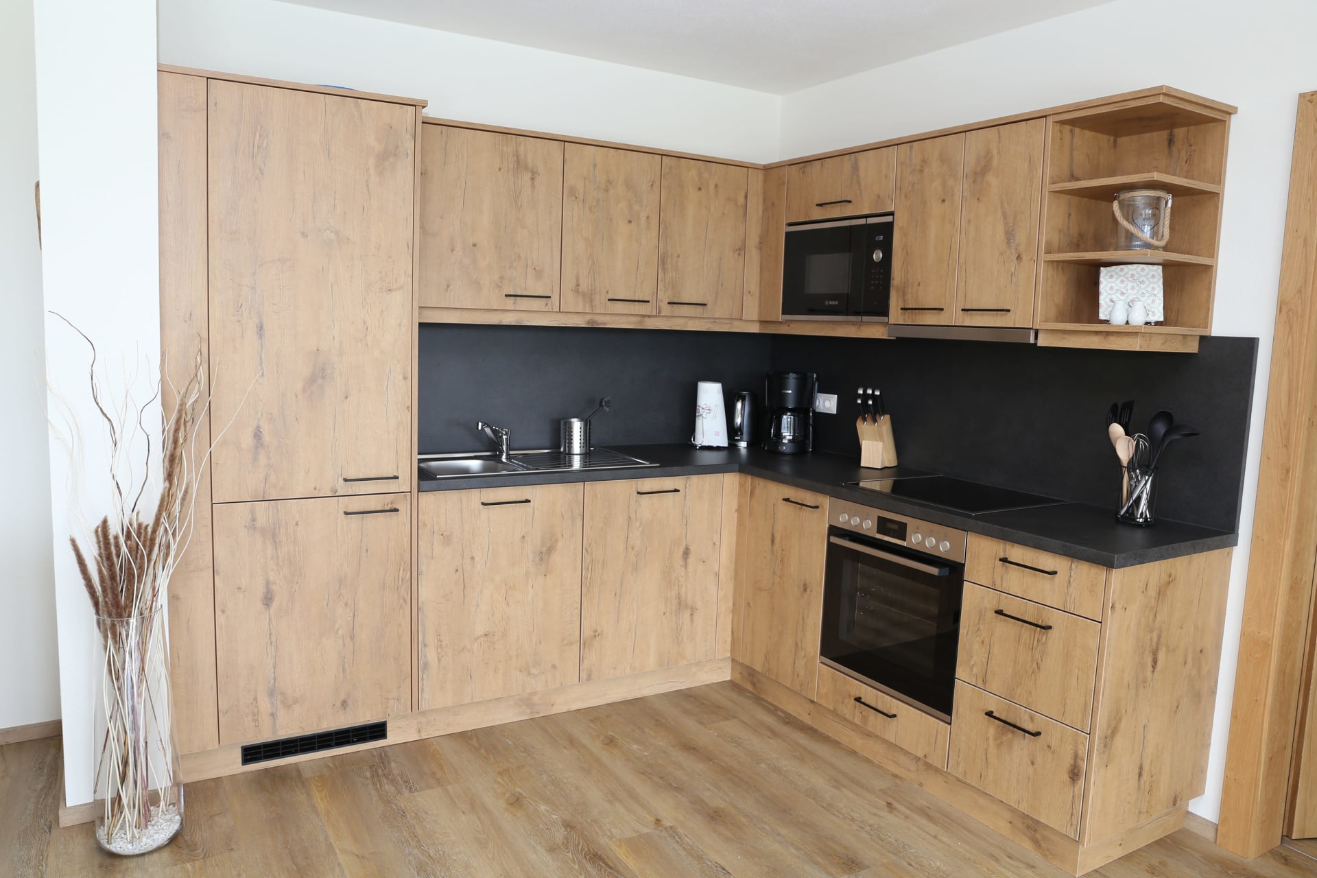 Voll ausgestattete Küche (E-Herd, Backofen, Mikro, Geschirrspüler, Kaffeemaschine, Wasserkocher und Kühl-Gefrierkombi).