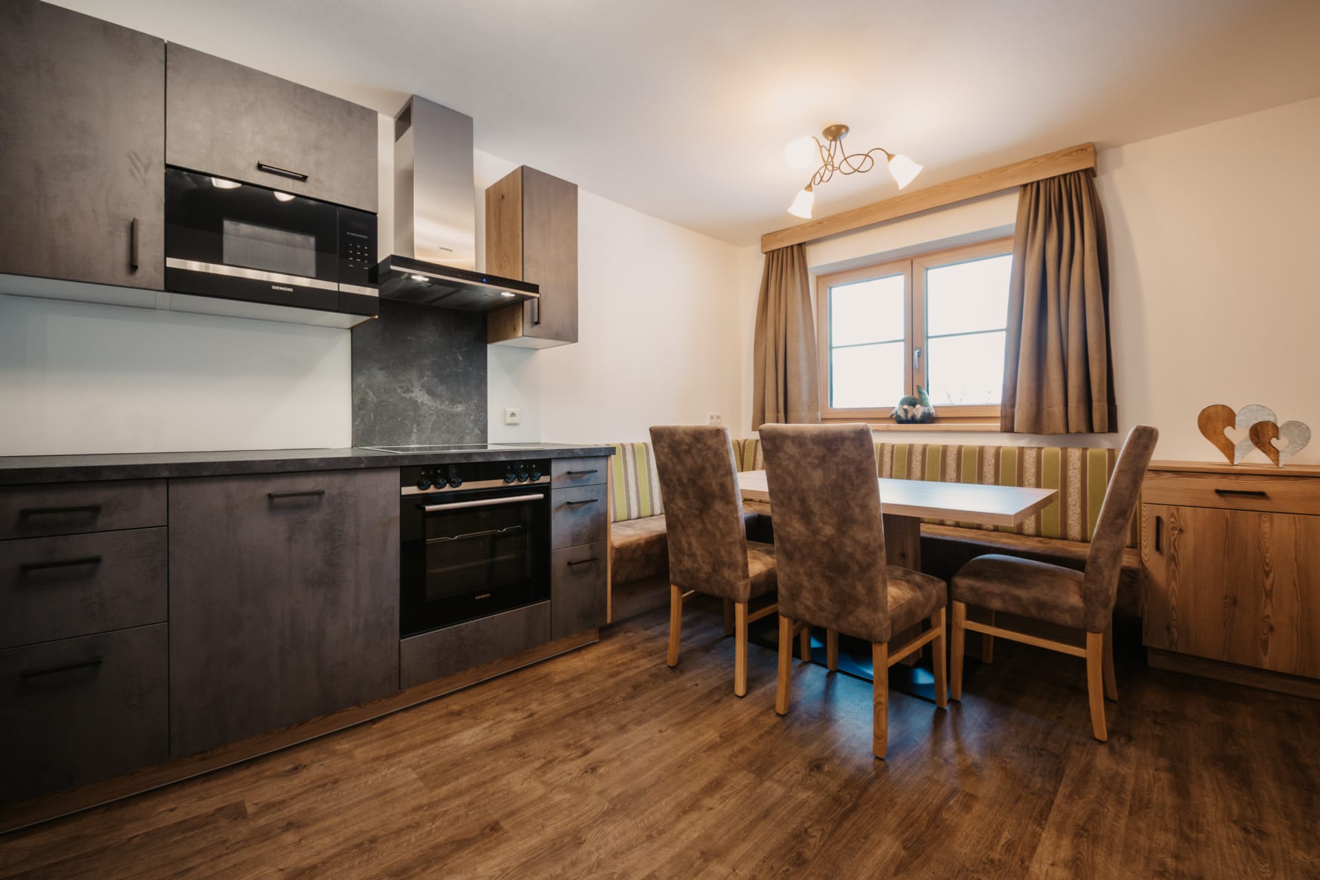 Die voll ausgestattete Küche verfügt über einen E-Herd mit Backrohr, Kühlschrank, Mikrowelle, Kaffeemaschine sowie Geschirr.