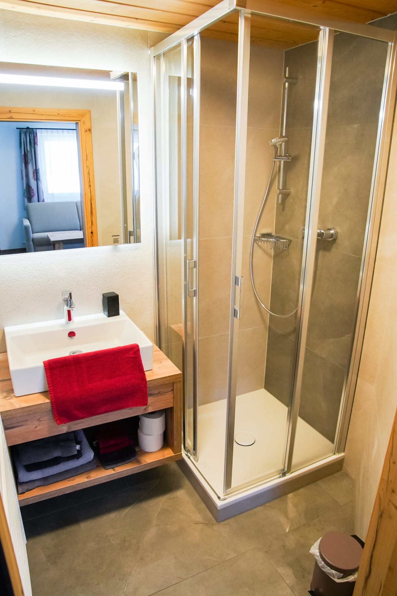 • ein Badezimmer mit Badewanne, Dusche und Waschtisch