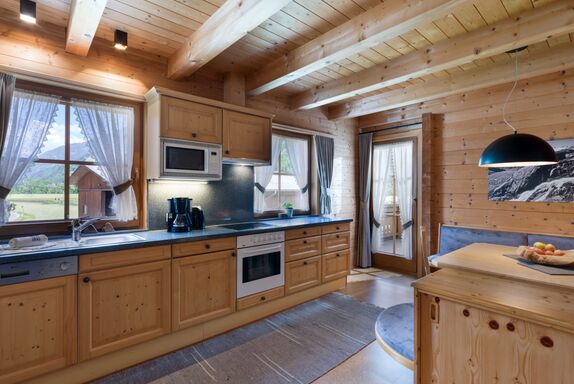 • Wohnküche mit gemütlichem Essbereich, Couch und umfangreicher Küchenausstattung, Ausgang zum Balkon mit Blick auf den Garten