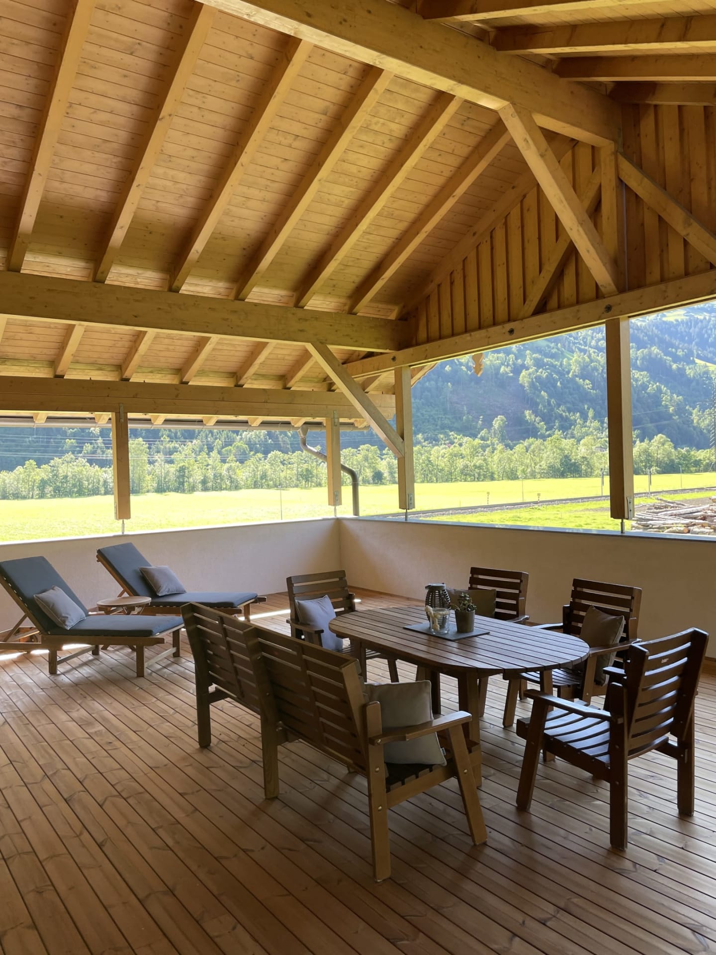 • überdachte Terrasse (60 m²) mit neuem Terrasssenboden, Sonnenliegen & Sitzgarnitur Richtung Süden