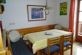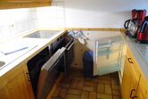 Wohnküche (unten) mit Balkon: Geschirrspülmaschine, Backofen, Cerankochfeld, Mikrowelle, Kühlschrank mit Gefrierfach, zeitprogrammierbare Kaffeemaschine, Toaster, Wasserkocher, Eierkocher, Mixer, ausreichendes Geschirr. Eckbank mit 3 Stühlen, Ottomane mit verstellbarer Lehne (80X200cm), Sat-TV (Flachbildschirm), DVD- und VHS-Player, kleine Stereoanlage.